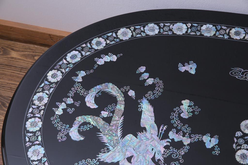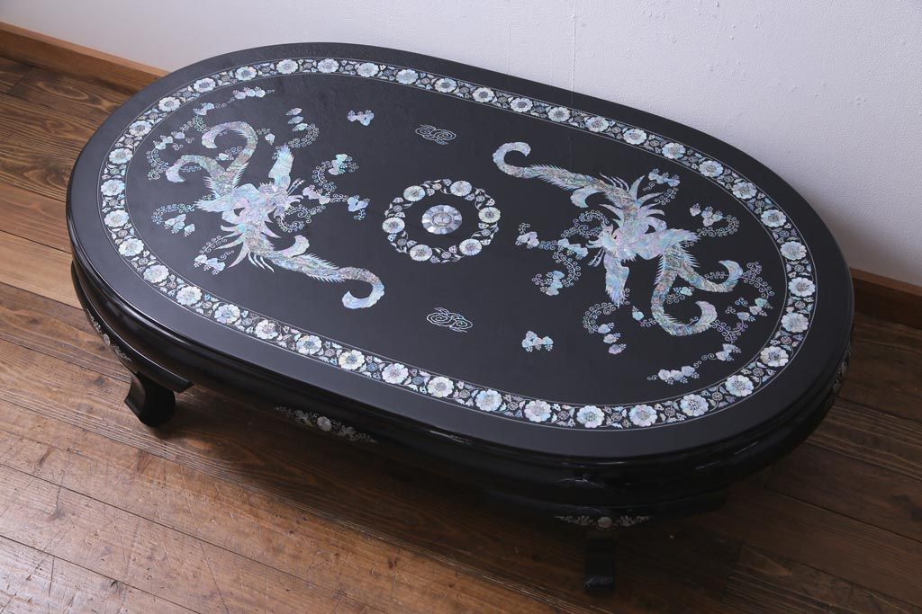 中古 民芸家具 オーバル型 煌びやかな螺鈿細工の座卓(ローテーブル、センターテーブル)(定価約74万円)