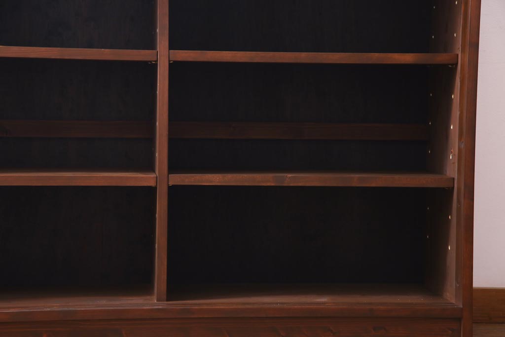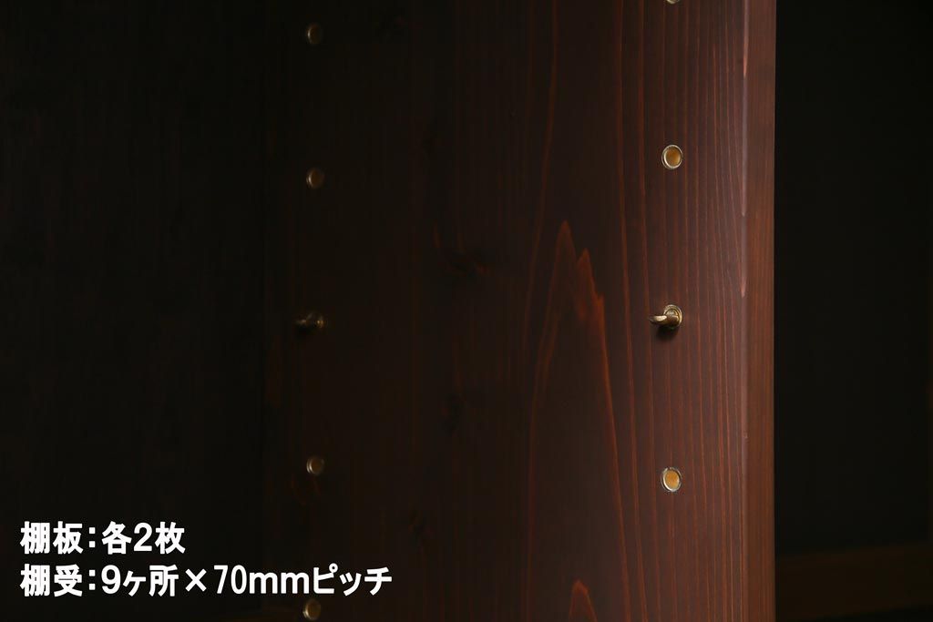 棚板は取り外しできます。棚板は各2枚あります。棚受けは9ヶ所、70mmピッチで調整できます。棚幅サイズのものが1枚の作りです。