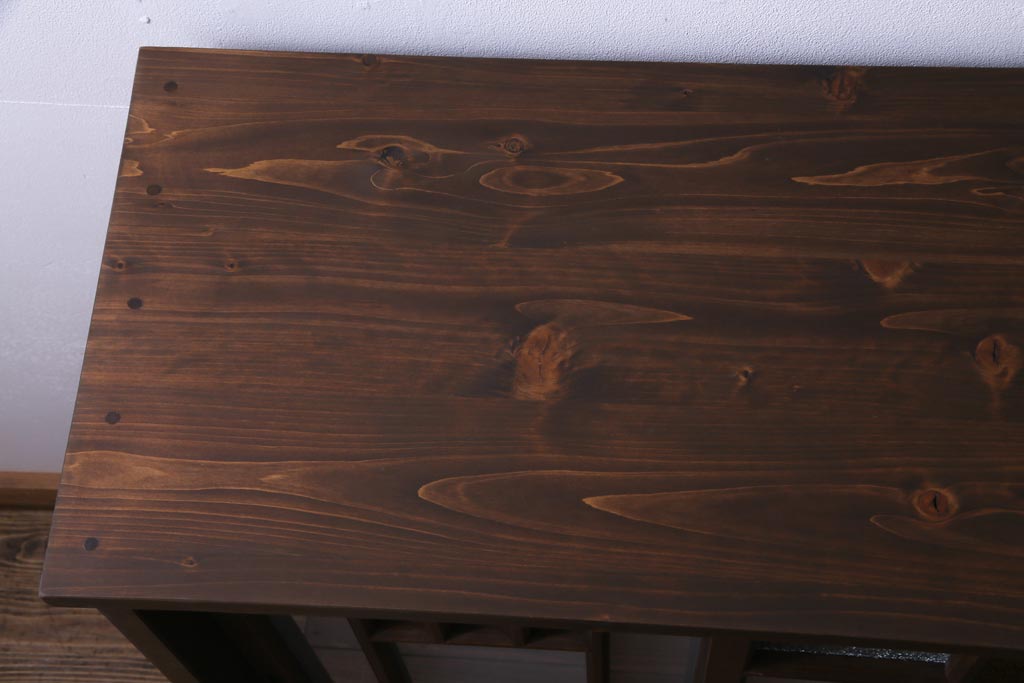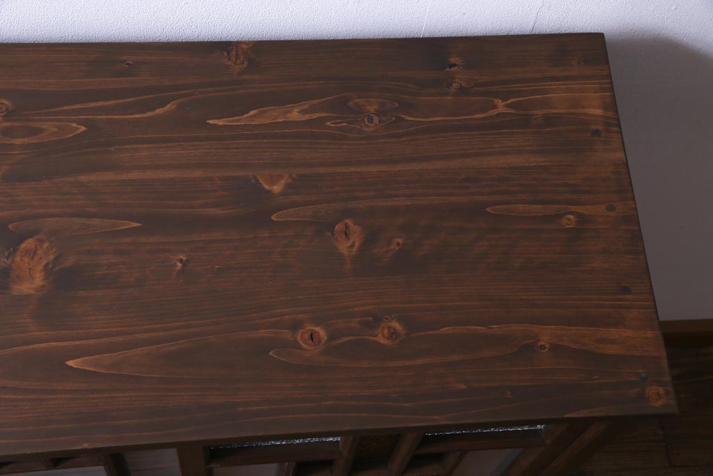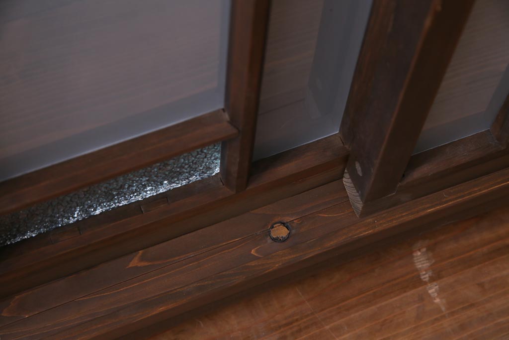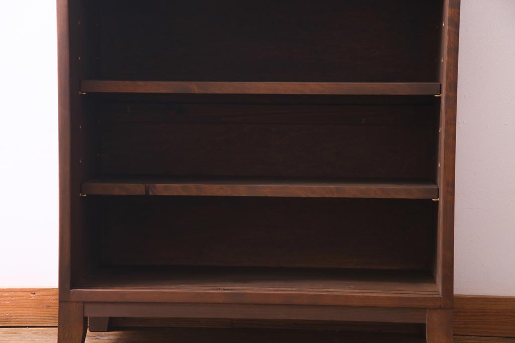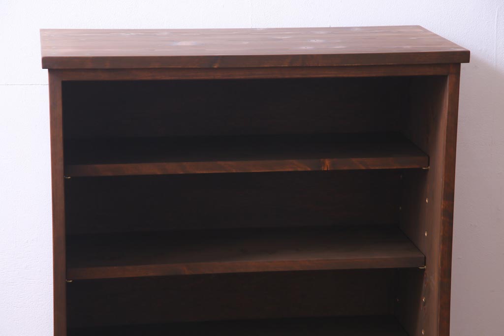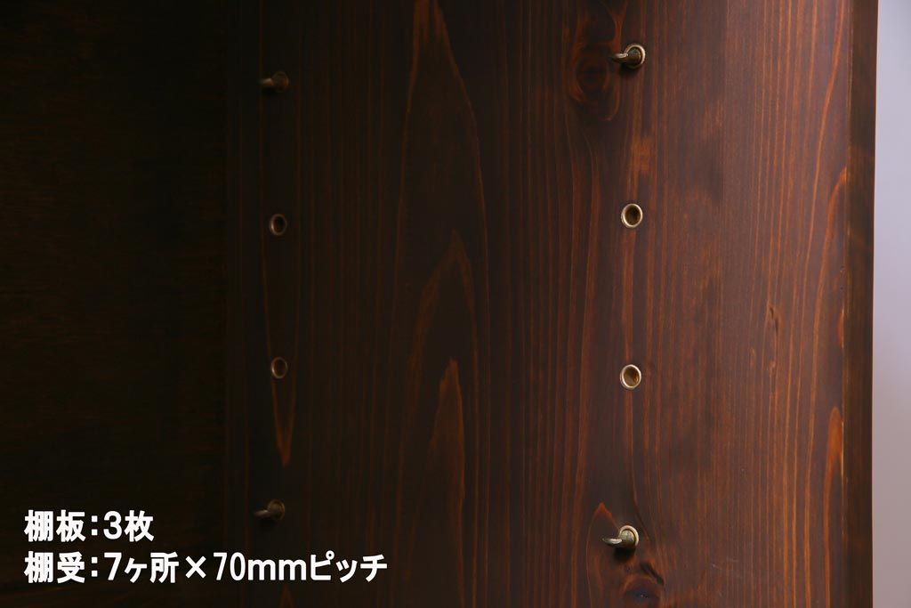 棚板は取り外しできます。棚板は3枚あります。棚受けは7ヶ所、70mmピッチで調整できます。棚幅サイズのものが1枚の作りです。建具はダメージが少なく、アンティーク品として高品質なお品です。