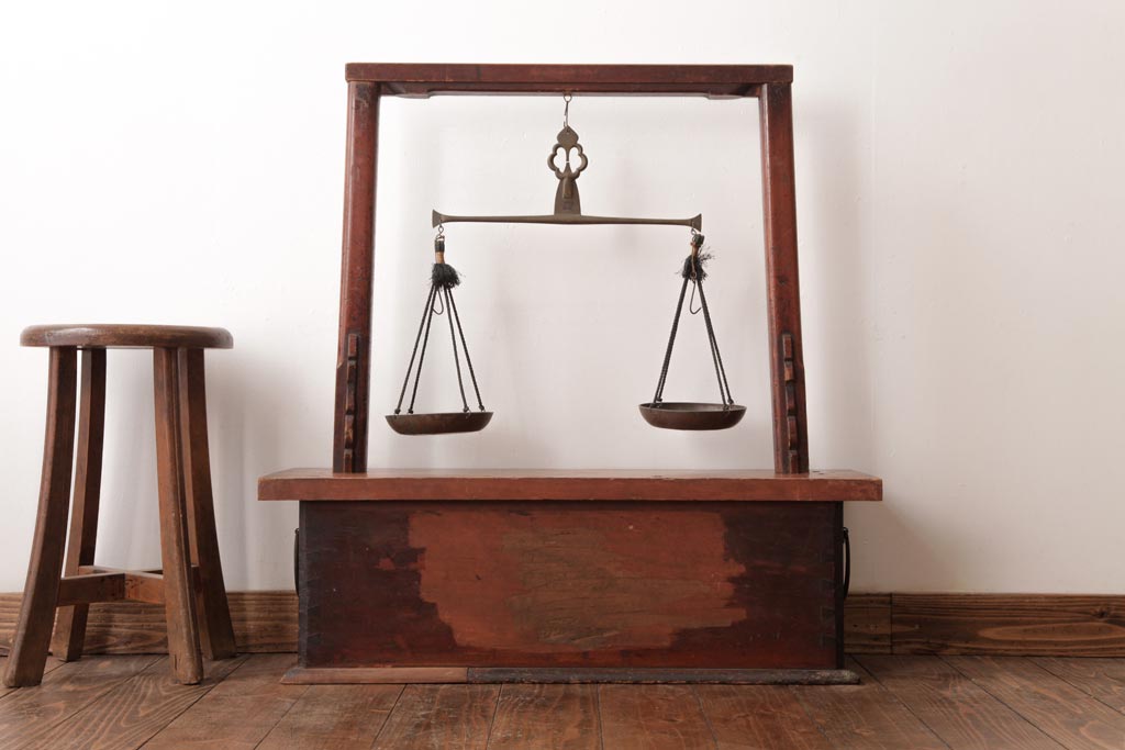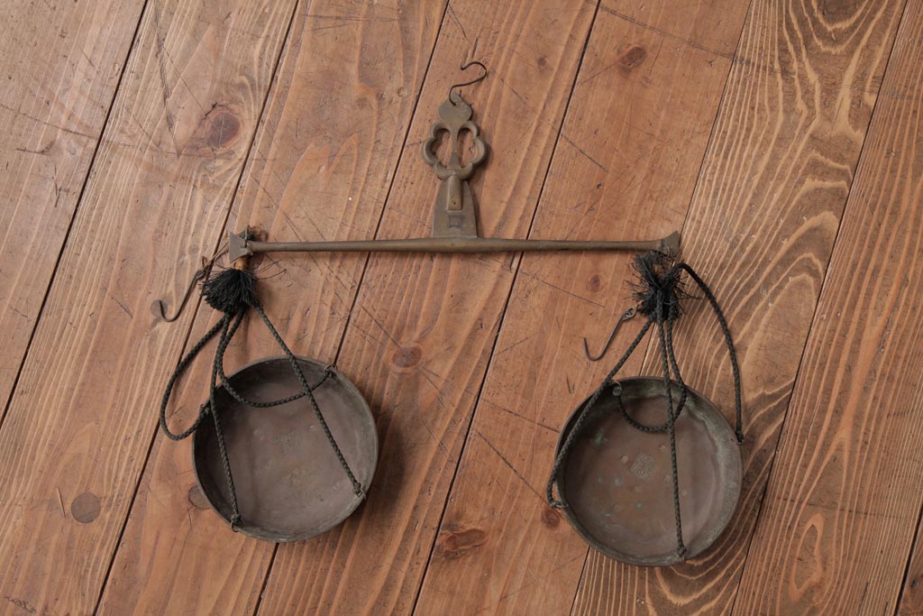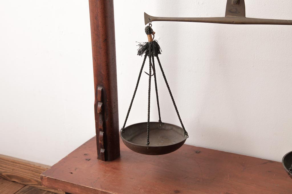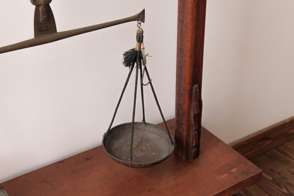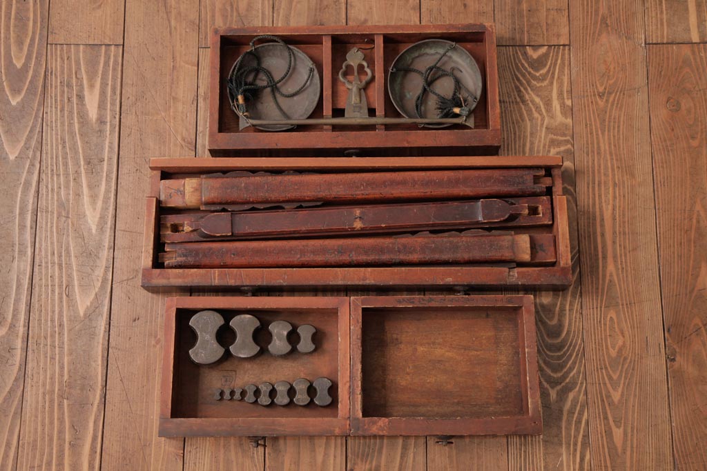 アンティーク雑貨 古民具・骨董 江戸期 両替商天秤ばかり・後藤分銅12個付(計り、針口天秤、両替天秤)(1)