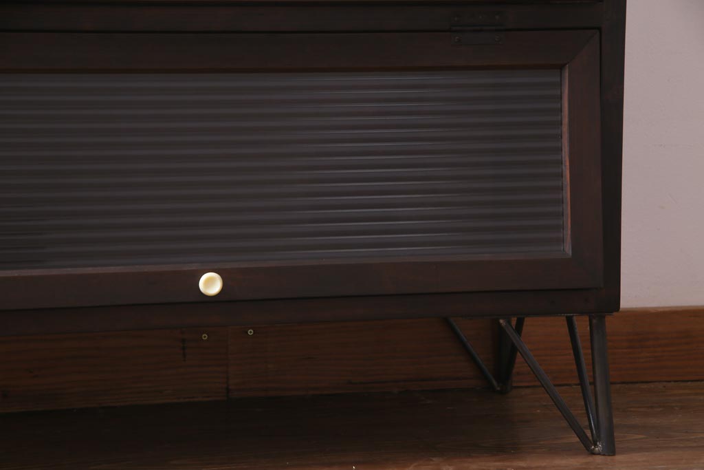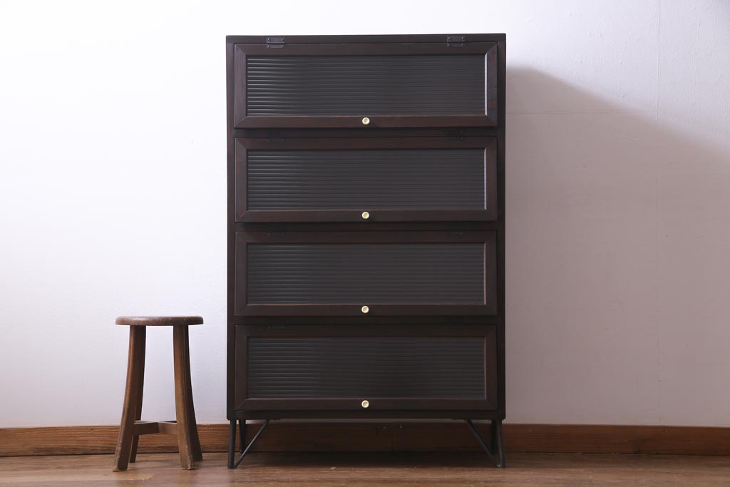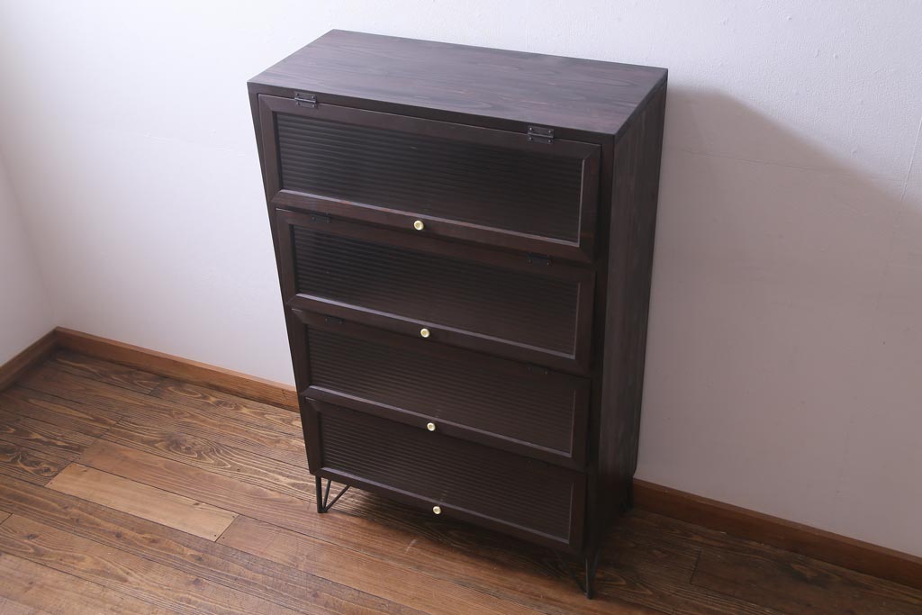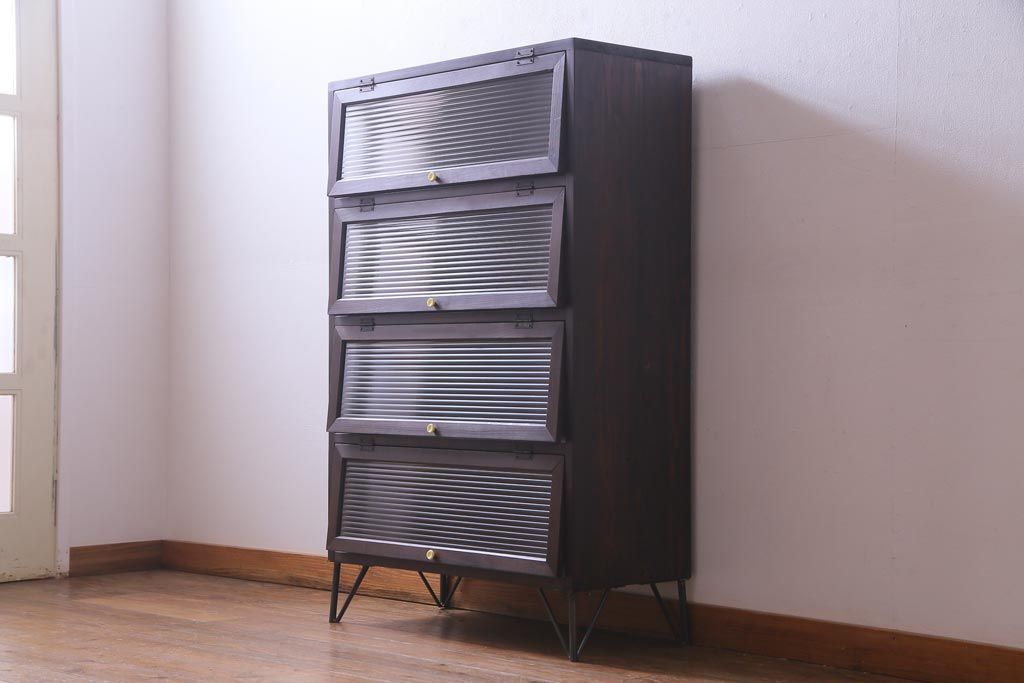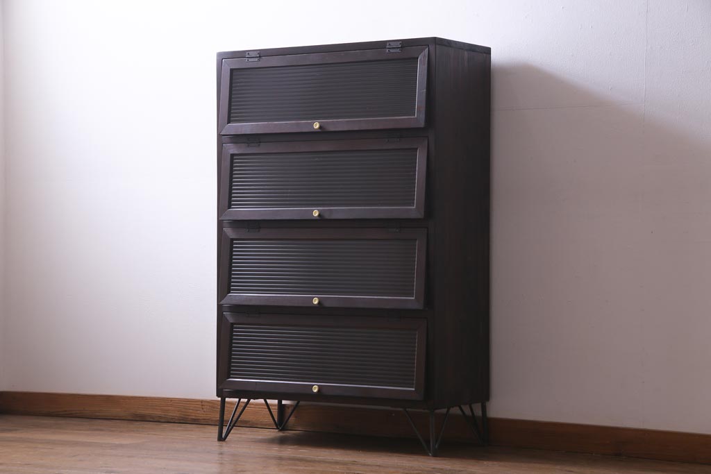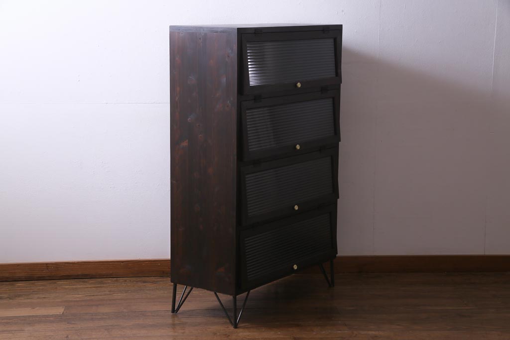 ラフジュ工房オリジナル リメイク家具 モールガラス入り 古材を活用したレトロシックなパタパタ扉の鉄脚付き収納棚(4段タイプ)(キャビネット、下駄箱)