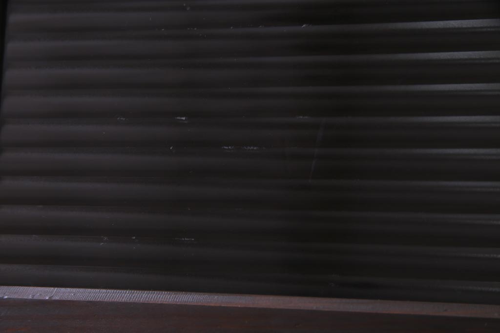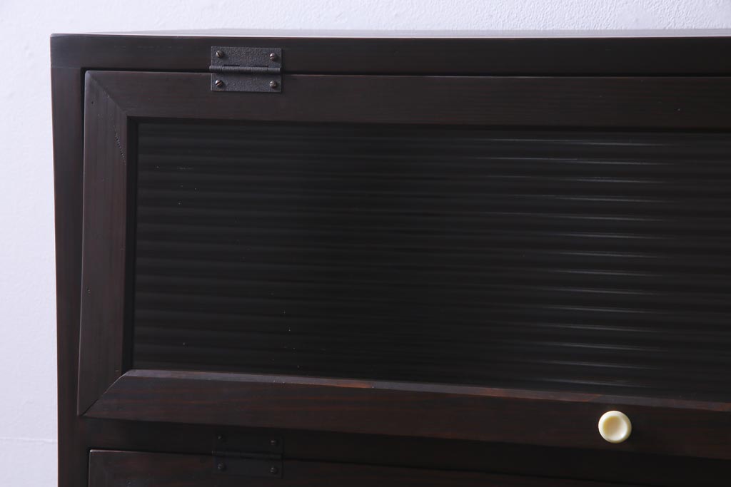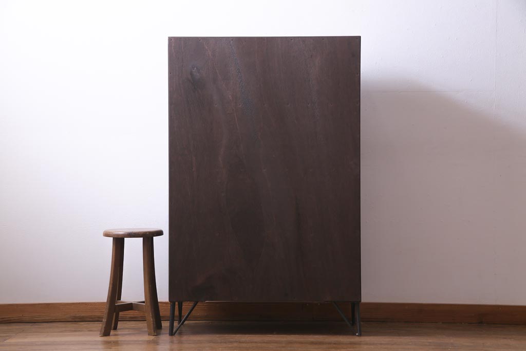 ラフジュ工房> キャビネット・戸棚> サイドキャビネット > ラフジュ工房オリジナル リメイク家具 モールガラス入り 古材を活用したレトロシックなパタパタ扉の鉄脚付き収納棚(4段タイプ)(キャビネット、下駄箱)