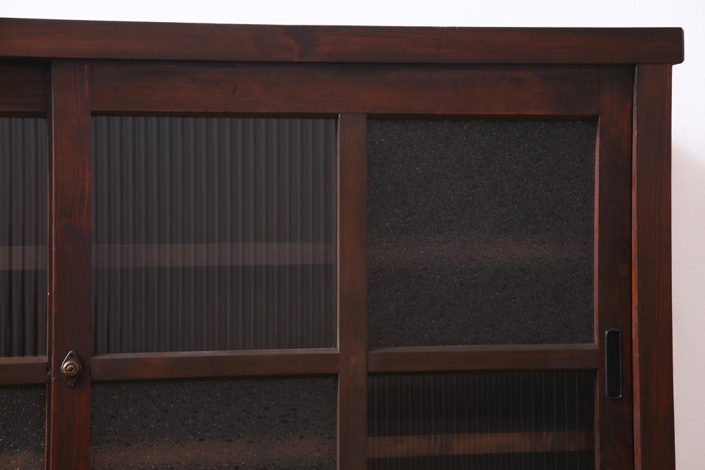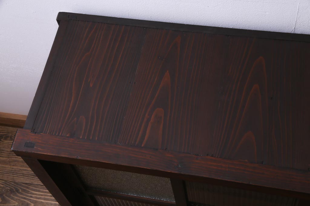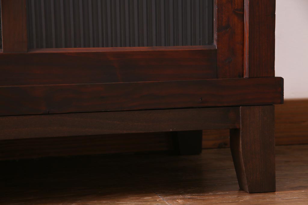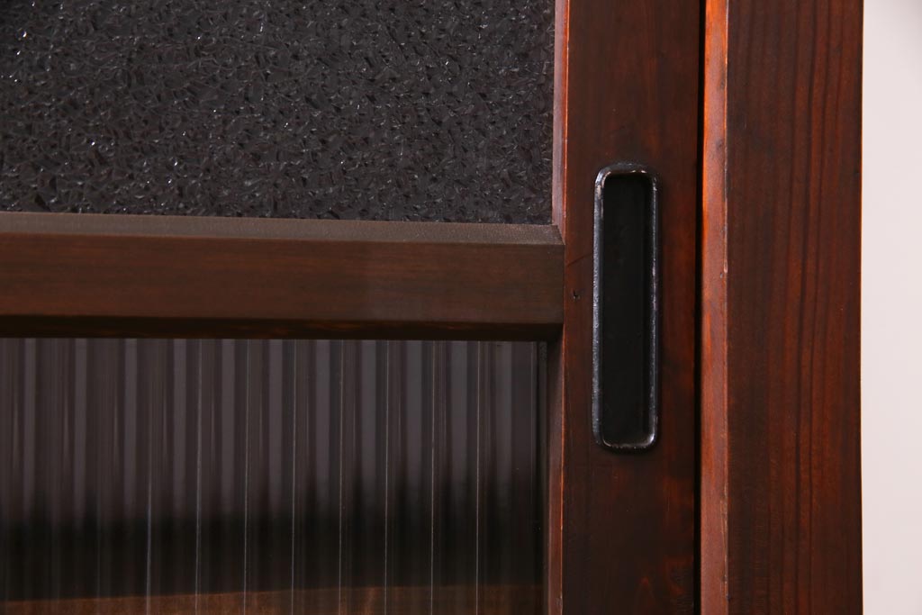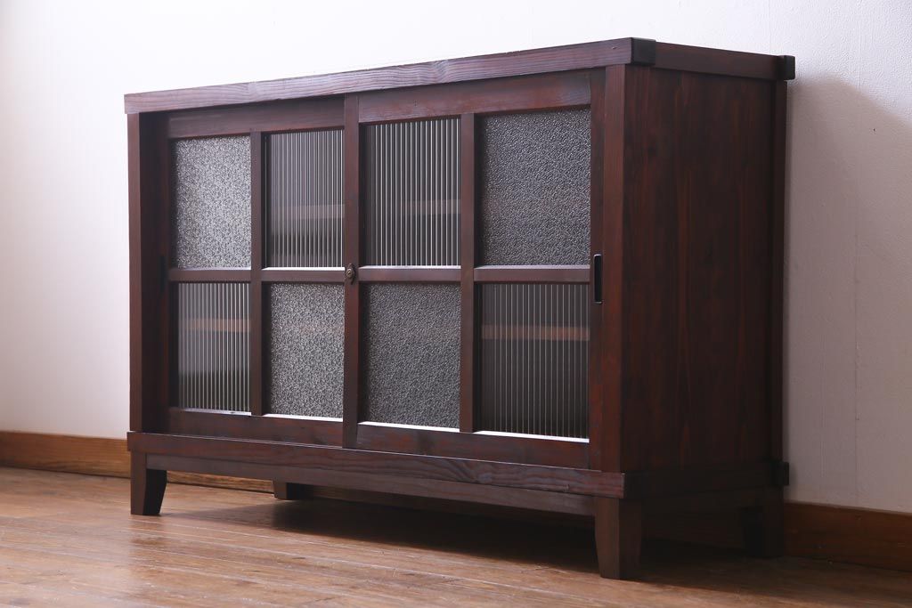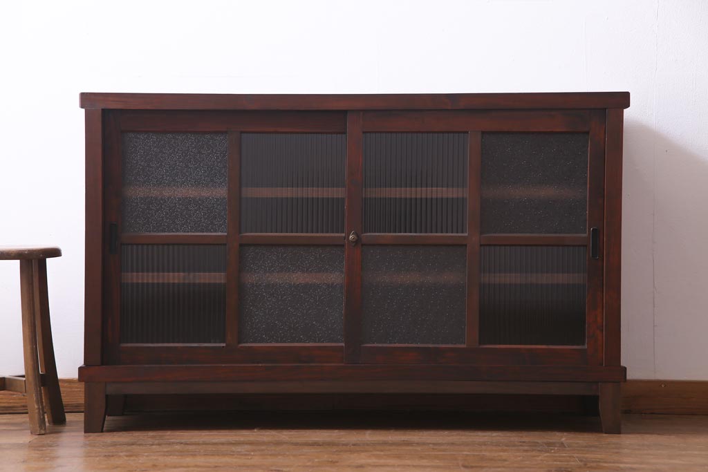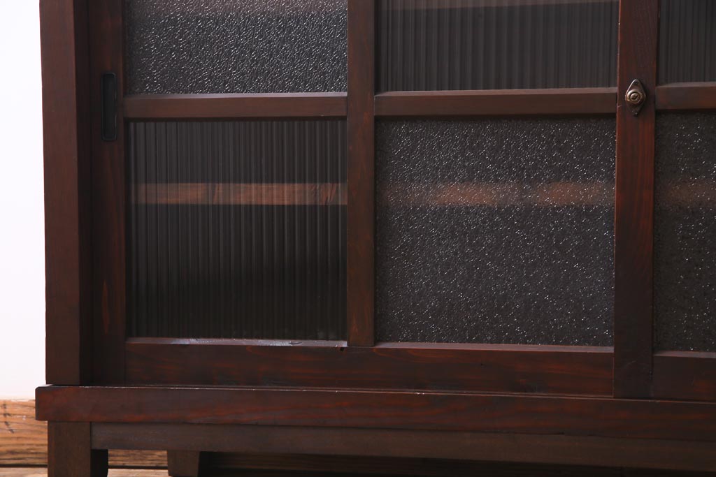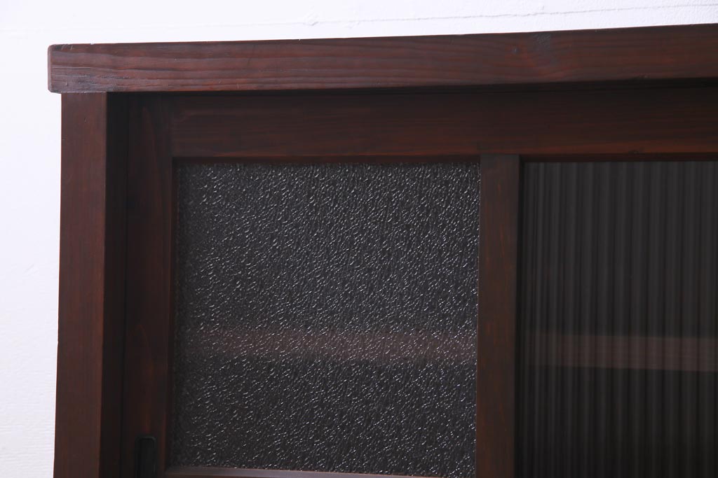 レトロ家具 和製アンティーク 杉・ヒノキ材 レトロガラスがモダンな雰囲気を高める脚付き戸棚(収納棚、サイドボード)