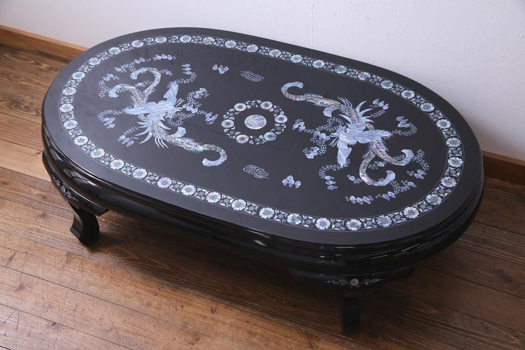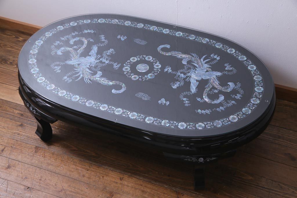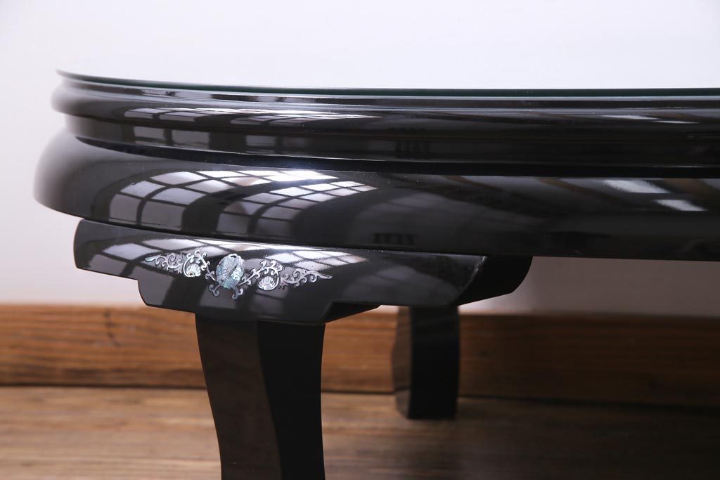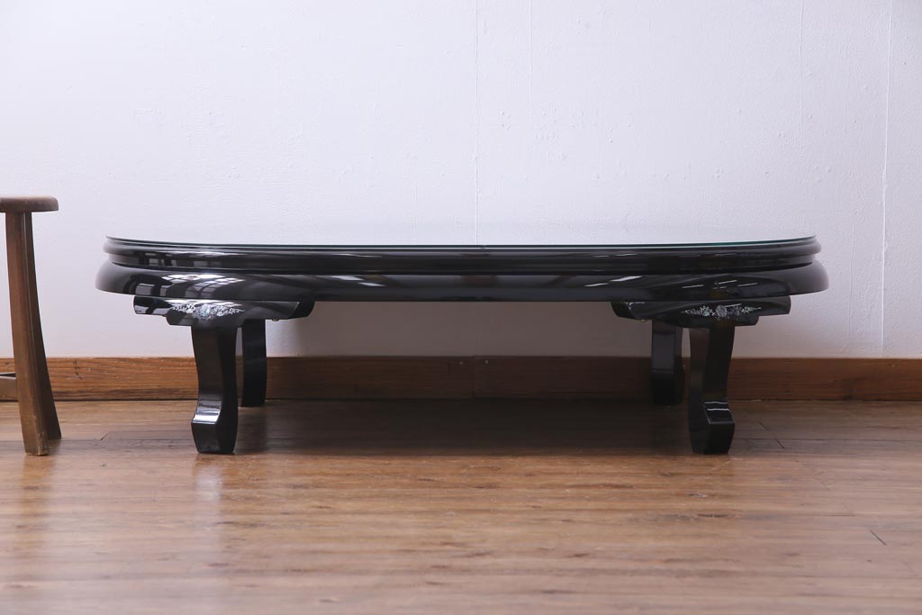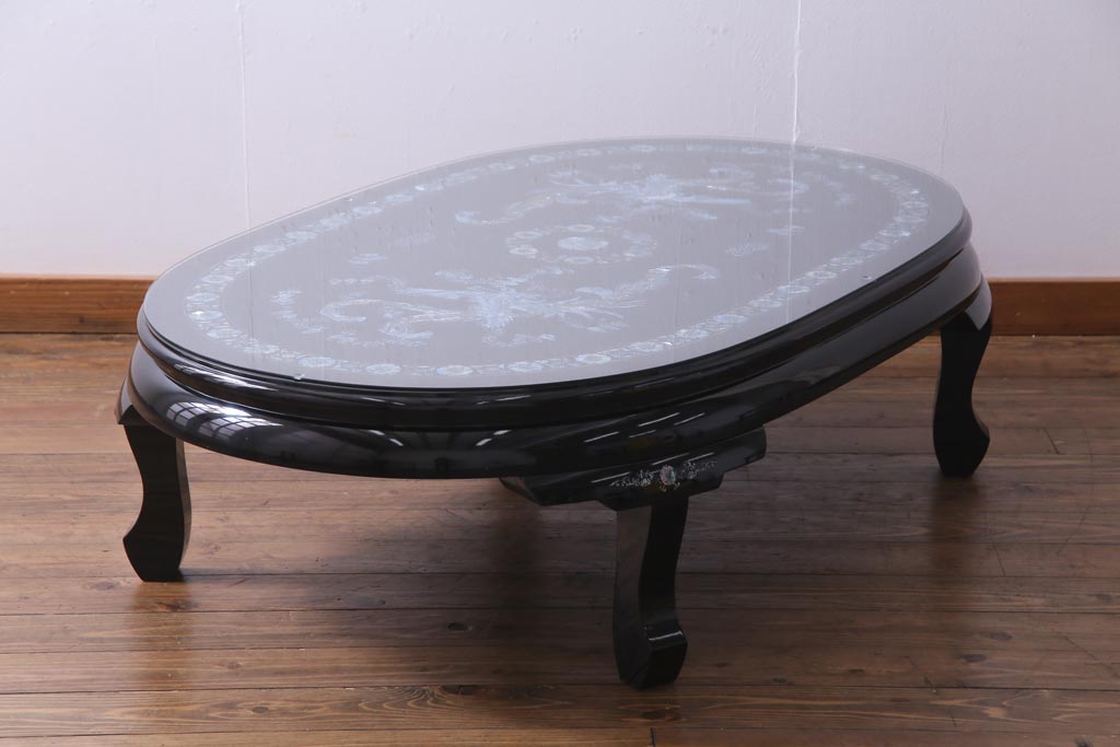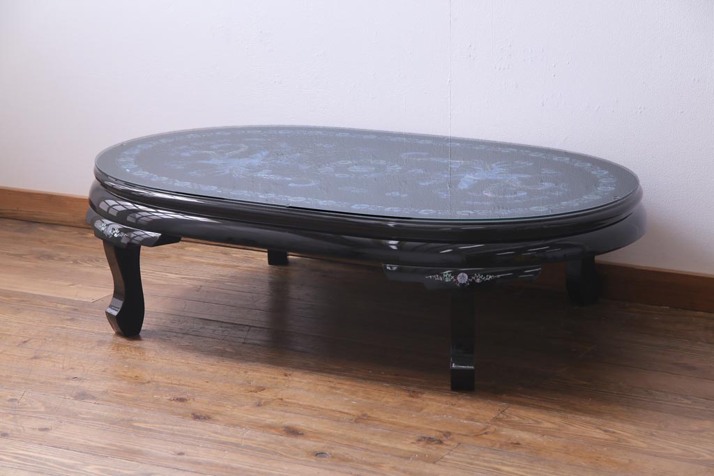 中古 民芸家具 オーバル型 ガラス天板付き 豪華絢爛な螺鈿細工の座卓(ローテーブル)(定価約67万円)