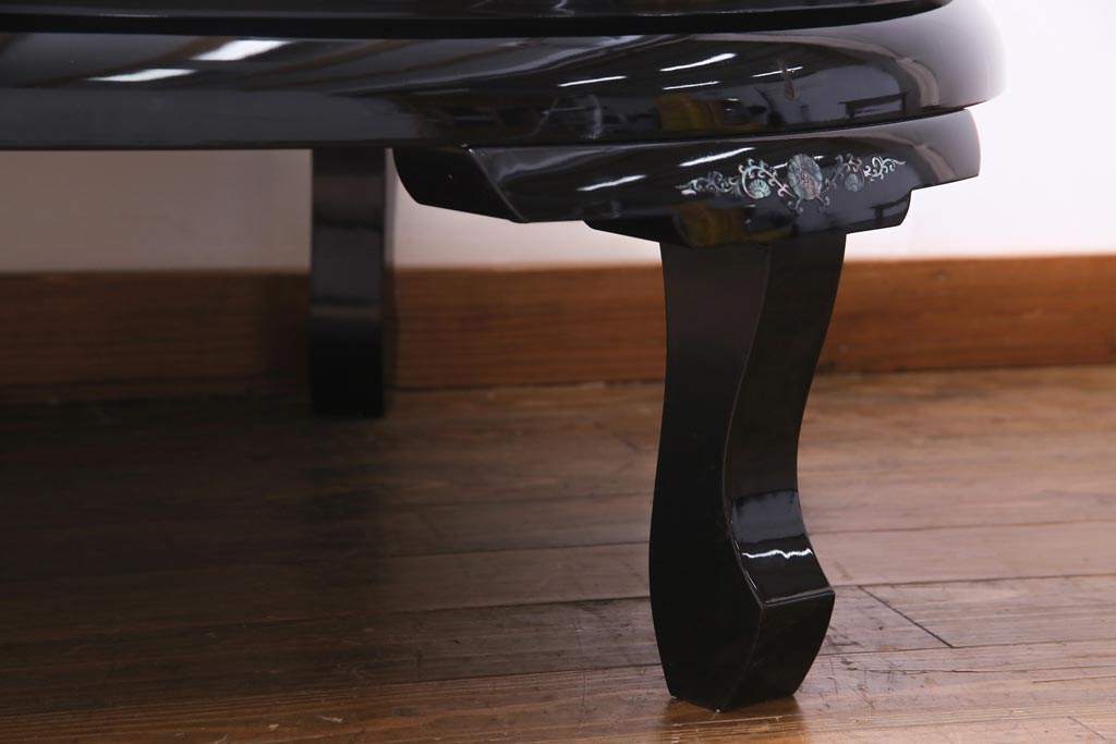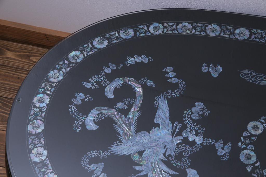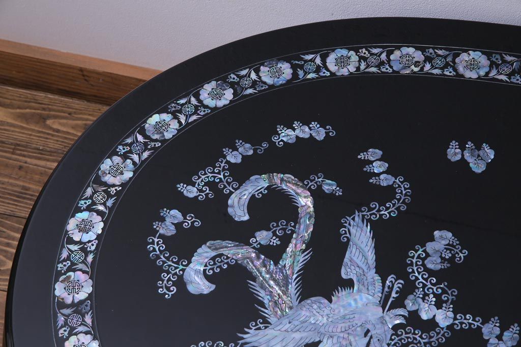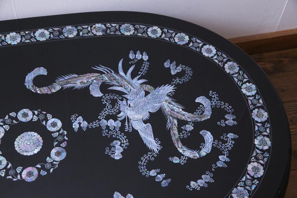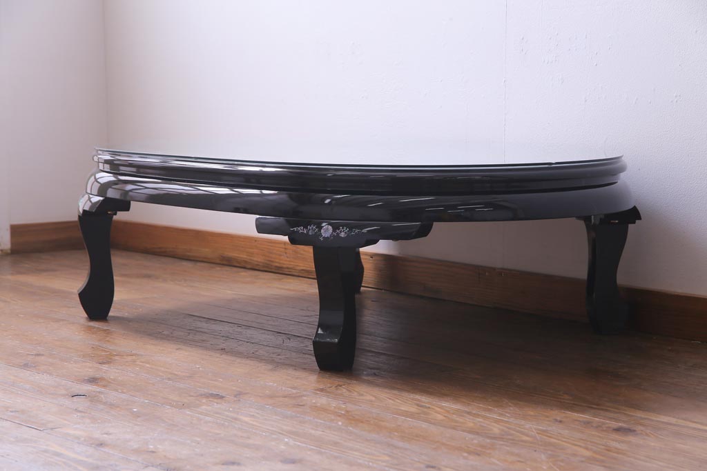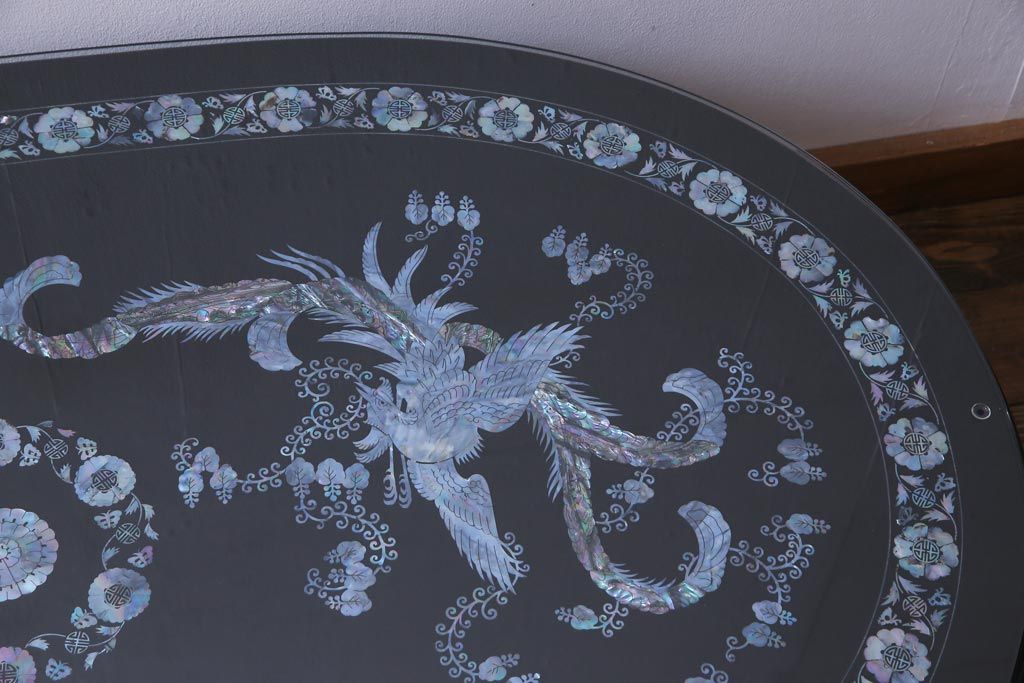 中古 民芸家具 オーバル型 ガラス天板付き 豪華絢爛な螺鈿細工の座卓(ローテーブル)(定価約67万円)