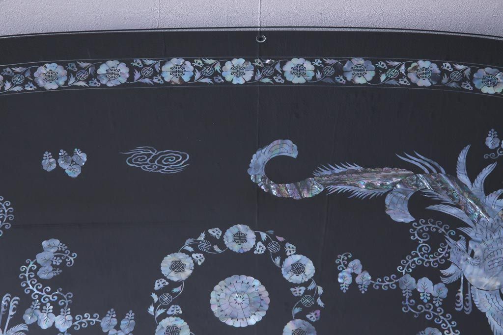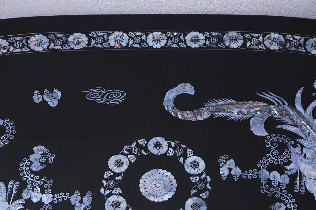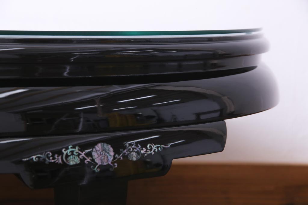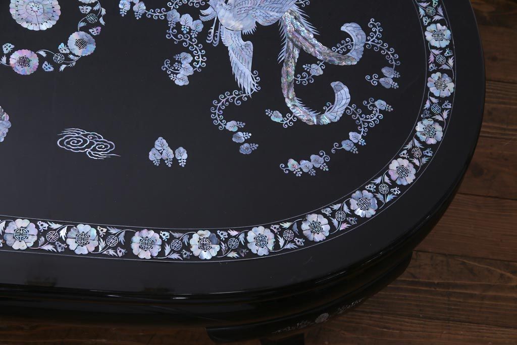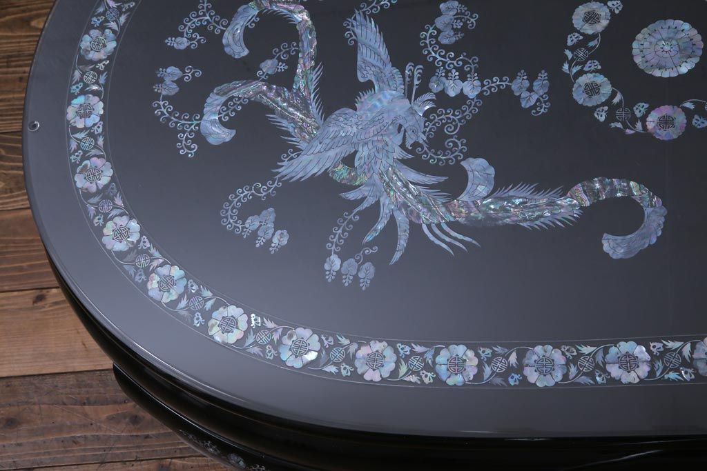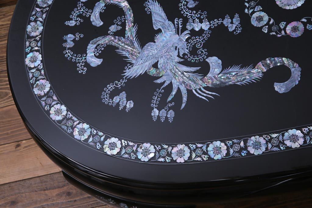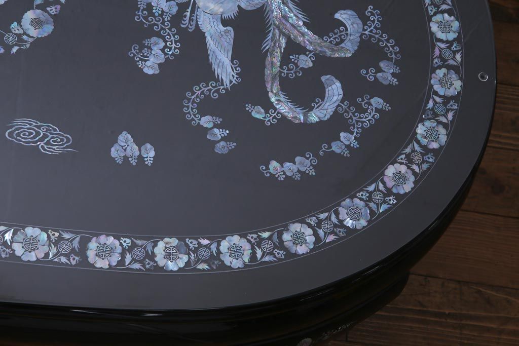 民芸家具 > 中古 民芸家具 オーバル型 ガラス天板付き 豪華絢爛な螺鈿細工の座卓(ローテーブル)(定価約67万円)