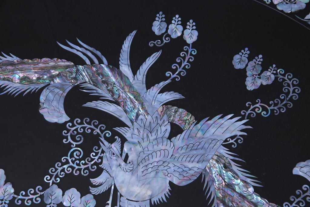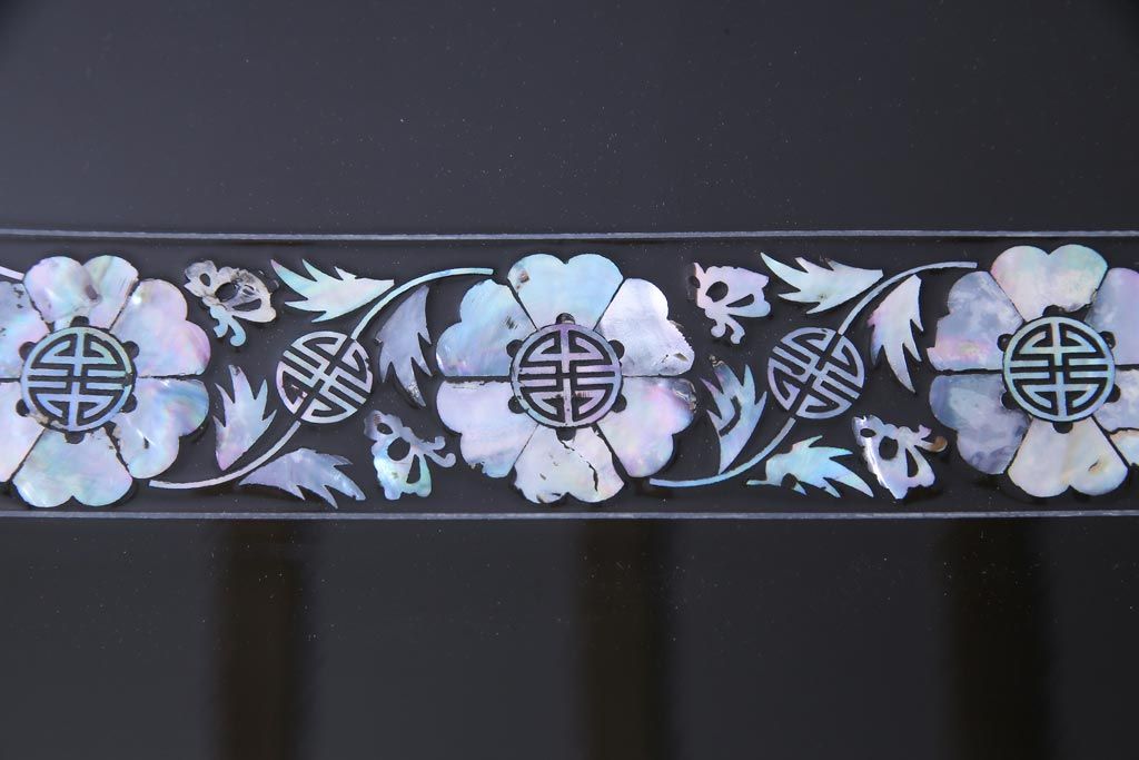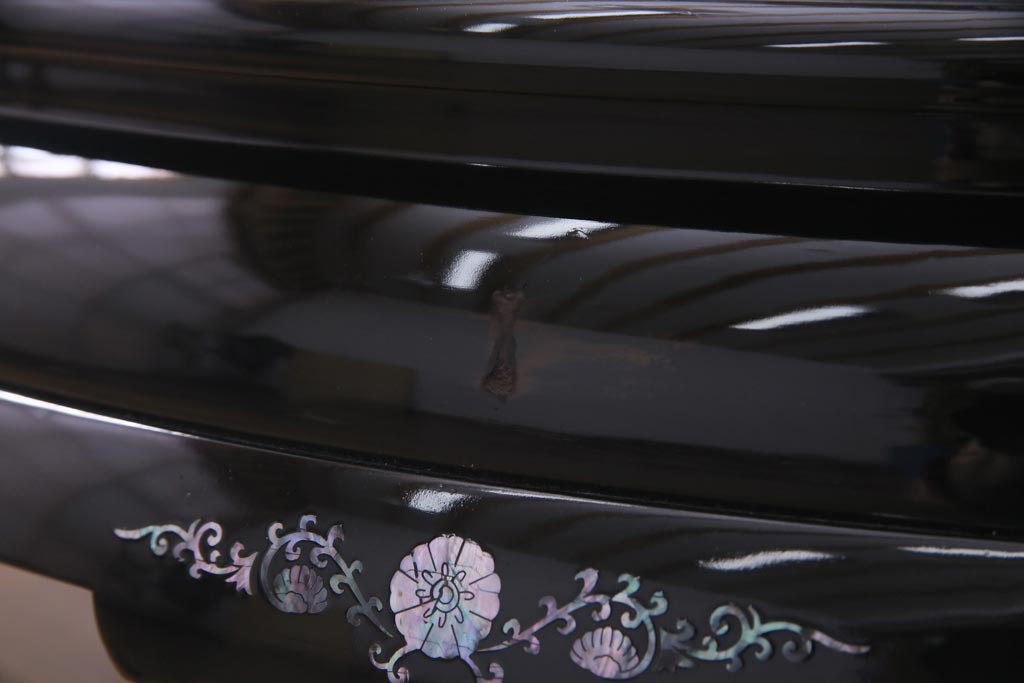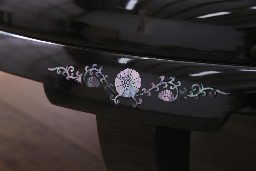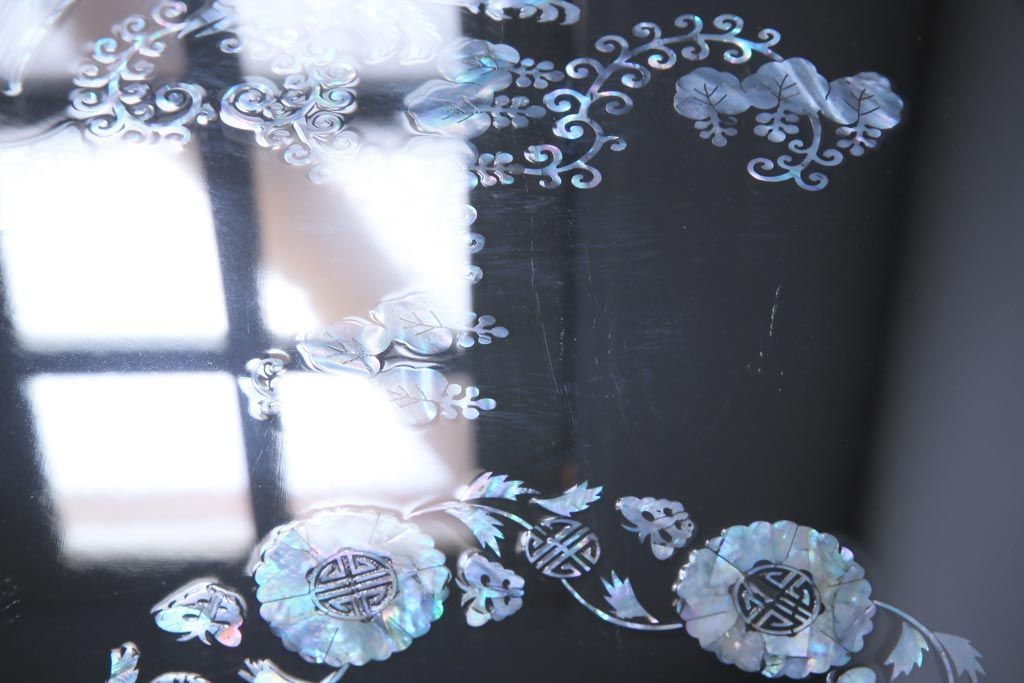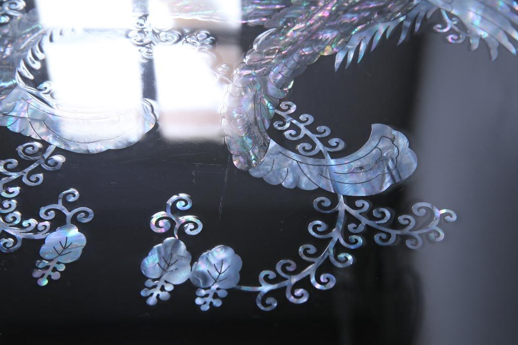民芸家具 > 中古 民芸家具 オーバル型 ガラス天板付き 豪華絢爛な螺鈿細工の座卓(ローテーブル)(定価約67万円)