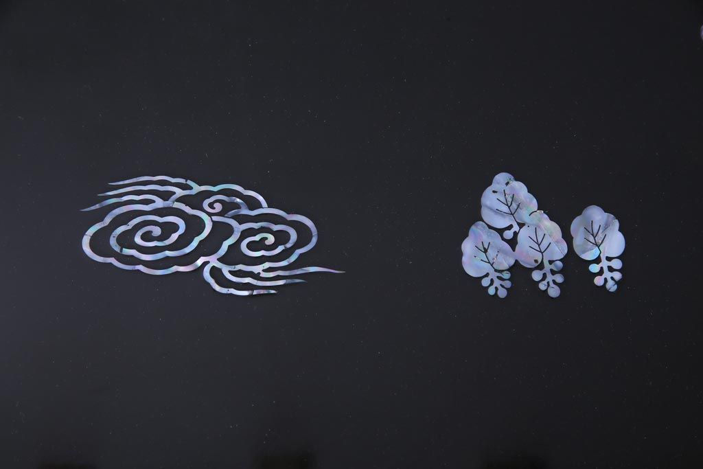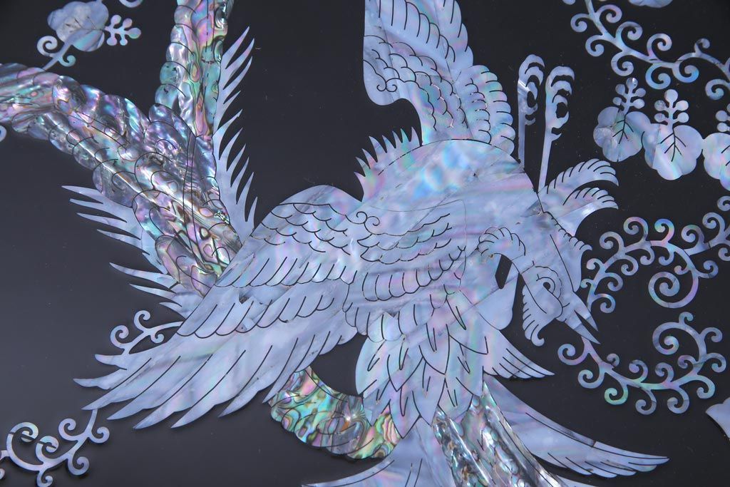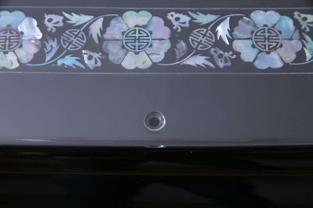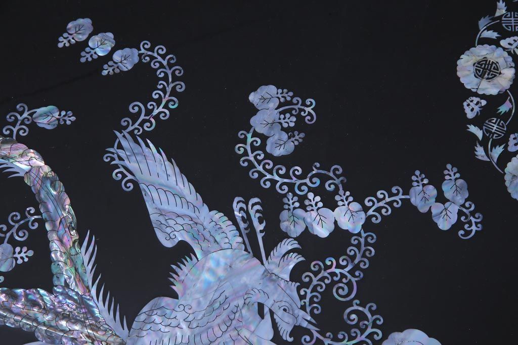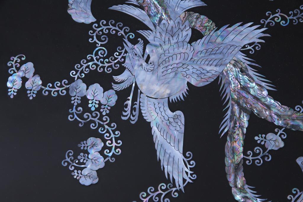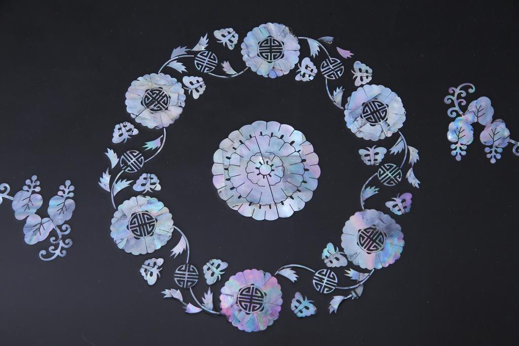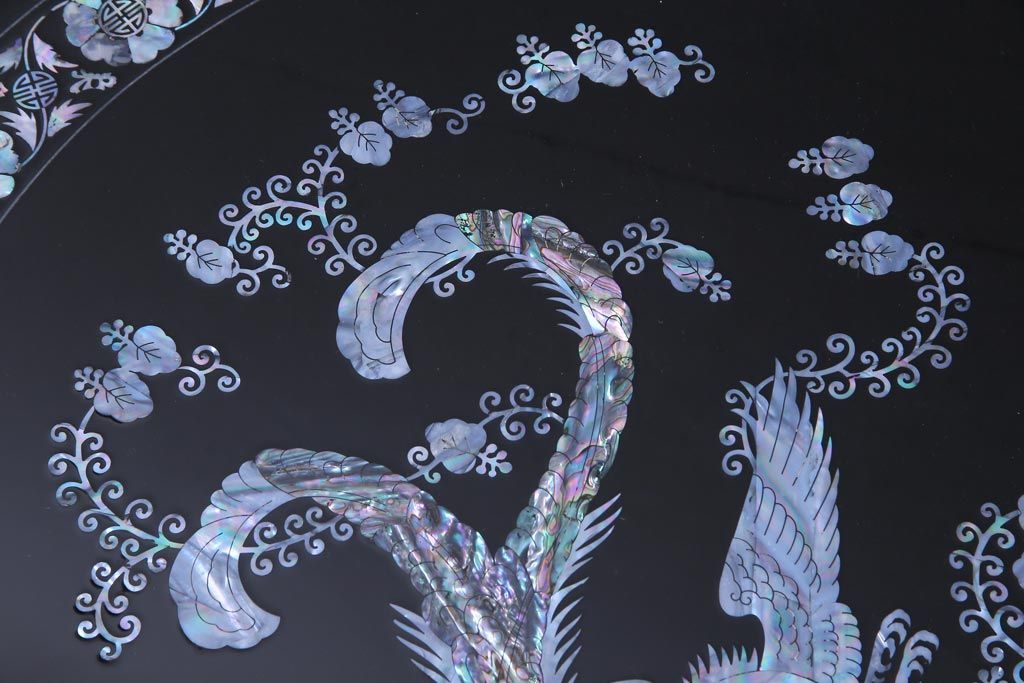 民芸家具 > 中古 民芸家具 オーバル型 ガラス天板付き 豪華絢爛な螺鈿細工の座卓(ローテーブル)(定価約67万円)