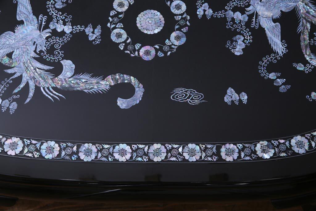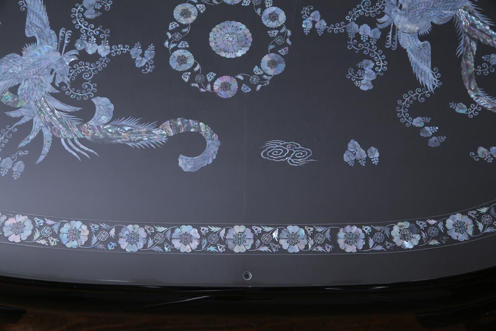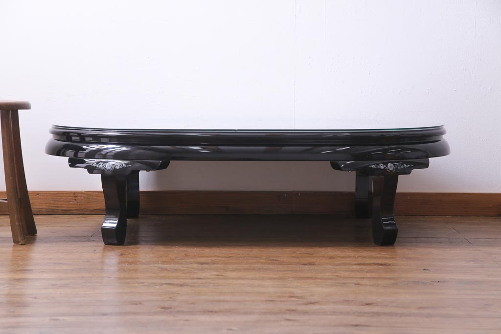 テーブル> 座卓 > 中古 民芸家具 オーバル型 ガラス天板付き 豪華絢爛な螺鈿細工の座卓(ローテーブル)(定価約67万円)