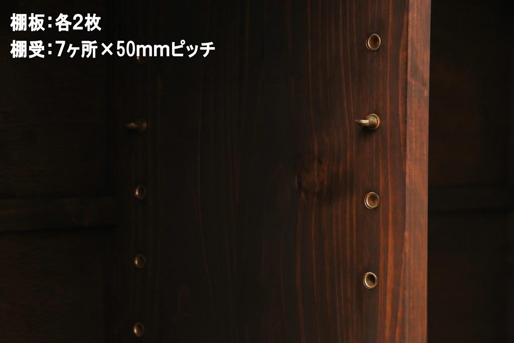 棚板は取り外しできます。棚板は各2枚あります。棚受けは7ヶ所、50mmピッチで調整できます。棚幅サイズのものが1枚の作りです。