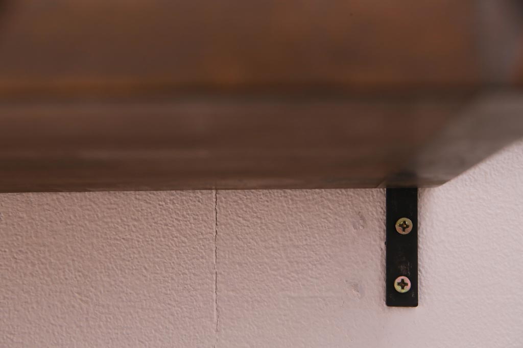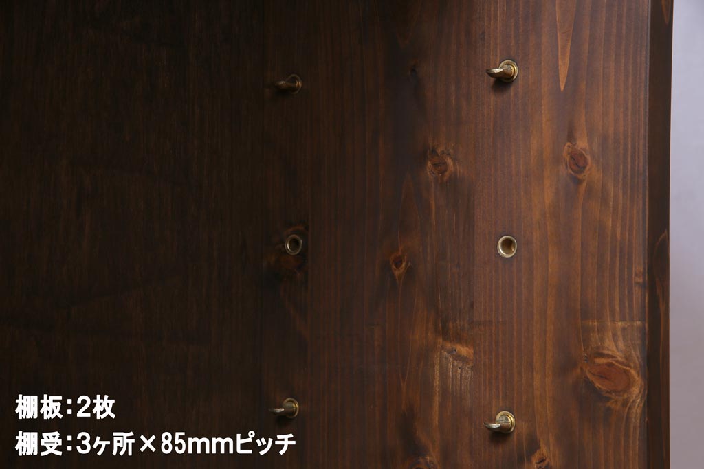 棚板は取り外しできます。棚板は2枚あります。棚受けは3ヶ所、85mmピッチで調整できます。棚幅サイズのものが1枚の作りです。