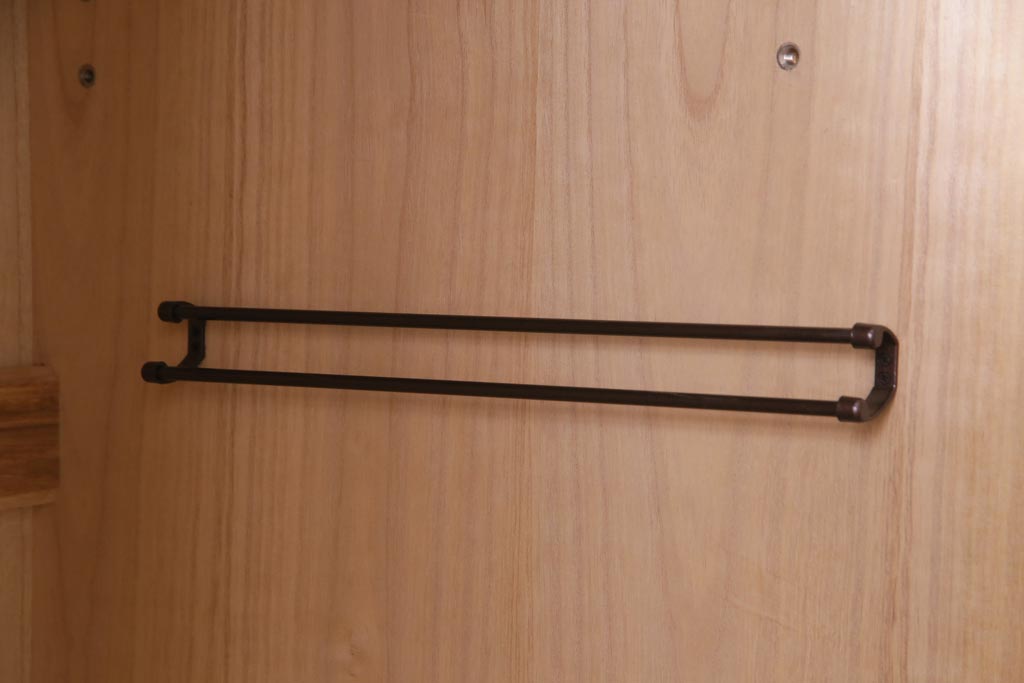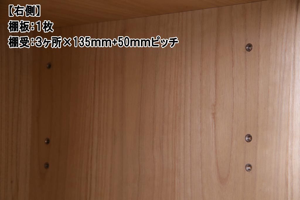 棚板は取り外しできます。左:棚板5枚、棚受け15ヶ所、50mmピッチ、右:棚板1枚、棚受け3ヶ所、135+50mmピッチで調整できます。棚幅サイズのものが1枚の作りです。