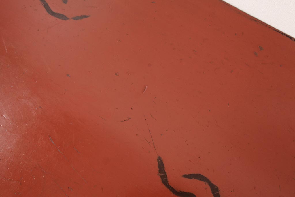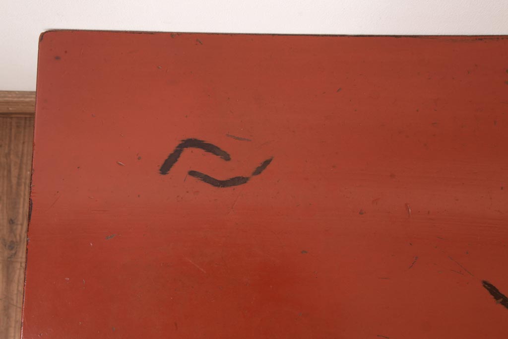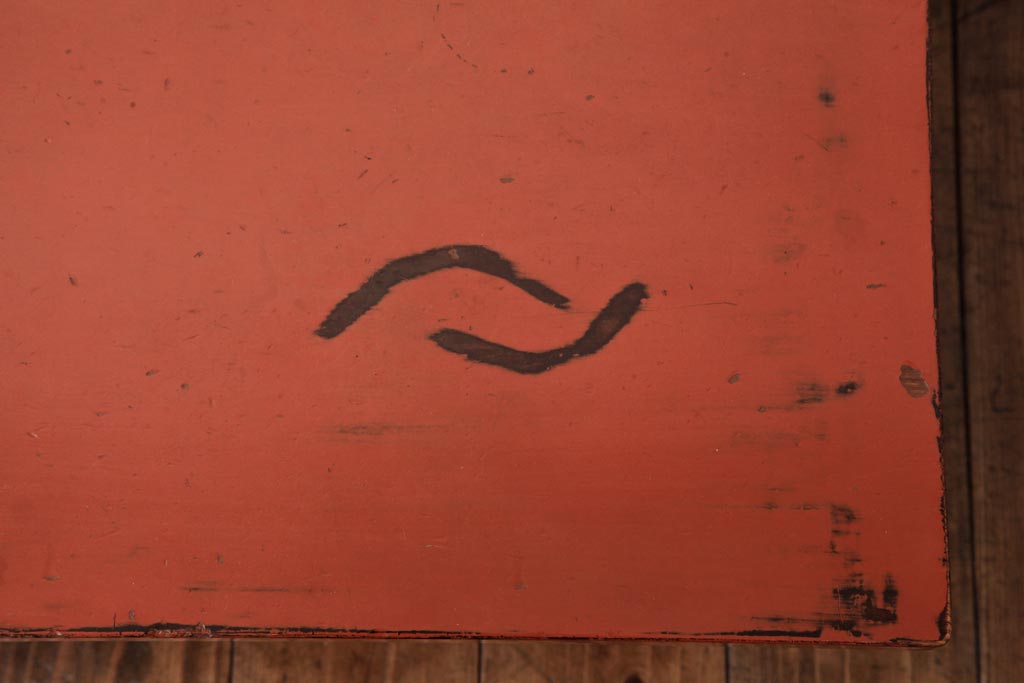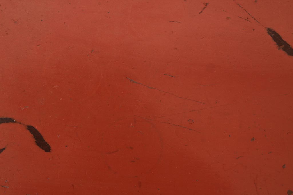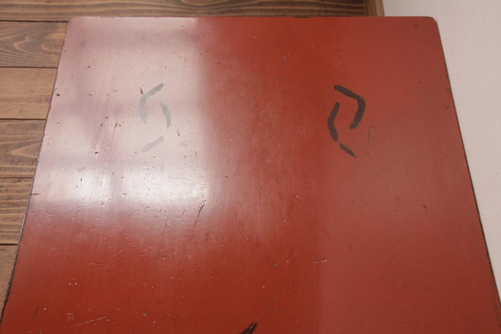 天板に黒漆の上に朱漆を重ねて模様を付けた