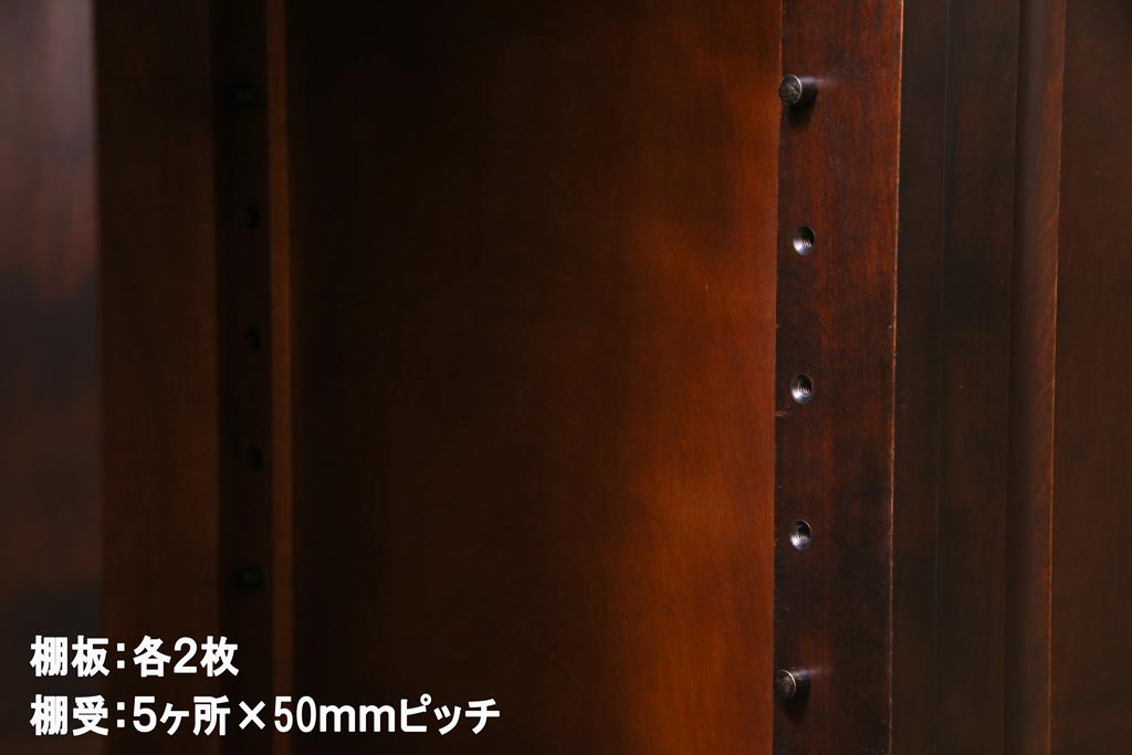 棚板は取り外しできます。棚板は左右各2枚あります。棚受けは5ヶ所、50mmピッチで調整できます。棚幅サイズのものが1枚の作りです。