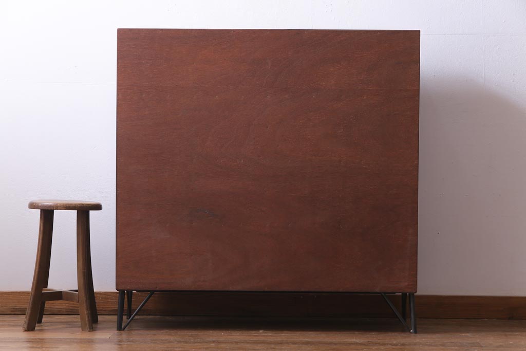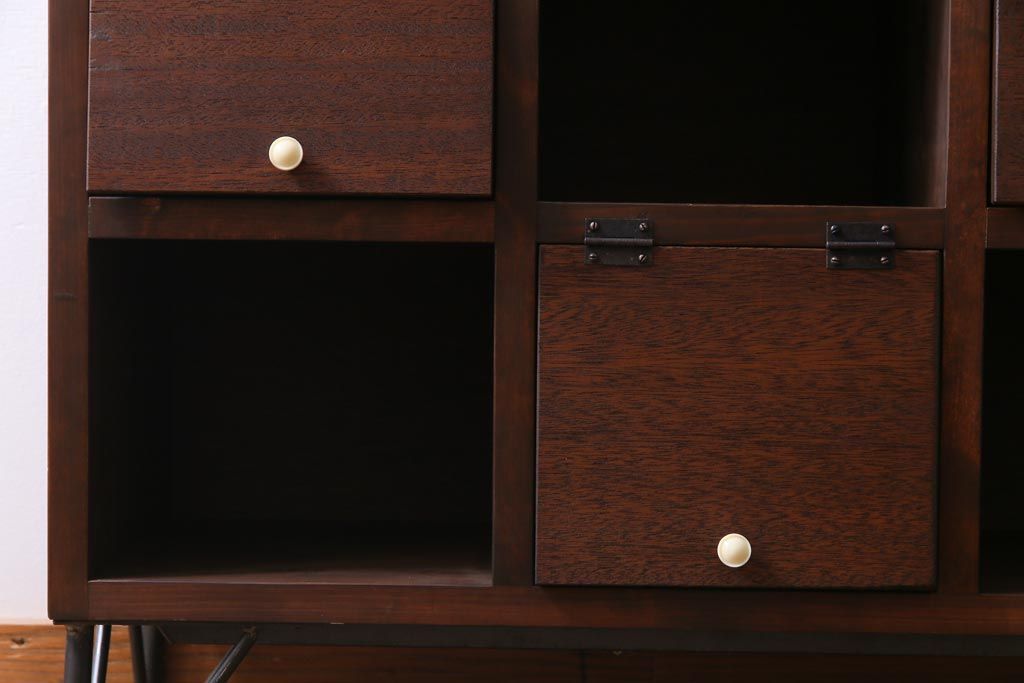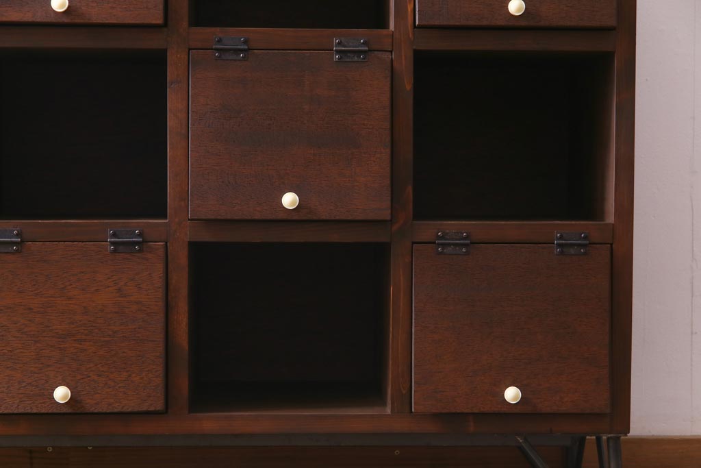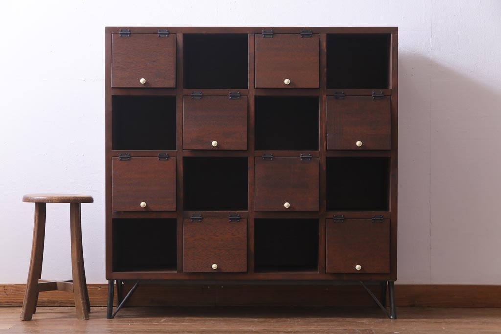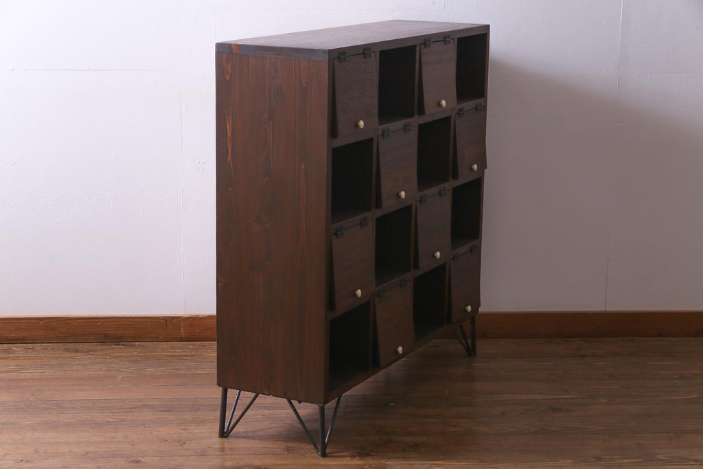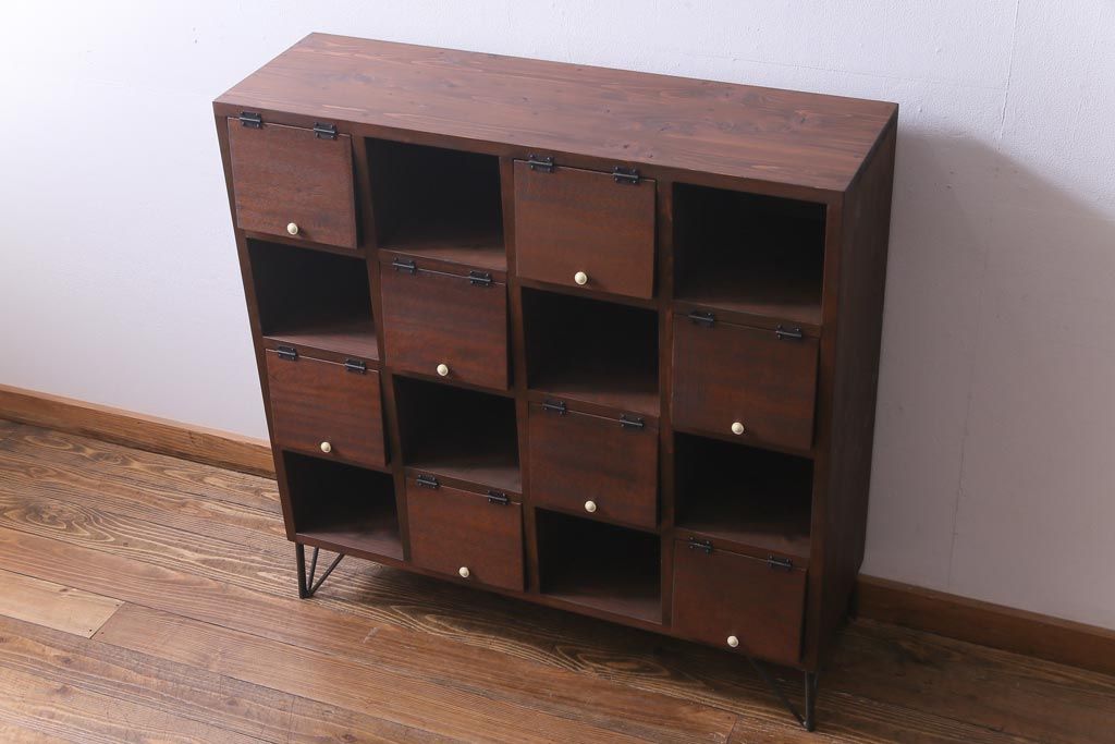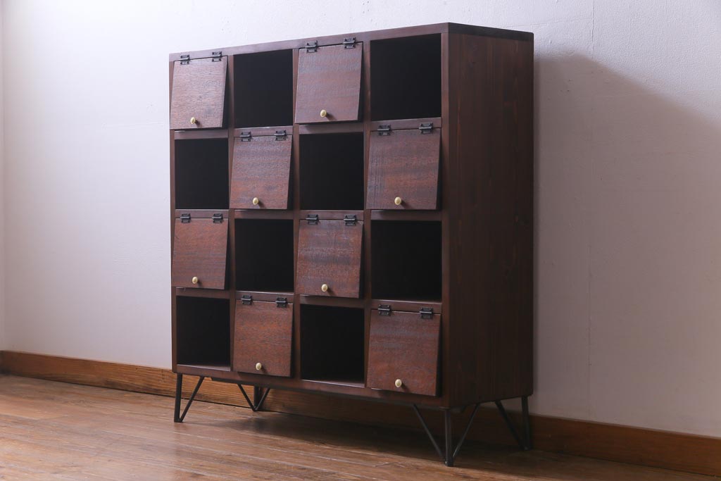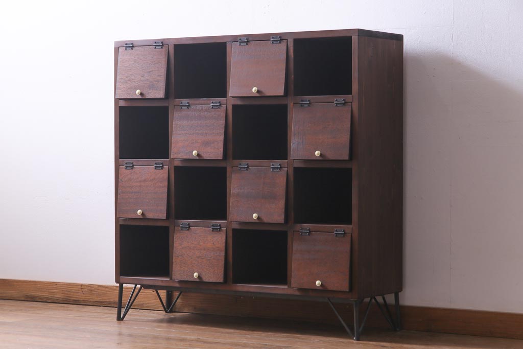 ラフジュ工房オリジナル 古材リメイク 4×4マス 互い違いのパタパタ扉がお洒落な鉄脚付きマス目棚(収納棚、戸棚、ロッカー、キャビネット)(R-034285)です。