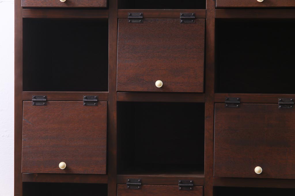 オープンラック・シェルフ > ラフジュ工房オリジナル 古材リメイク 4×4マス 互い違いのパタパタ扉がお洒落な鉄脚付きマス目棚(収納棚、戸棚、ロッカー、キャビネット)(R-034285)