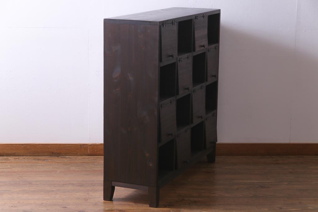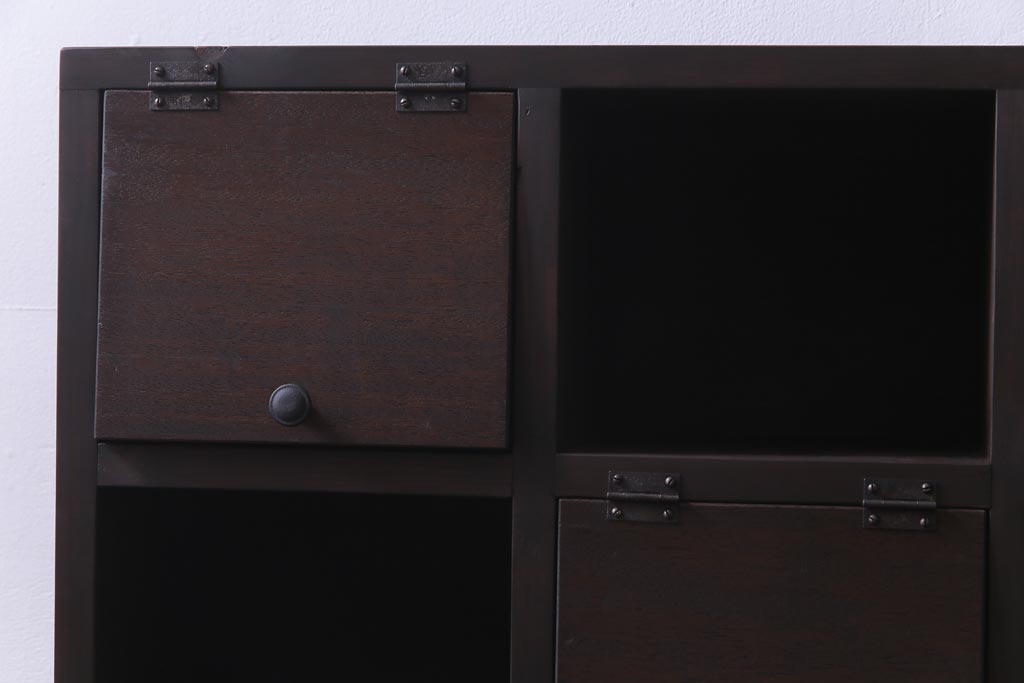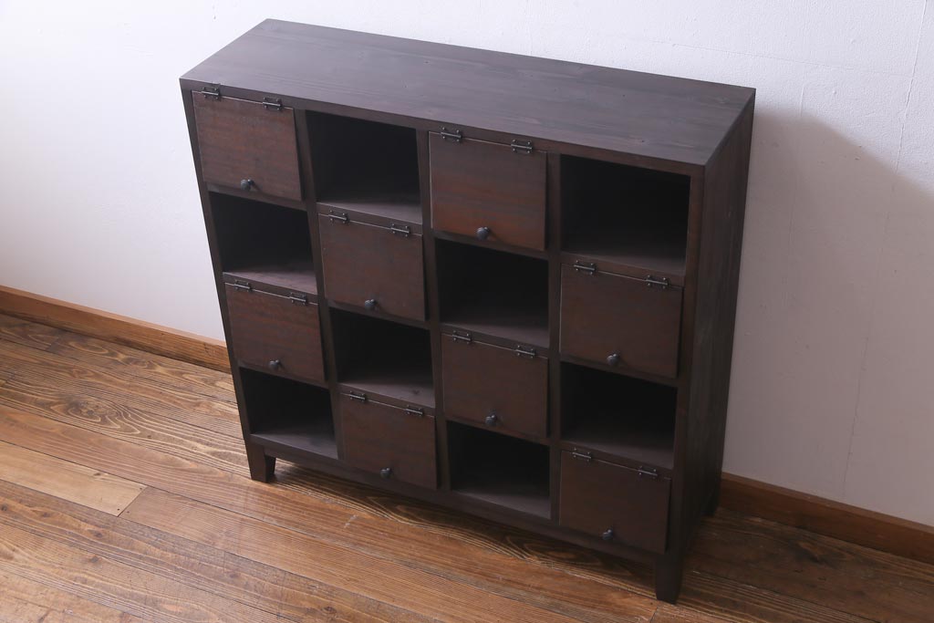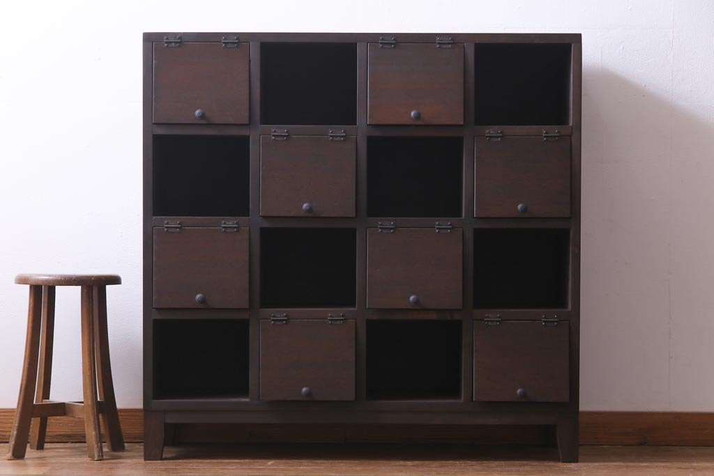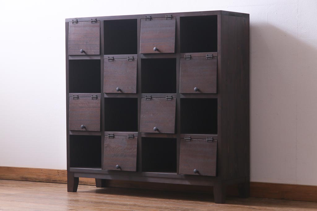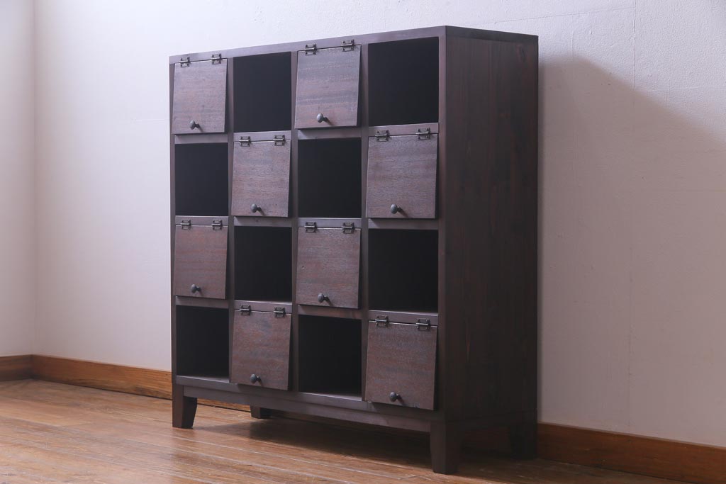ラフジュ工房オリジナル 古材リメイク 4×4マス 互い違いのパタパタ扉がお洒落な脚付きマス目棚(収納棚)(1)