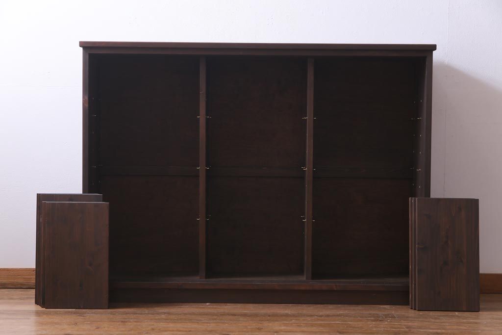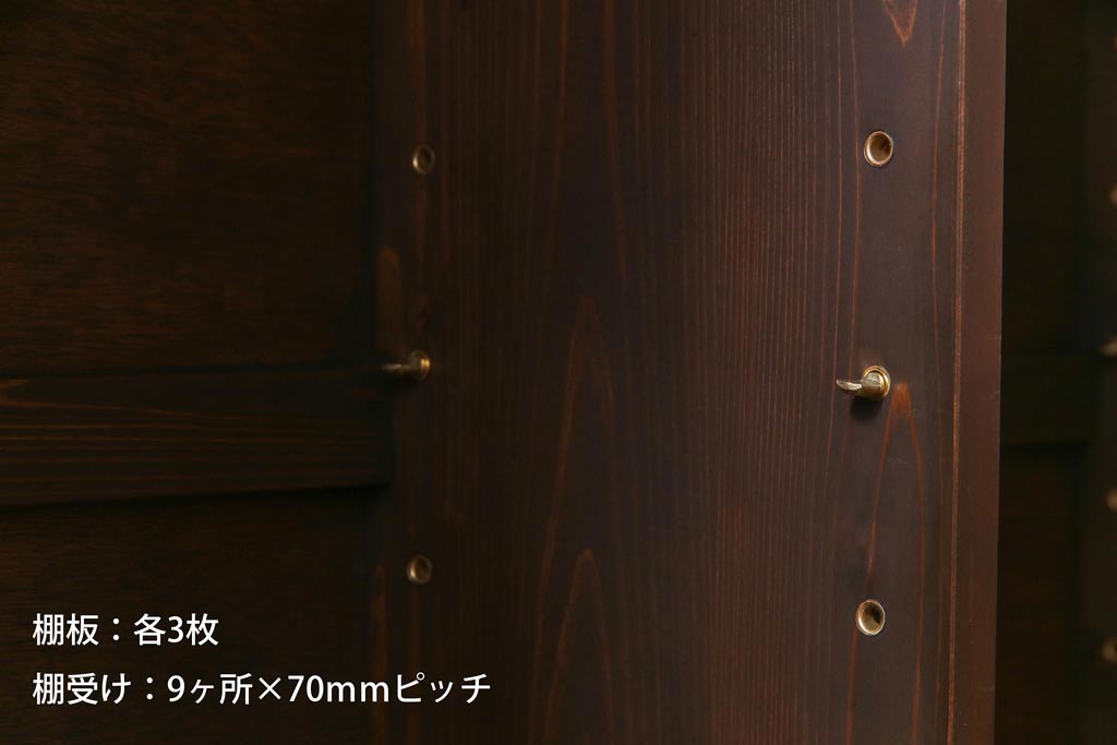 棚板は取り外しできます。棚板は各3枚あります。棚受けは9ヶ所、70mmピッチで調整できます。棚幅サイズのものが1枚の作りです。