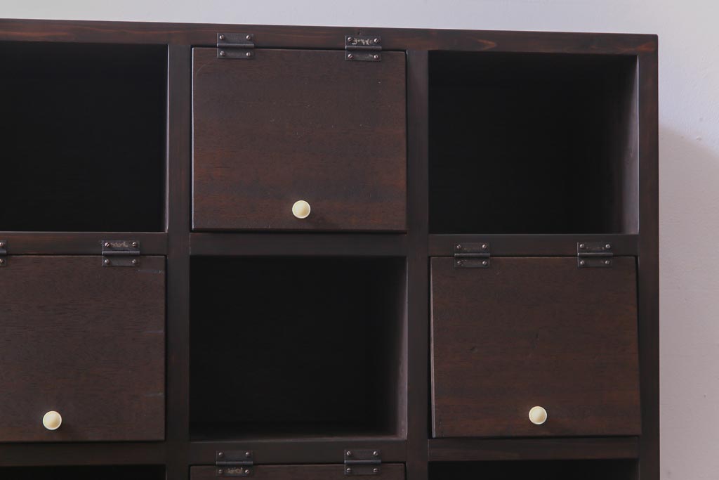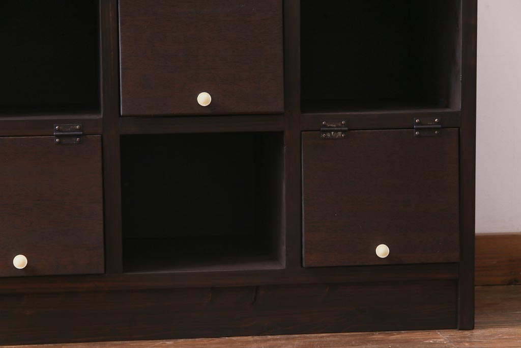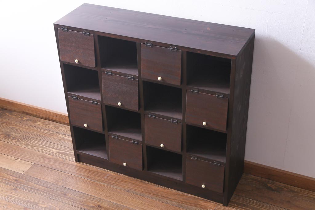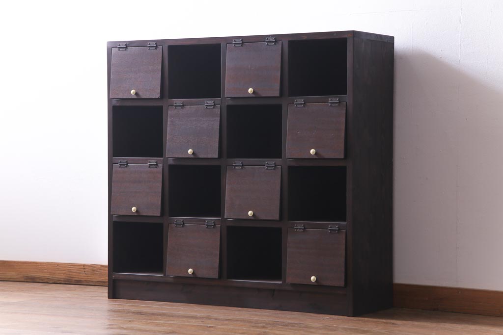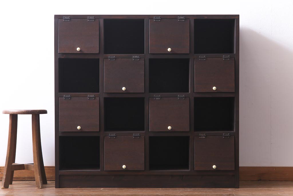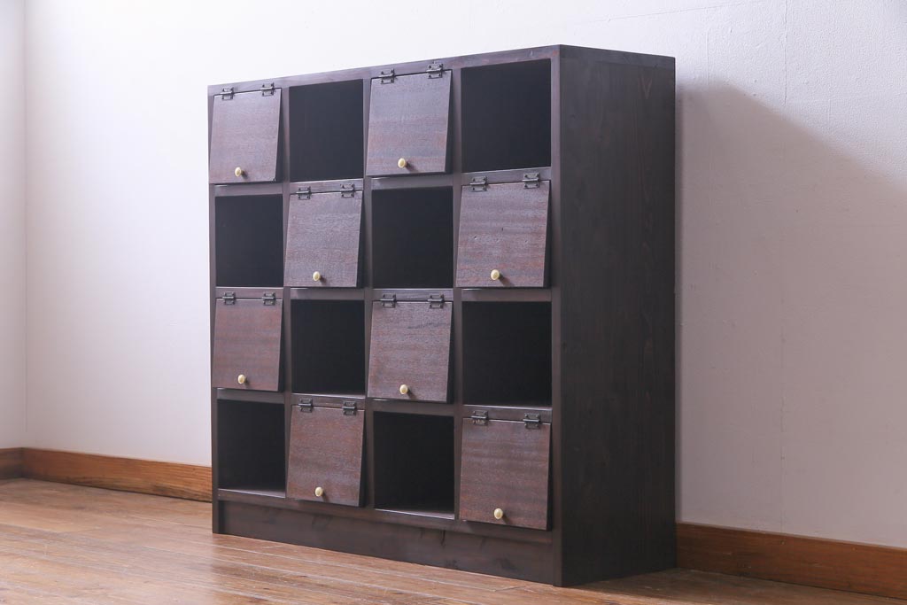 ラフジュ工房オリジナル 白い取っ手がレトロで可愛らしいパタパタ扉のマス目棚(収納棚、下駄箱)です。