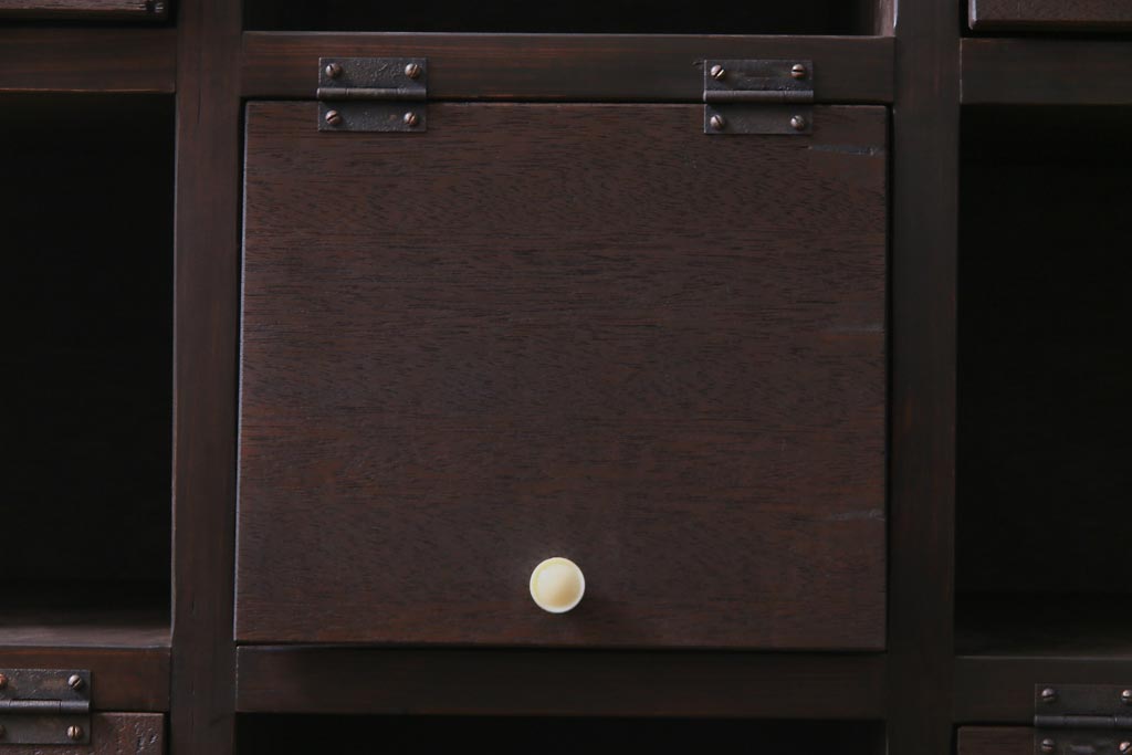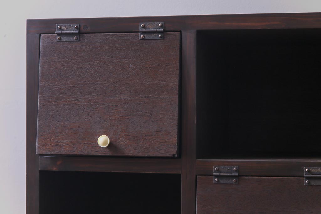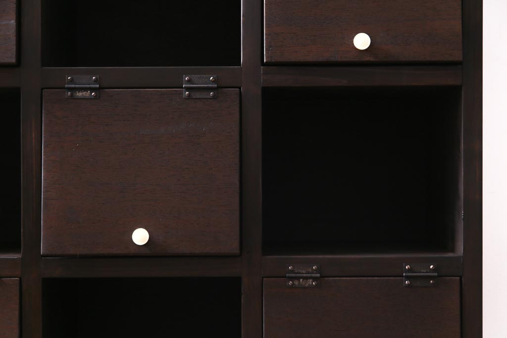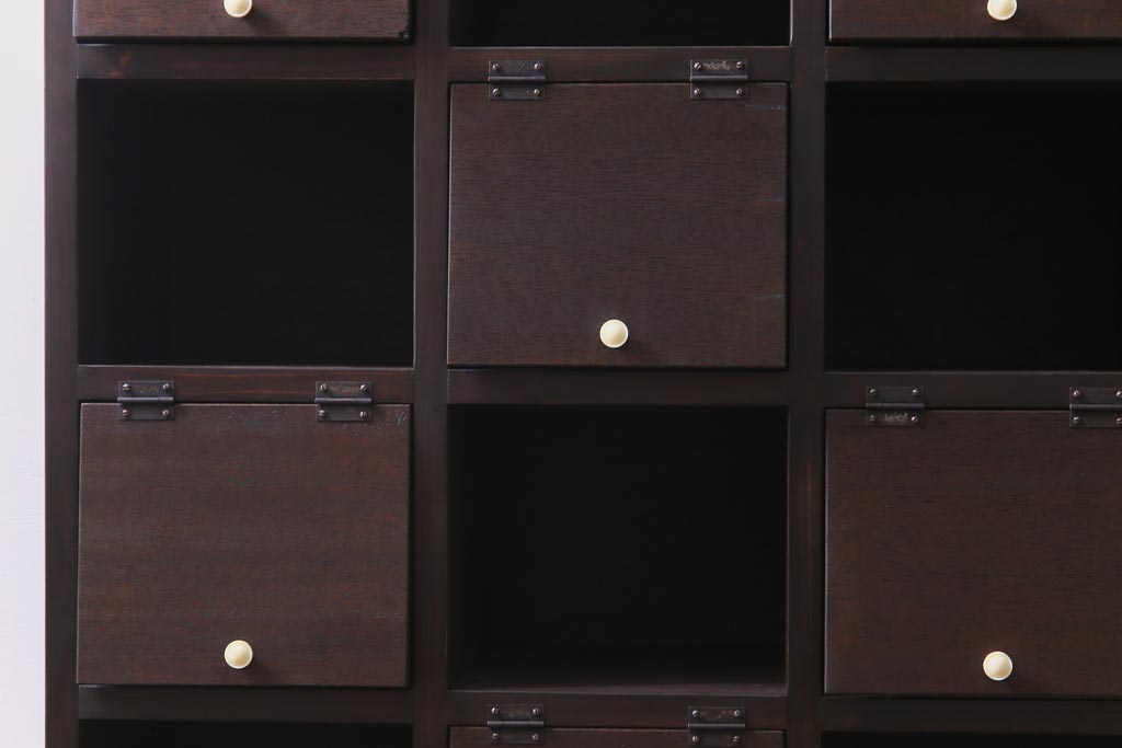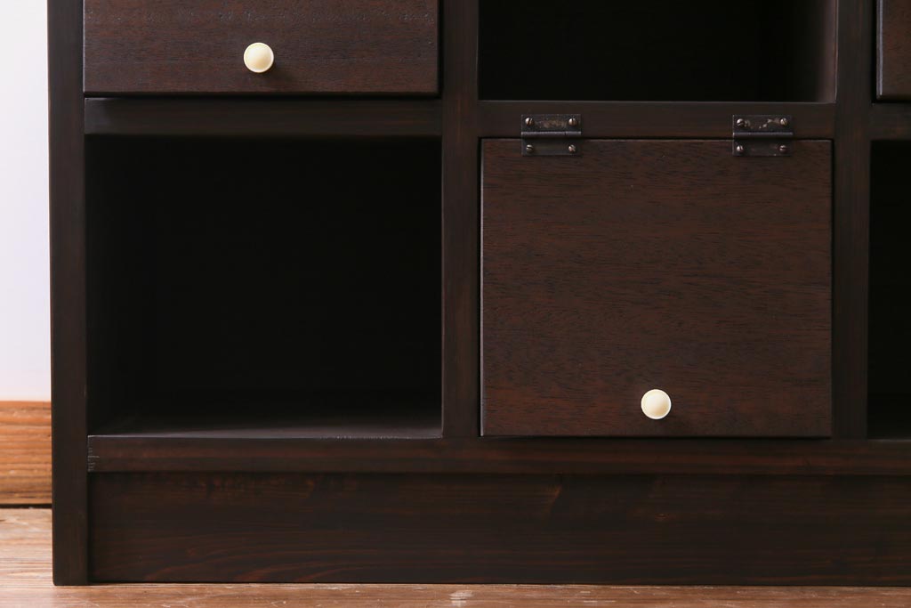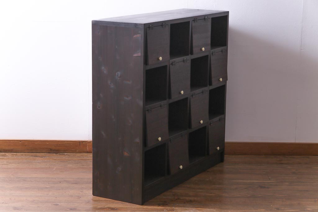 ラフジュ工房オリジナル 白い取っ手がレトロで可愛らしいパタパタ扉のマス目棚(収納棚、下駄箱)です。
