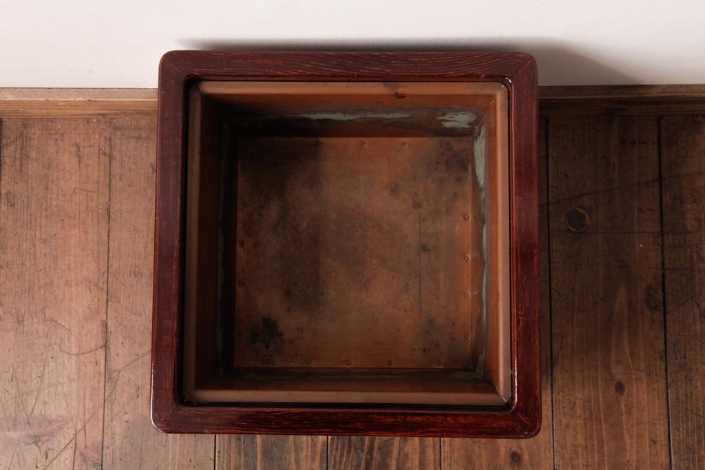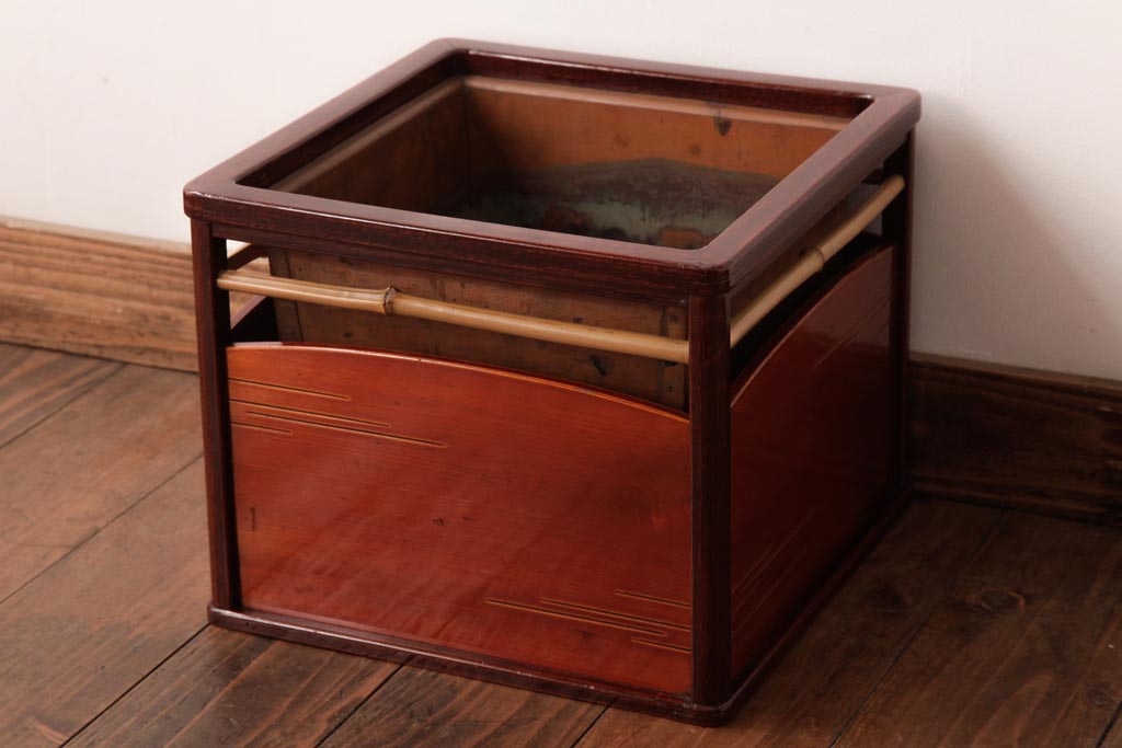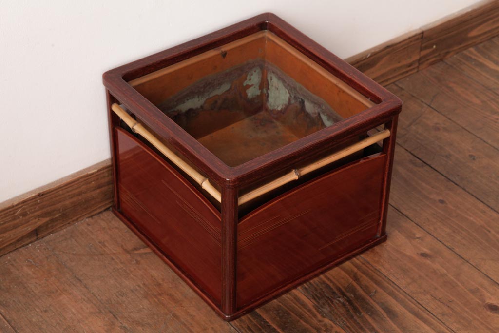 アンティーク雑貨 古民具 春慶塗 節竹の入ったデザインが魅力的な箱火鉢(木製火鉢、角火鉢)(3)