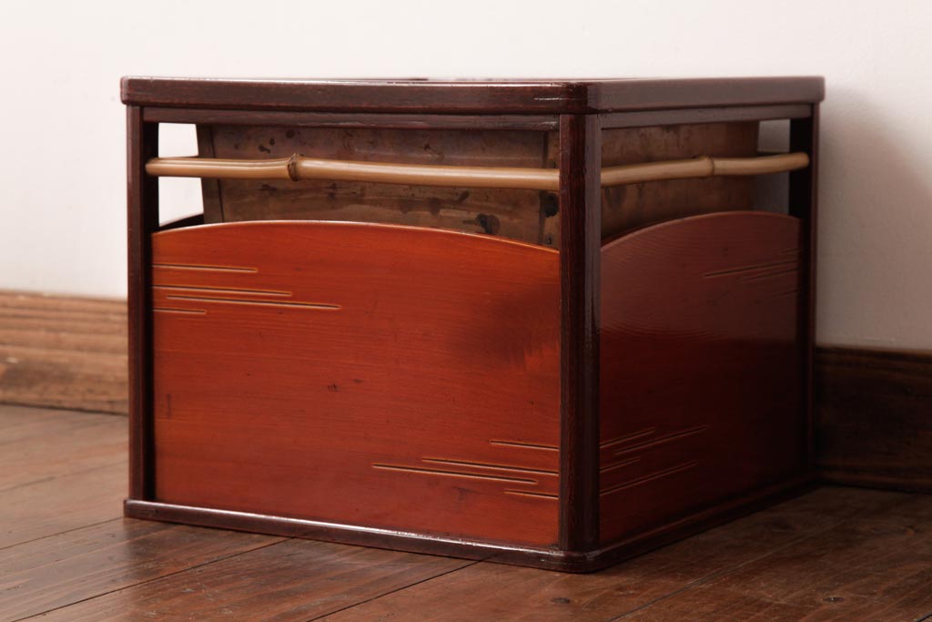 古民具 春慶塗 節竹の入ったデザインが魅力的な箱火鉢(木製火鉢、角火鉢)(3)です。