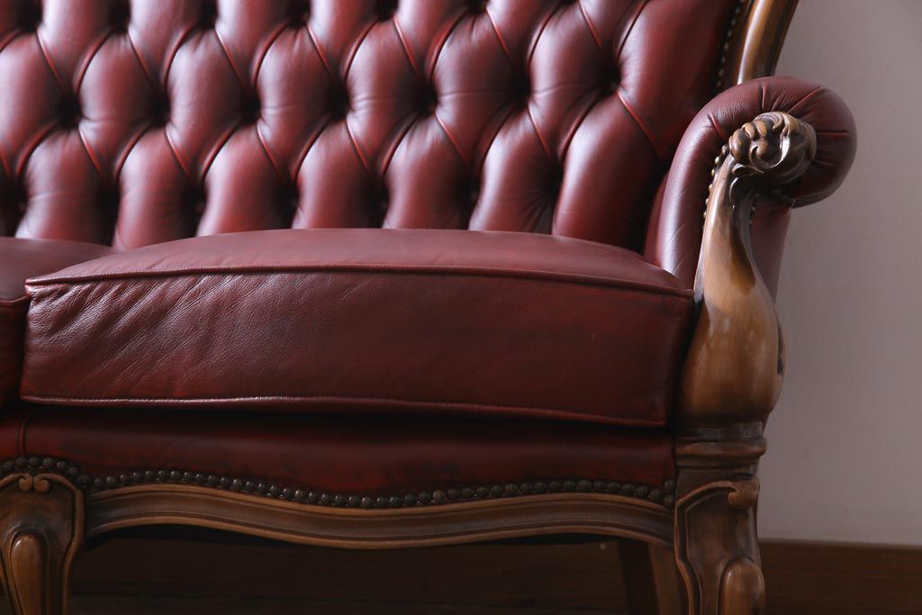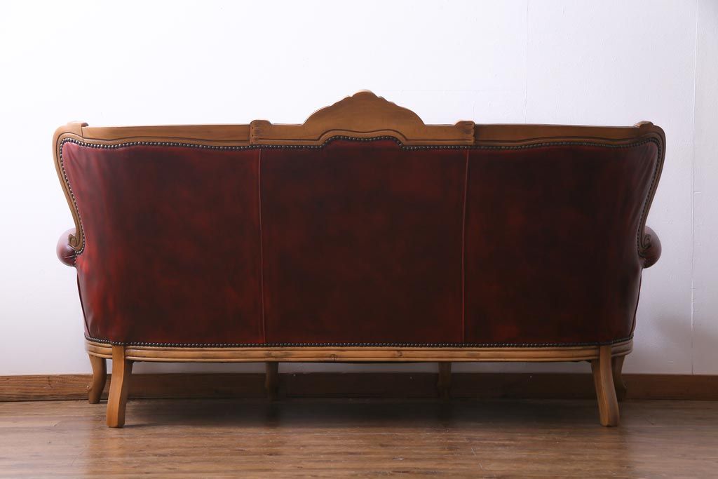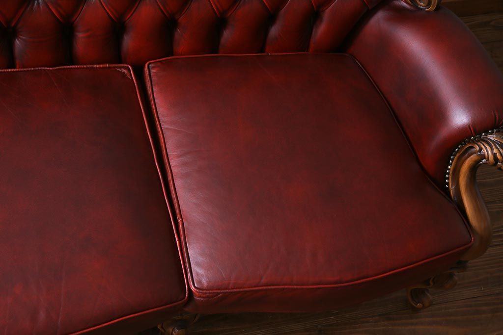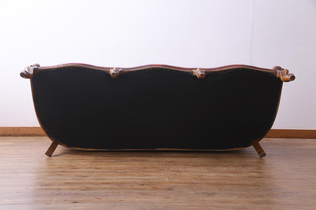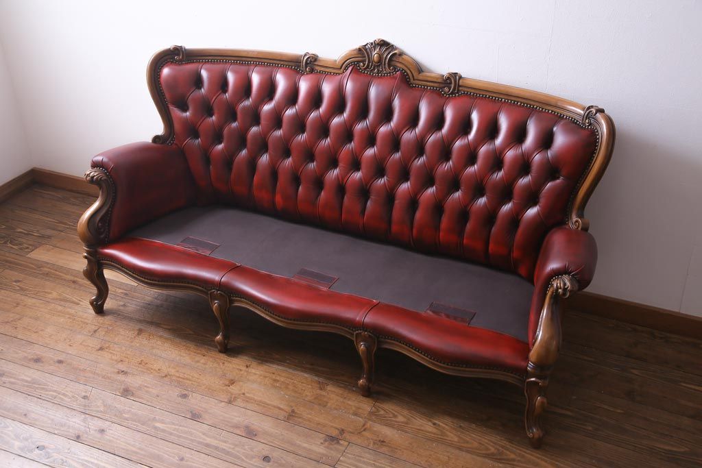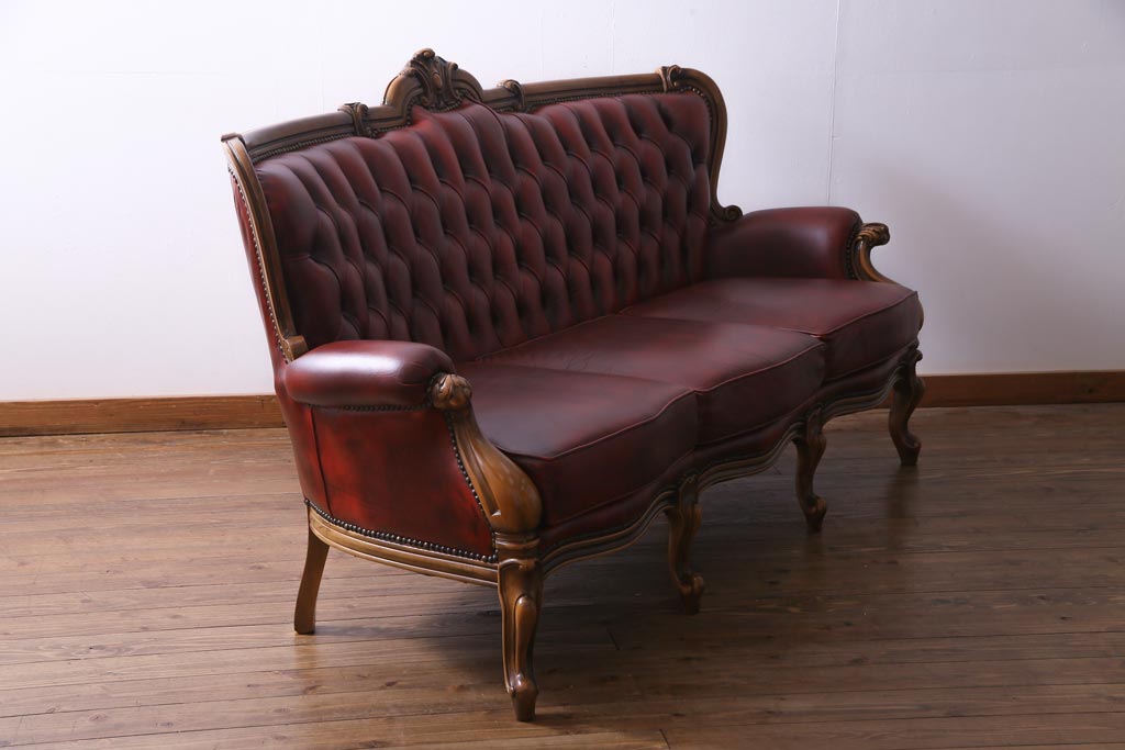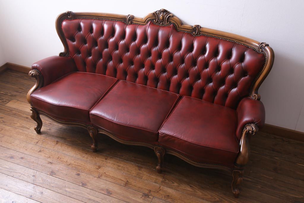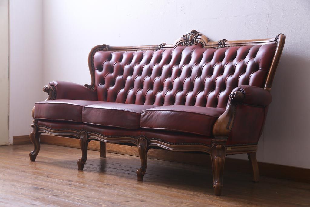 中古 イタリア Orsi Angelo社 本革 抜群の存在感を放つエレガントな3人掛けソファです。 落ち着いた赤いレザーの風合いが魅力的な イタリア、Orsi Angelo社製の3人掛けソファです。 生地に本革が使われており、 使い込んでからも味わいが楽しめます。 クラシカルな装飾性たっぷりで堂々としながらも 重厚感だけでなく品のある雰囲気が漂いますね。 エレガントな家具との相性の良い色合いの本革座面は、 イギリスアンティークでまとめたお部屋はもちろん、 ジャンクテイストやエキゾチックスタイルなど、 クールなお部屋作りにも活躍します。 存在感のあるインテリアとしていかがでしょうか。 【椅子の座り心地について】(身長161cmの女性スタッフの場合) クッションの硬さ:普通 座面の高さ:丁度いい 座面の広さ:広い アームの位置:丁度いい 背もたれの位置:背中全体 座面までの高さは座っていない状態の一番高い部分を測定しています。 弊社工房にて専門の職人が品質チェック・補修を行い、強度を高めていますので、ぐらつきもなく、安心してお使いいただけます。 座面生地は、オリジナルのままです。 使用感も少なく、中古品としてはとても状態の良いきれいなお品です。 使用上問題のあるダメージはありません。 ■アームまでの高さ 590mm ■座面の高さ 460mm ■重量 約38kg