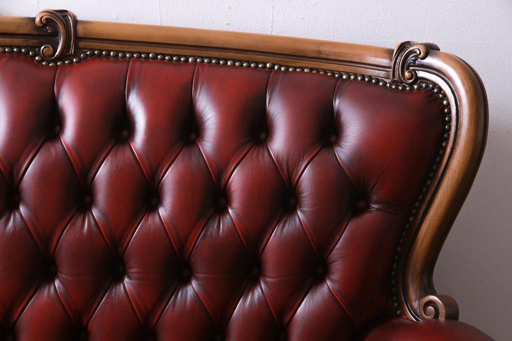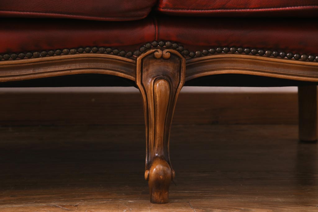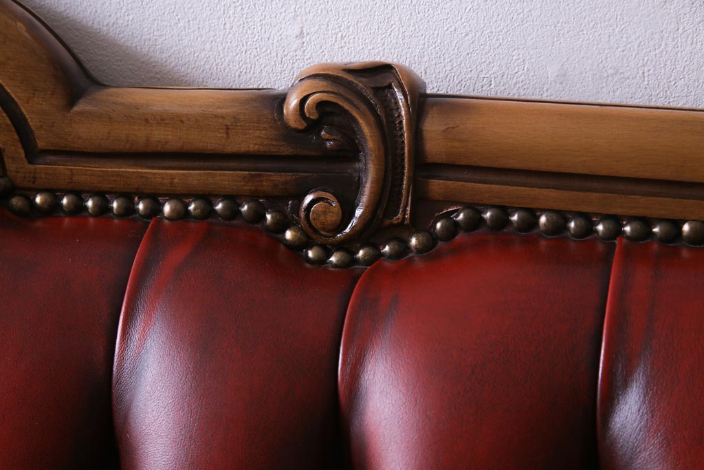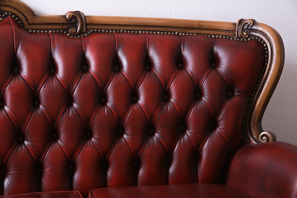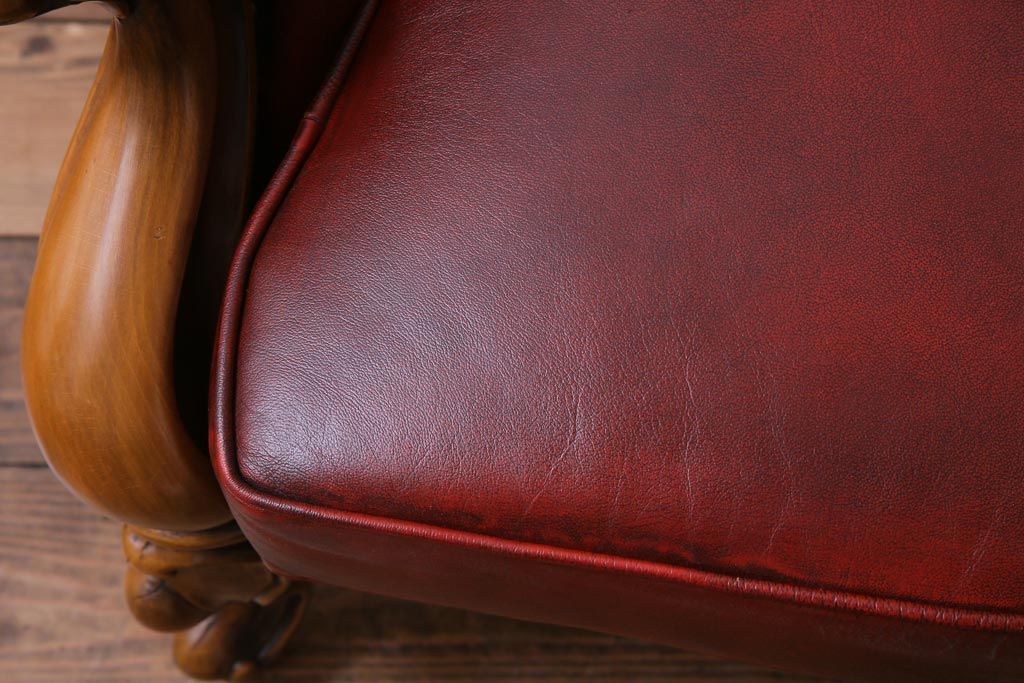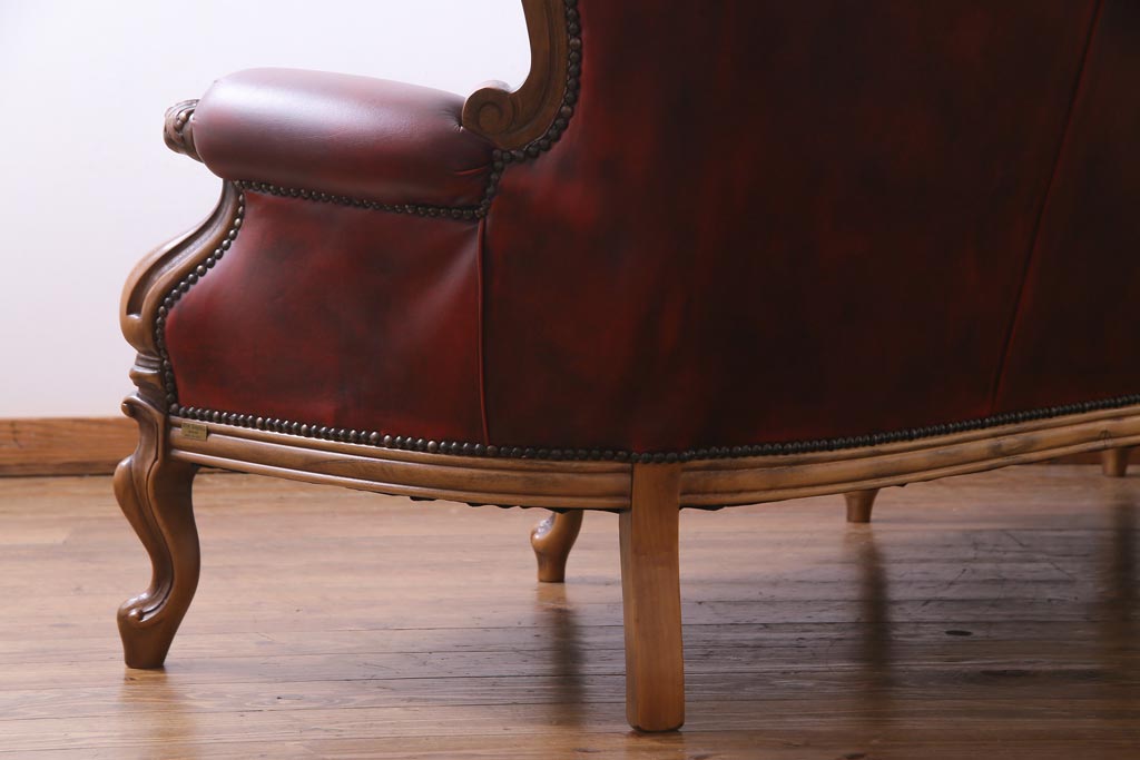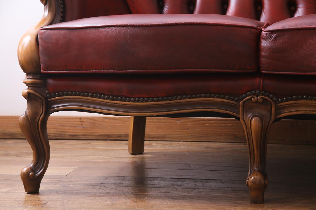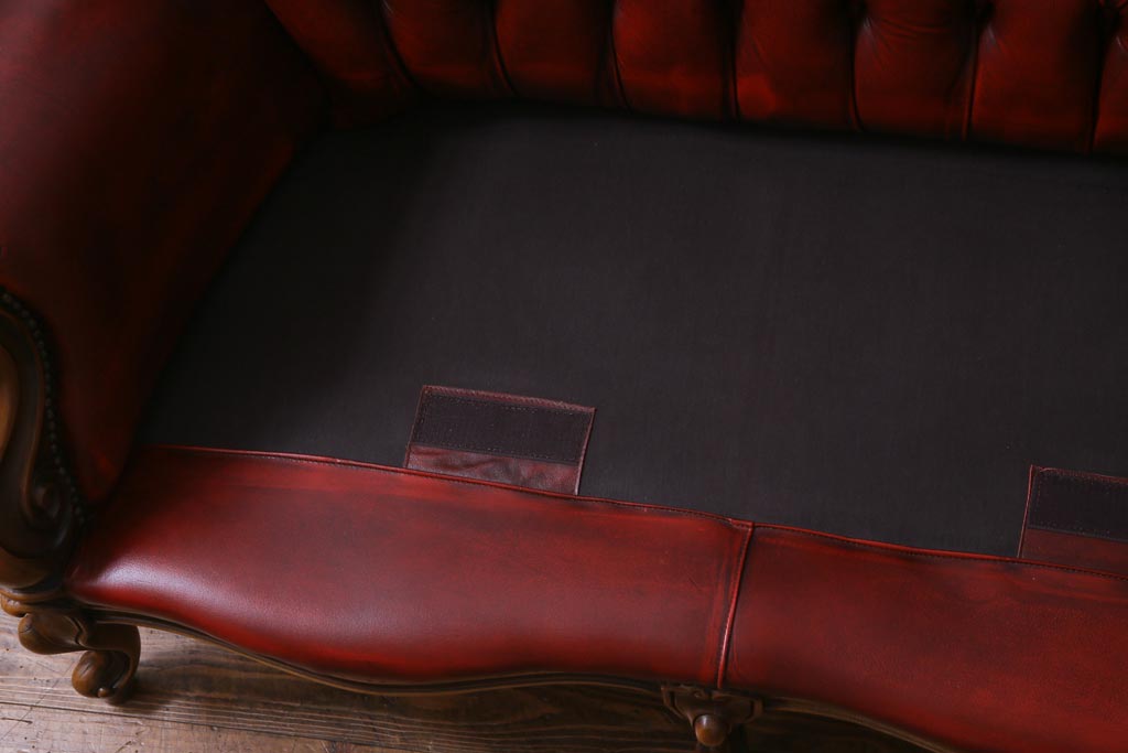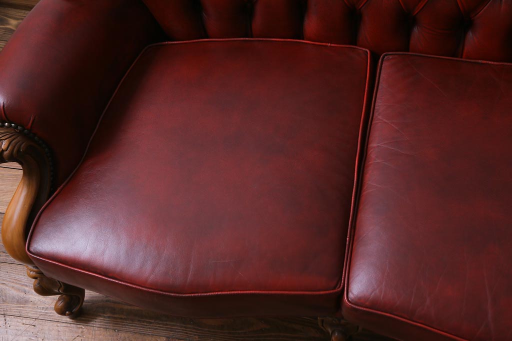 中古 イタリア Orsi Angelo社 本革 抜群の存在感を放つエレガントな3人掛けソファです。 落ち着いた赤いレザーの風合いが魅力的な イタリア、Orsi Angelo社製の3人掛けソファです。 生地に本革が使われており、 使い込んでからも味わいが楽しめます。 クラシカルな装飾性たっぷりで堂々としながらも 重厚感だけでなく品のある雰囲気が漂いますね。 エレガントな家具との相性の良い色合いの本革座面は、 イギリスアンティークでまとめたお部屋はもちろん、 ジャンクテイストやエキゾチックスタイルなど、 クールなお部屋作りにも活躍します。 存在感のあるインテリアとしていかがでしょうか。 【椅子の座り心地について】(身長161cmの女性スタッフの場合) クッションの硬さ:普通 座面の高さ:丁度いい 座面の広さ:広い アームの位置:丁度いい 背もたれの位置:背中全体 座面までの高さは座っていない状態の一番高い部分を測定しています。 弊社工房にて専門の職人が品質チェック・補修を行い、強度を高めていますので、ぐらつきもなく、安心してお使いいただけます。 座面生地は、オリジナルのままです。 使用感も少なく、中古品としてはとても状態の良いきれいなお品です。 使用上問題のあるダメージはありません。 ■アームまでの高さ 590mm ■座面の高さ 460mm ■重量 約38kg