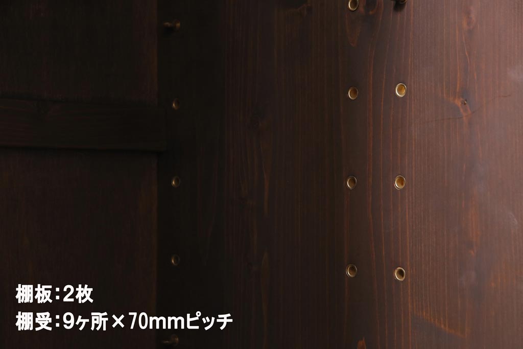 棚板は取り外しできます。棚板は2枚あります。棚受けは9ヶ所、70mmピッチで調整できます。棚幅サイズのものが1枚の作りです。