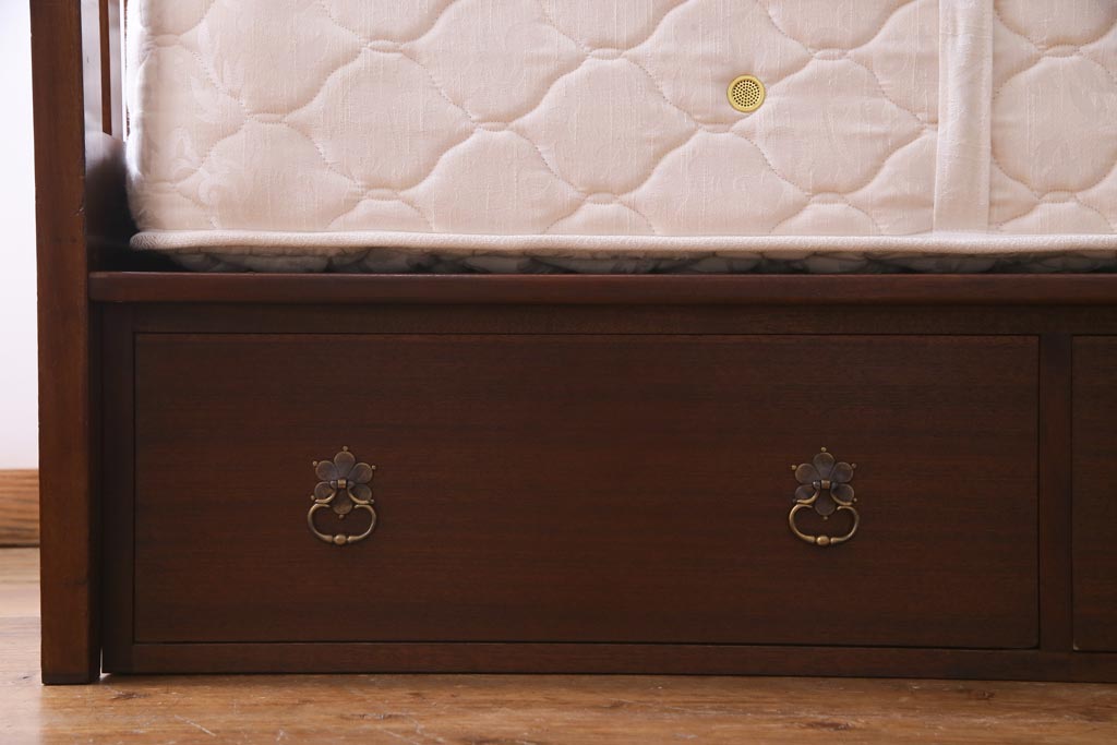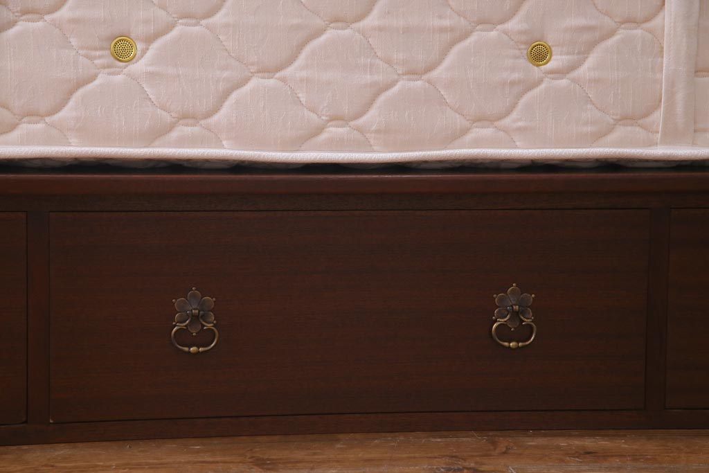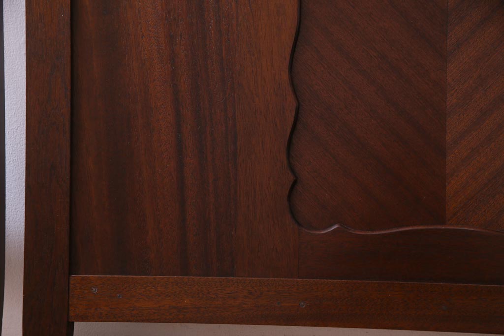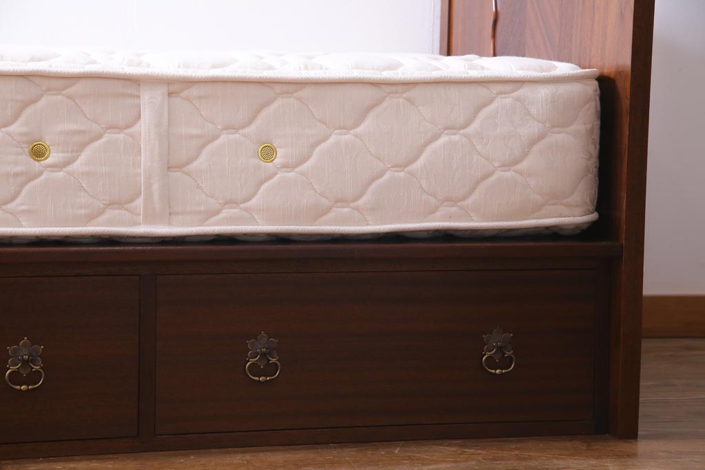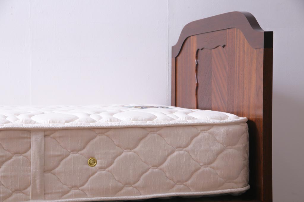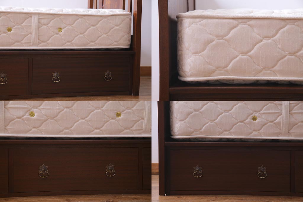 中古 シモンズ社製マットレス付き マホガニー材突板仕上げ パーケットで作られたデザインが魅力的な高級木製ベッドです。