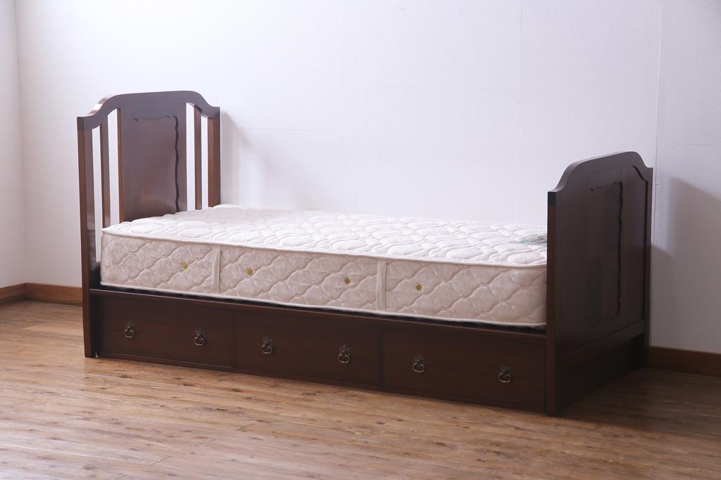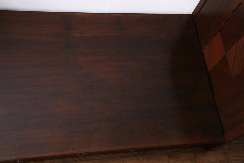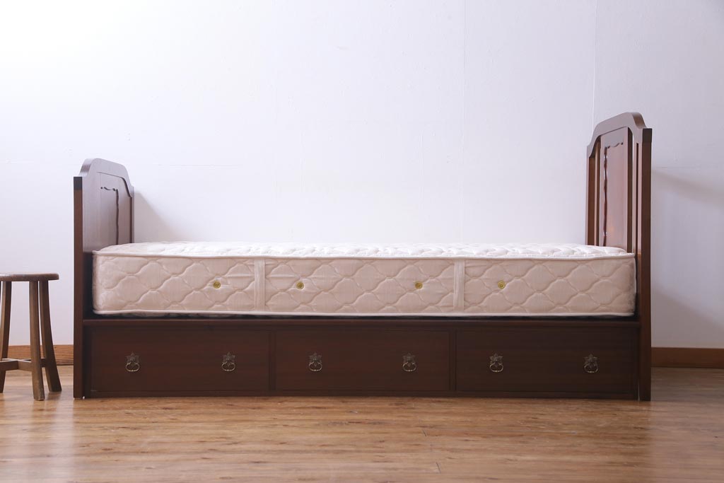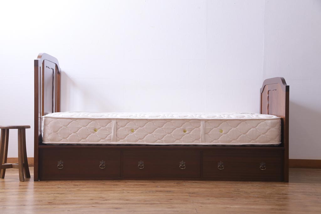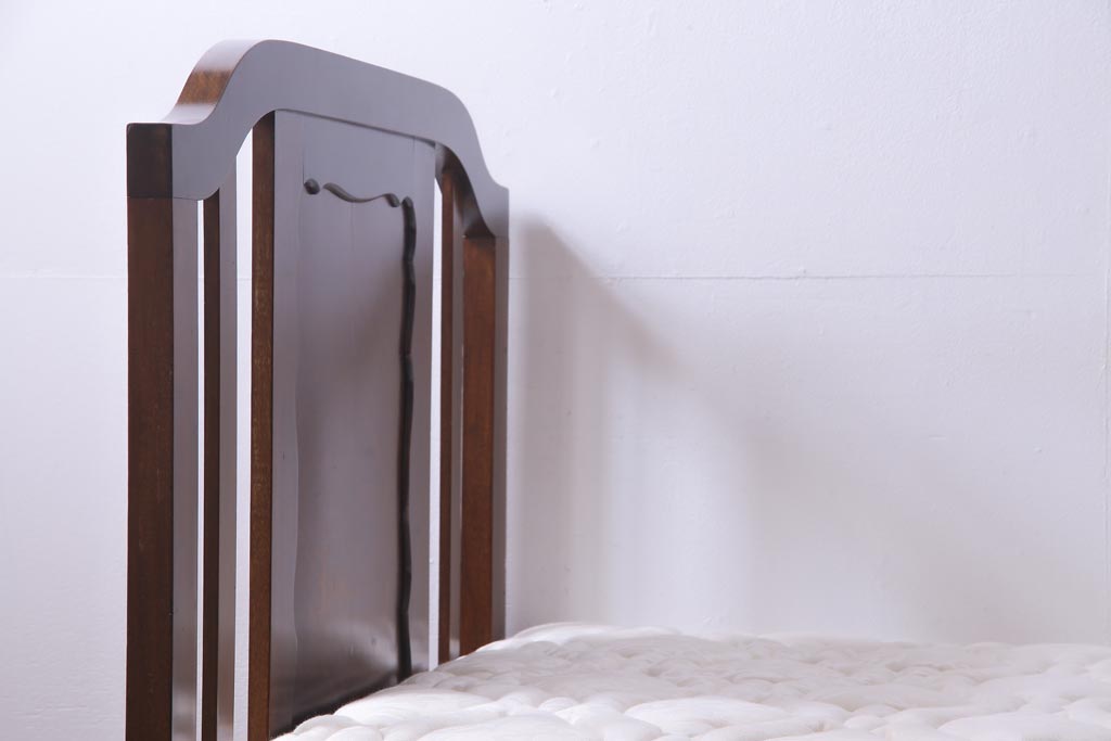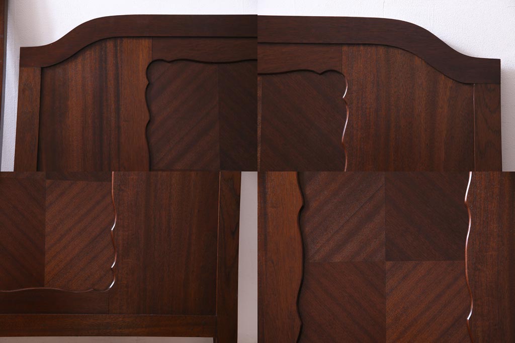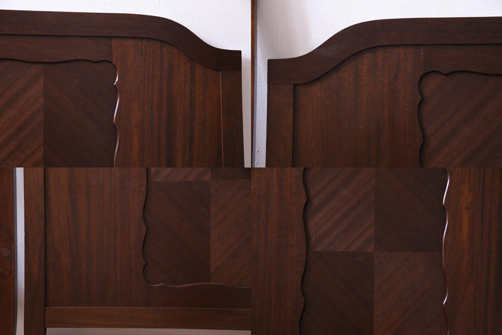 中古 シモンズ社製マットレス付き マホガニー材突板仕上げ パーケットで作られたデザインが魅力的な高級木製ベッドです。