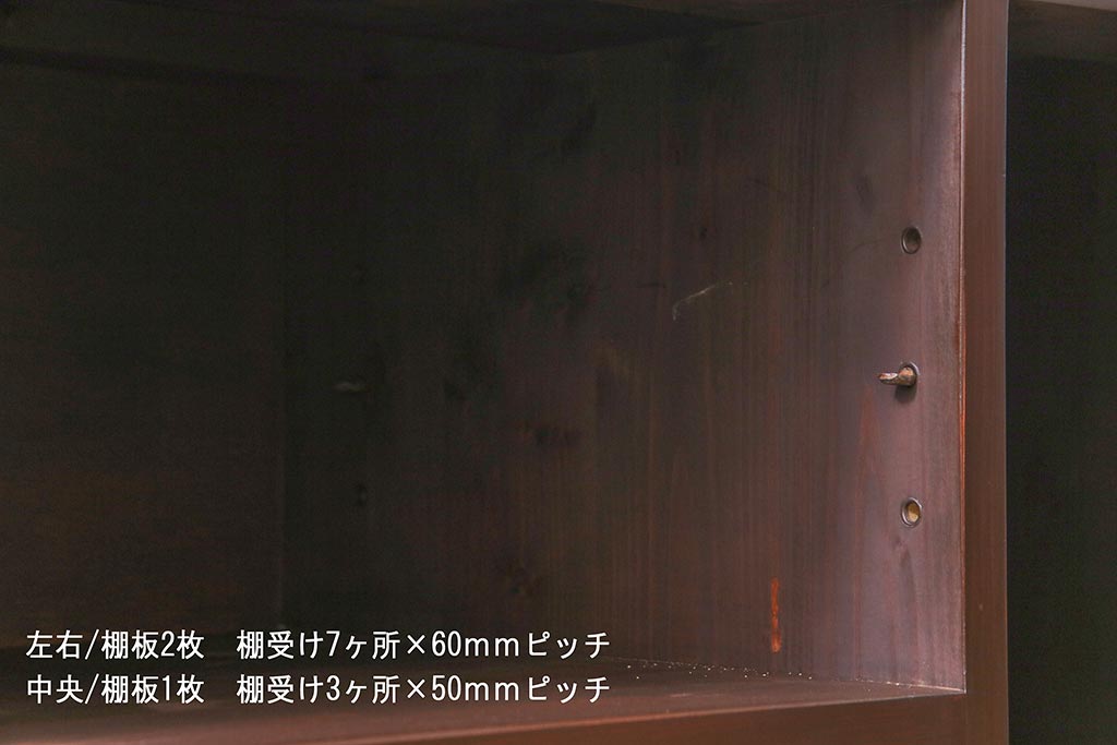 棚板は取り外しできます。棚板は計5枚あります。左右各2枚・棚受けは7ヶ所・60mmピッチ、中央1枚・棚受けは3ヶ所・50mmピッチで調整できます。各棚幅サイズのものが1枚の作りです。