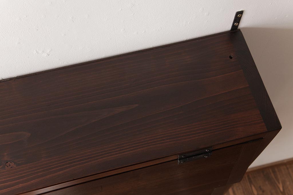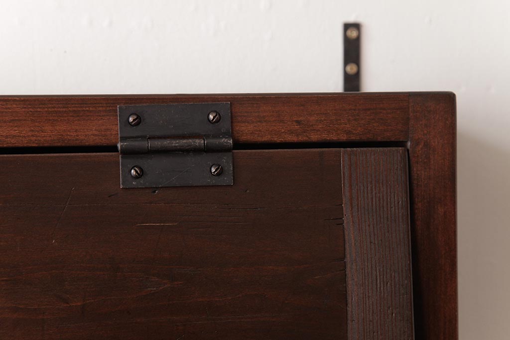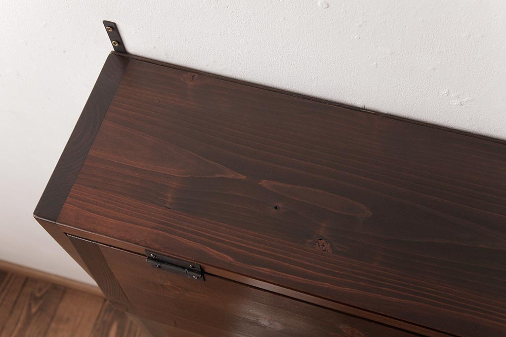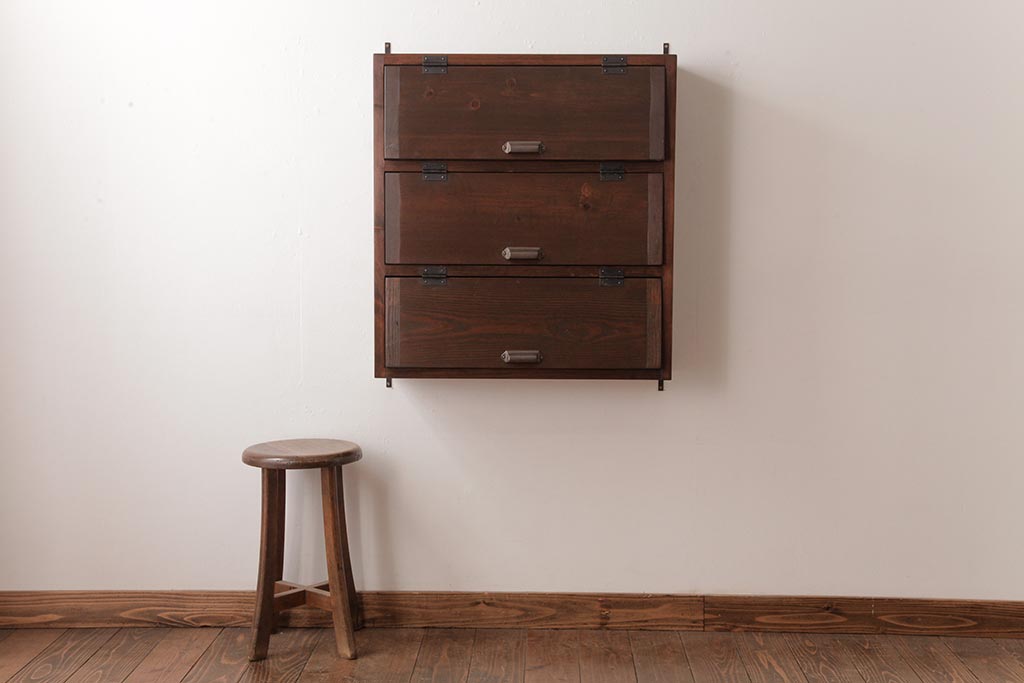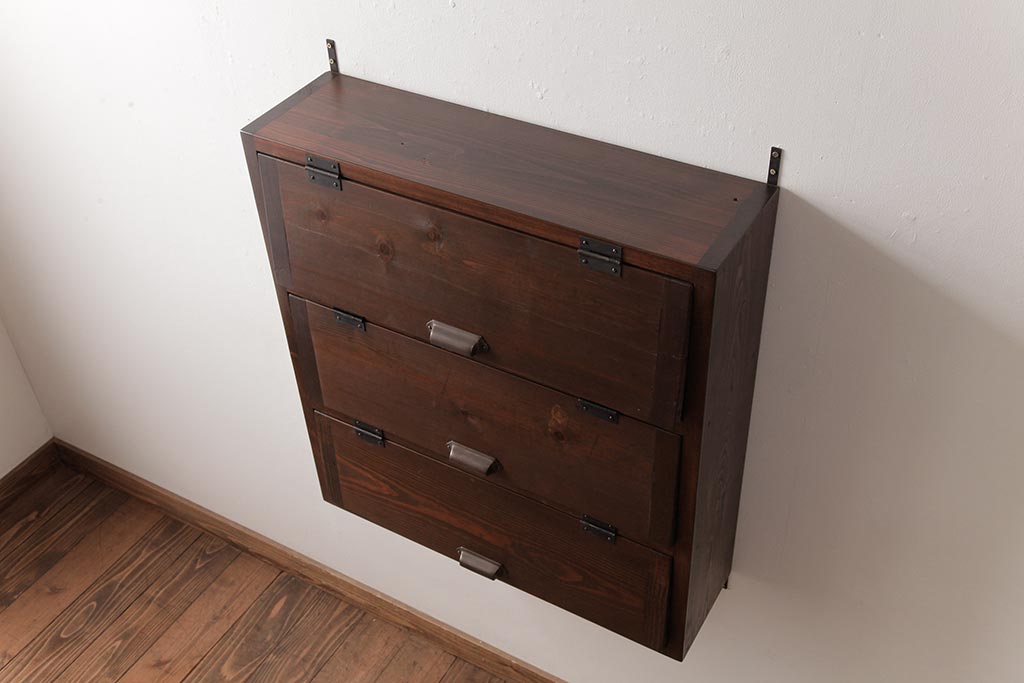 ラフジュ工房オリジナル 古い木の味わいが楽しめるパタパタ扉の壁掛け収納棚(ウォールシェルフ)(1)です。