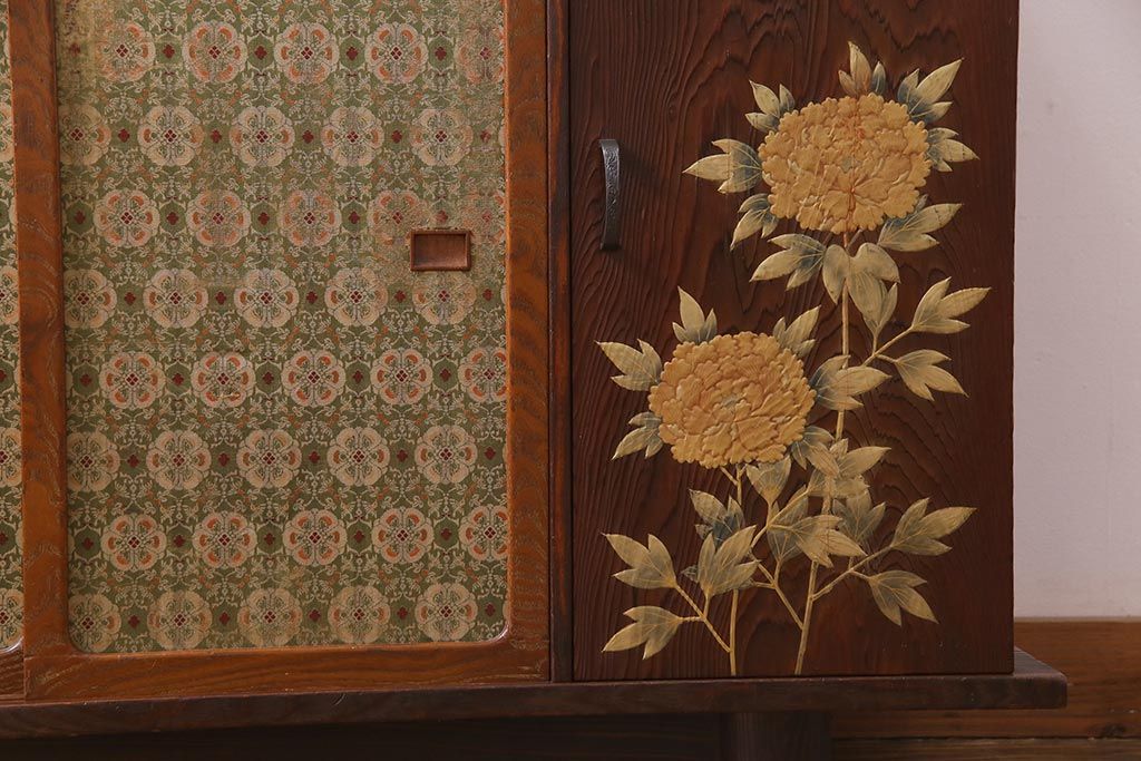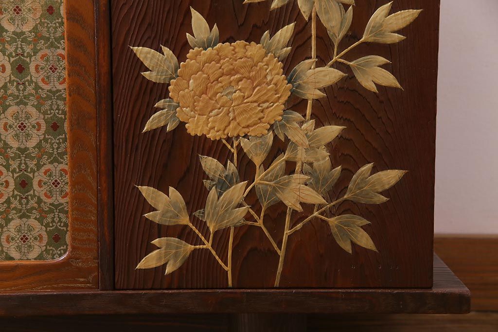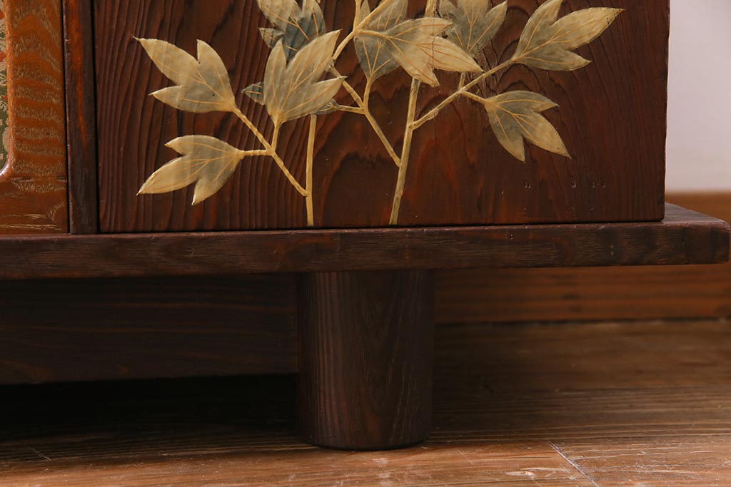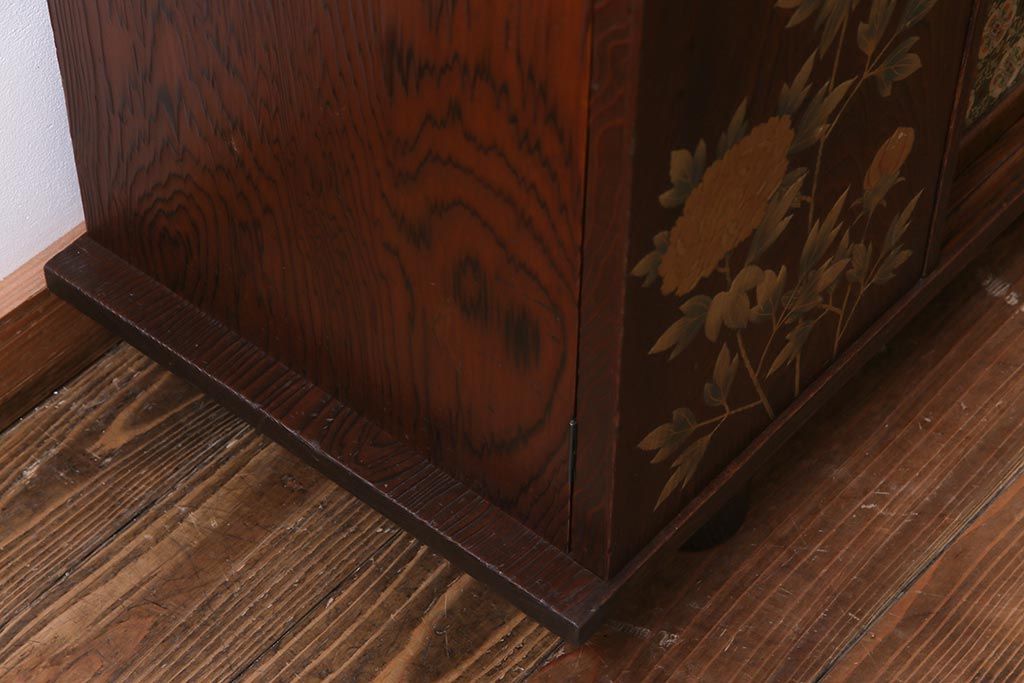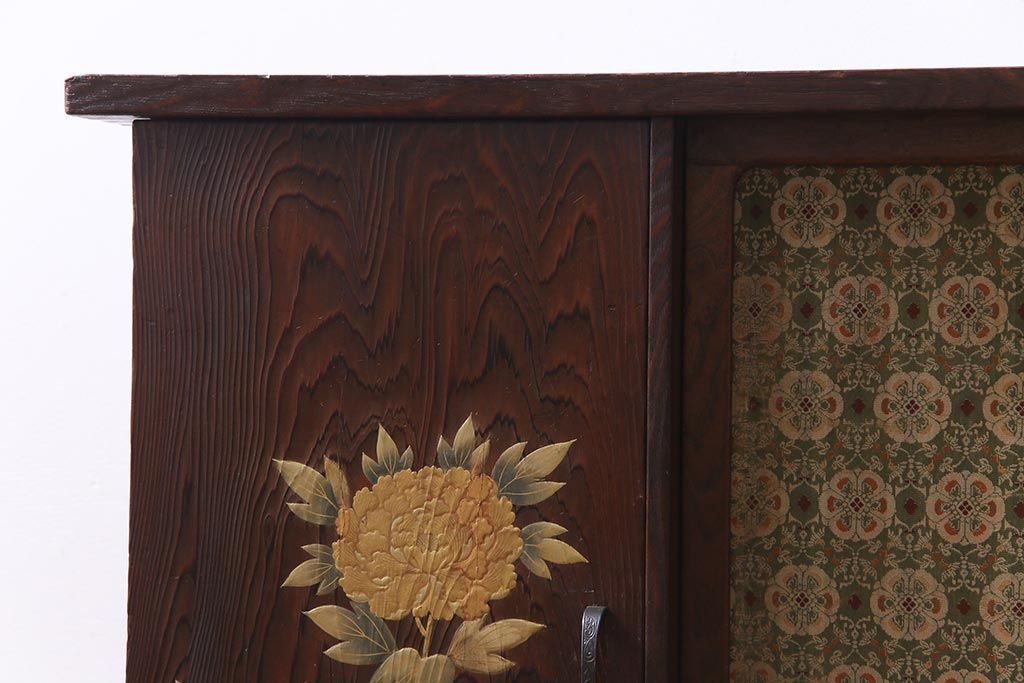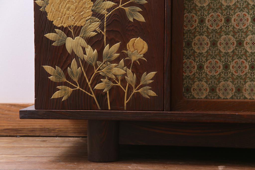 ビンテージ 工芸家具 高級杉材使用 御物緑地花鳥梅花文錦 漆塗り 牡丹の蒔絵が美しい茶箪笥(収納棚)(定価約50万円)です。