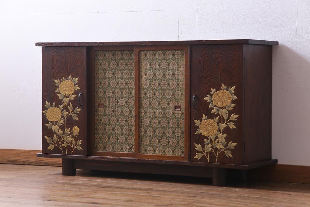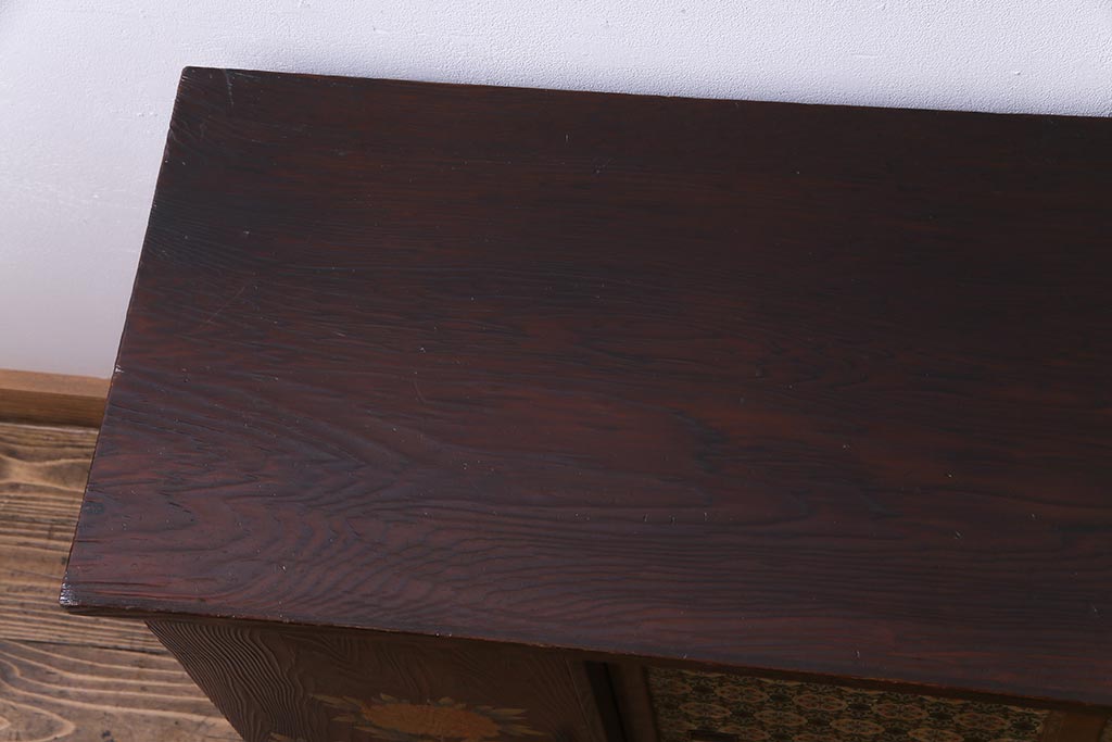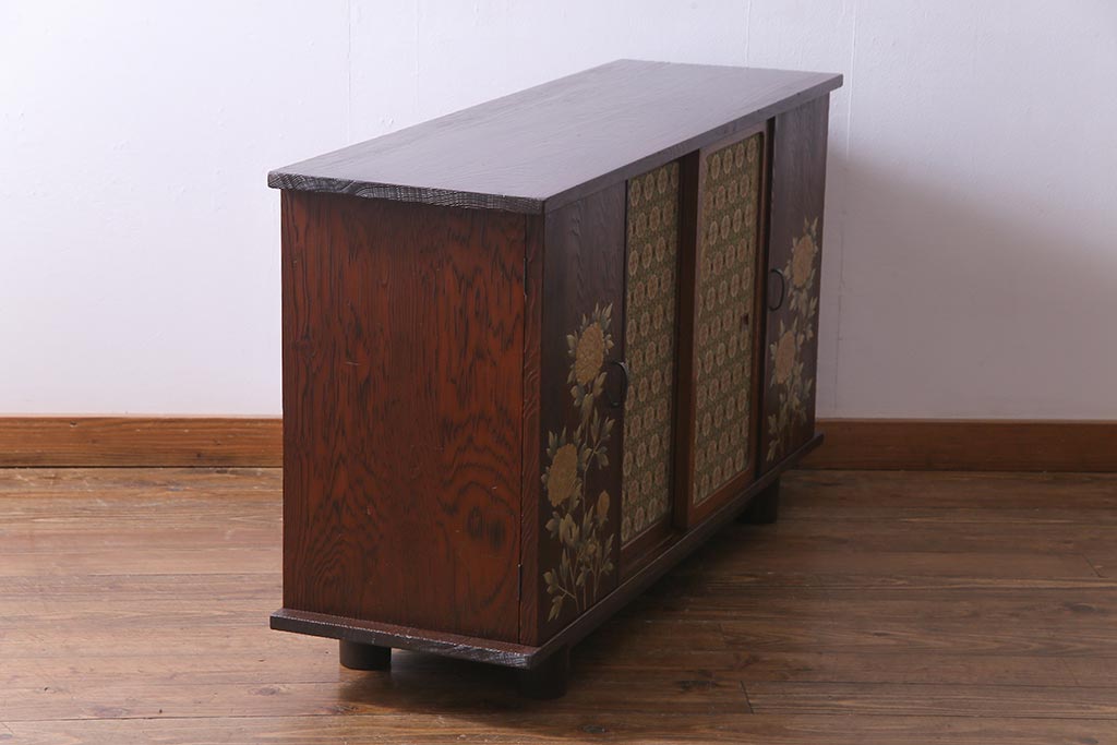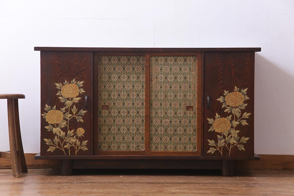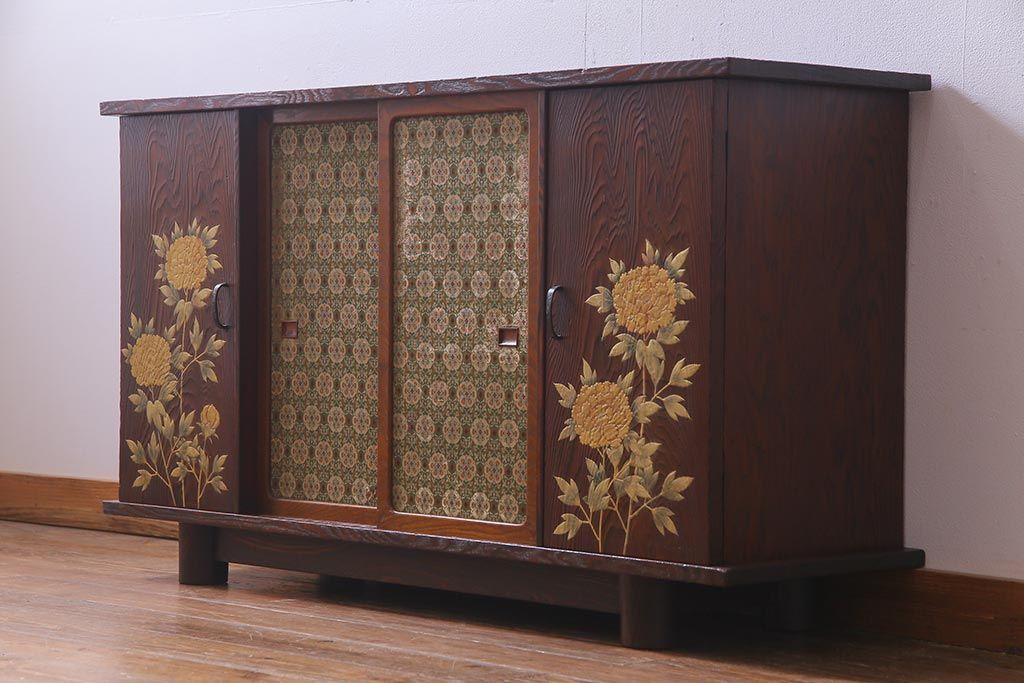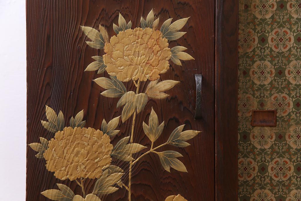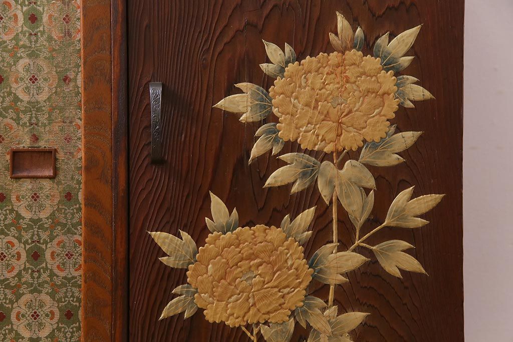 ビンテージ 工芸家具 高級杉材使用 御物緑地花鳥梅花文錦 漆塗り 牡丹の蒔絵が美しい茶箪笥(収納棚)(定価約50万円)です。