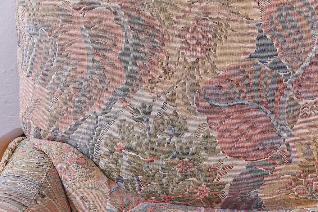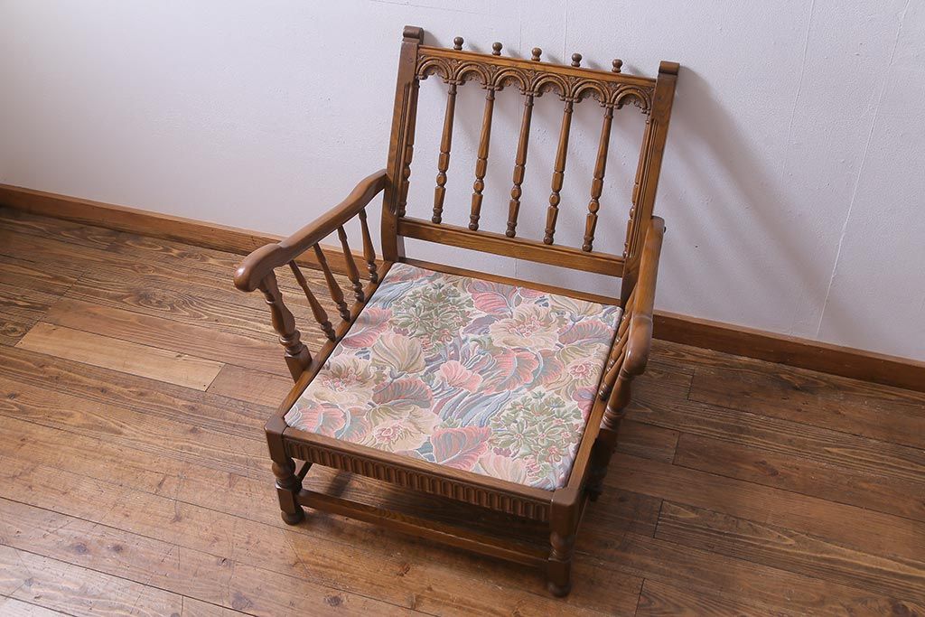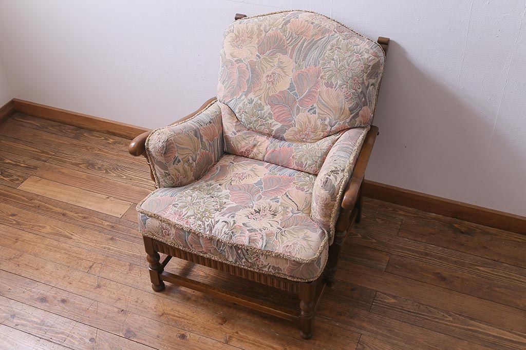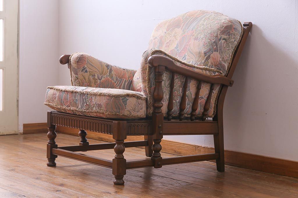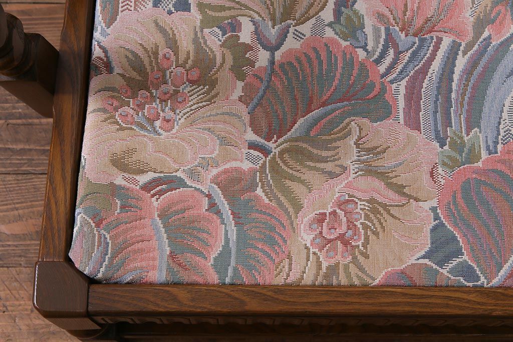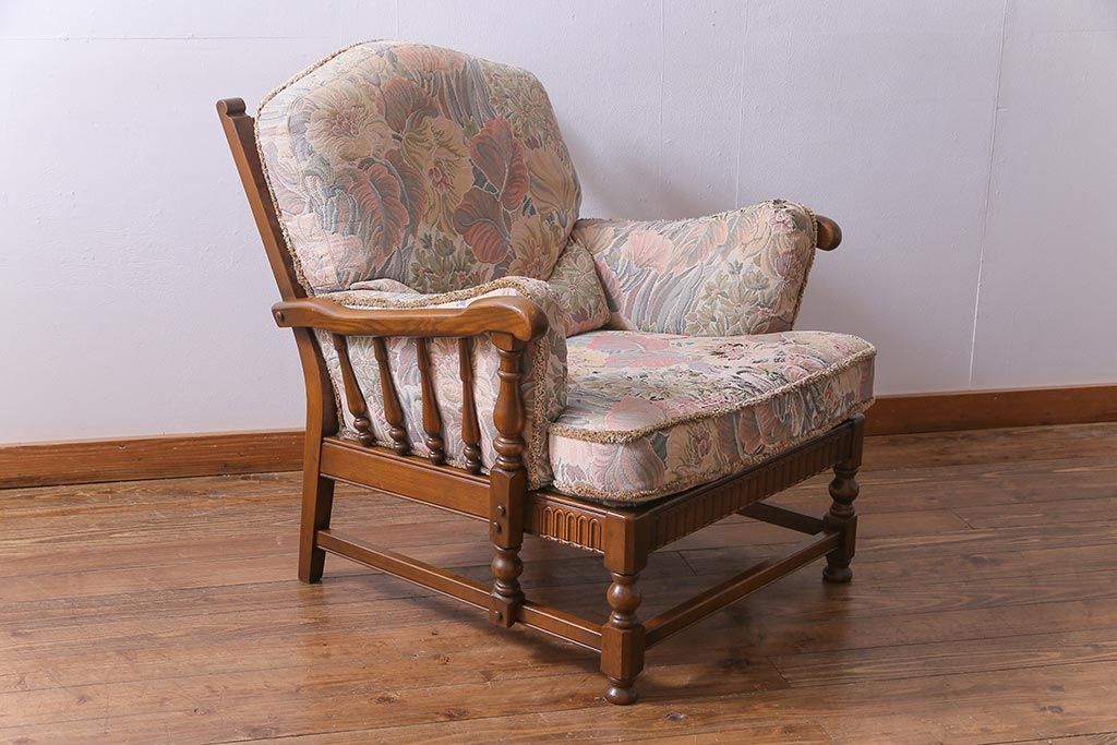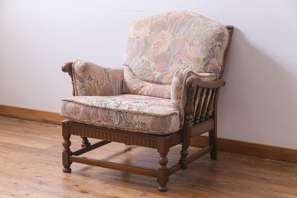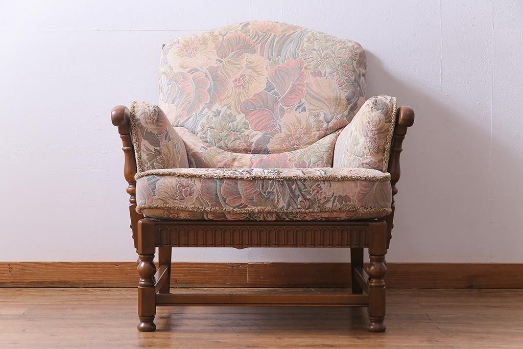 アンティーク家具 ERCOL(アーコール) York Minster 花柄のファブリックと凝った彫刻を楽しめる一人掛けソファ(1)
