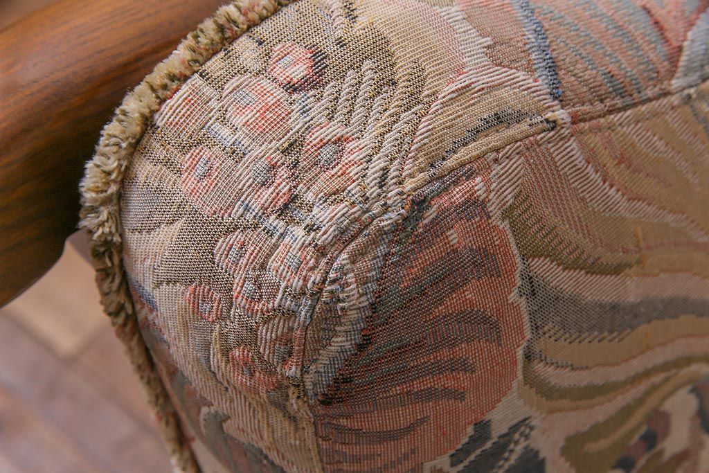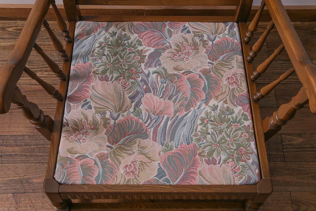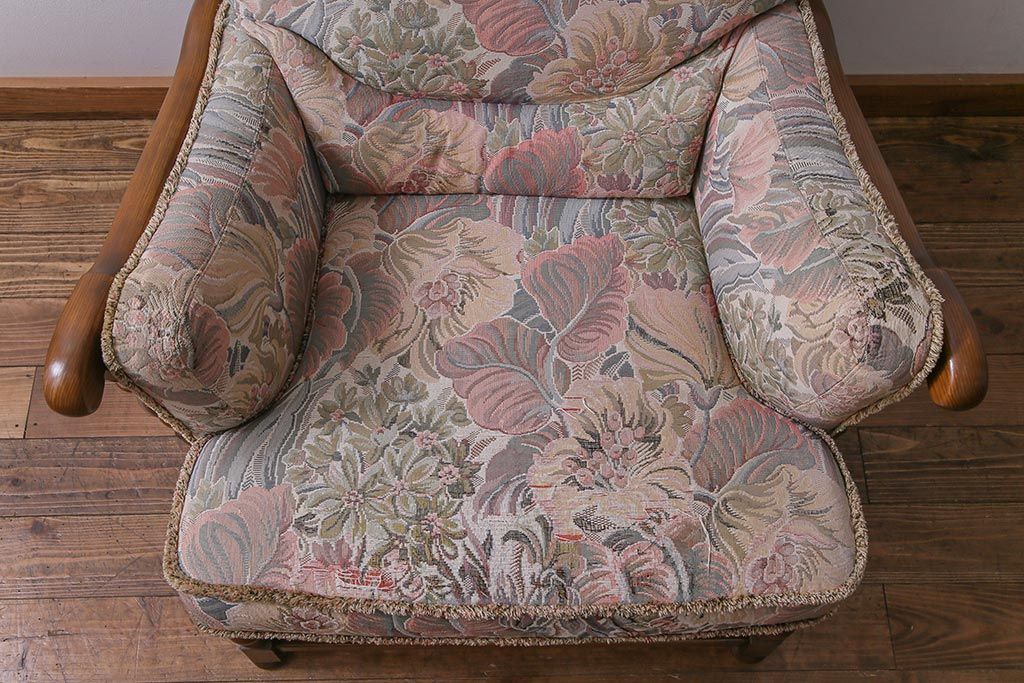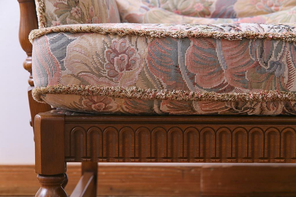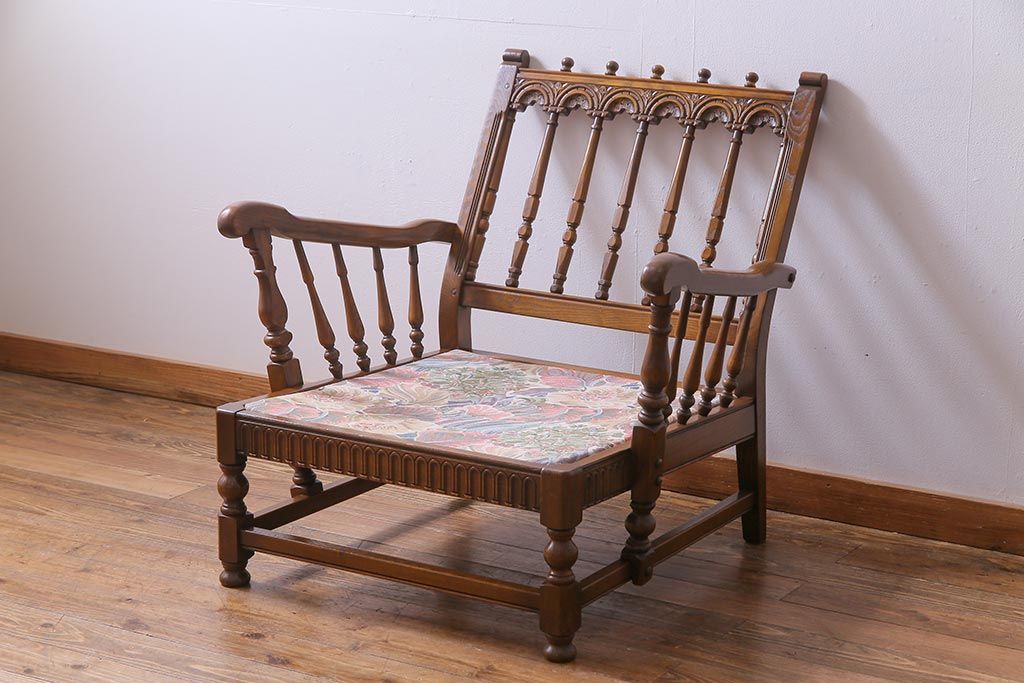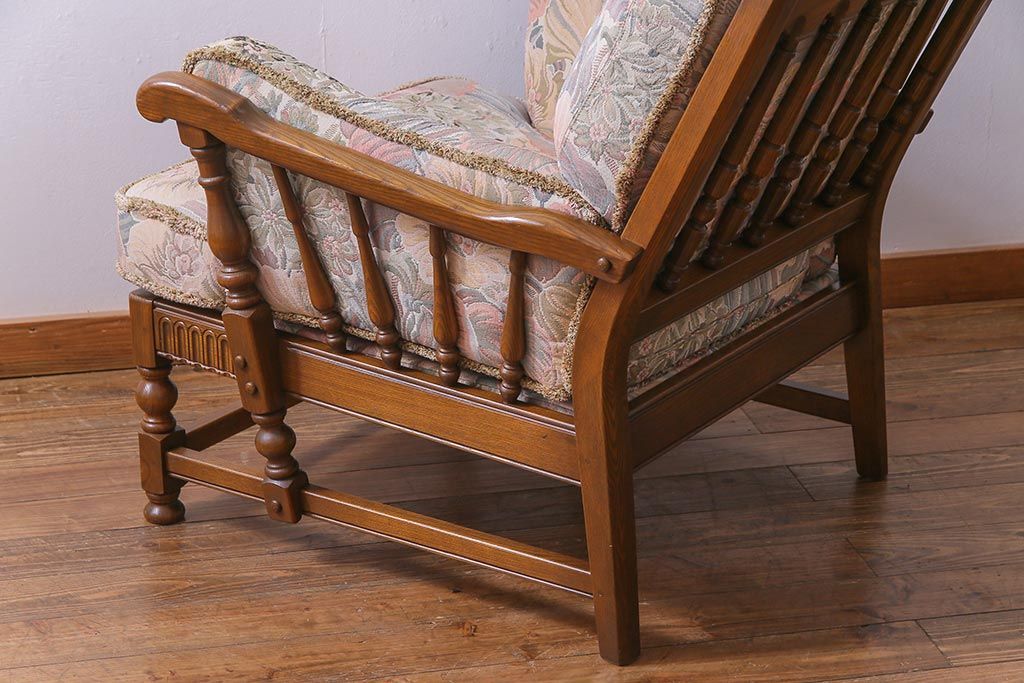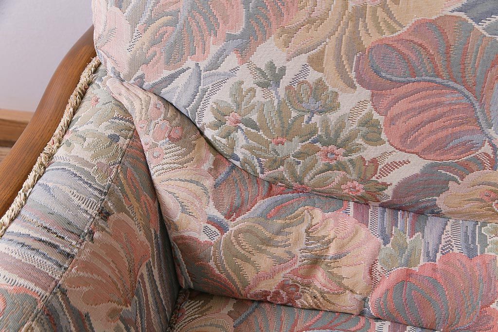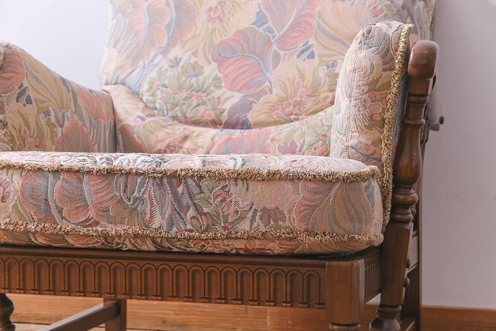 アンティーク家具 ERCOL(アーコール) York Minster 花柄のファブリックと凝った彫刻を楽しめる一人掛けソファ(1)