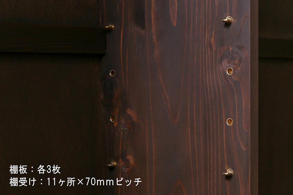 棚板は取り外しできます。棚板は各3枚あります。棚受けは11ヶ所、70mmピッチで調整できます。棚幅サイズのものが1枚の作りです。
