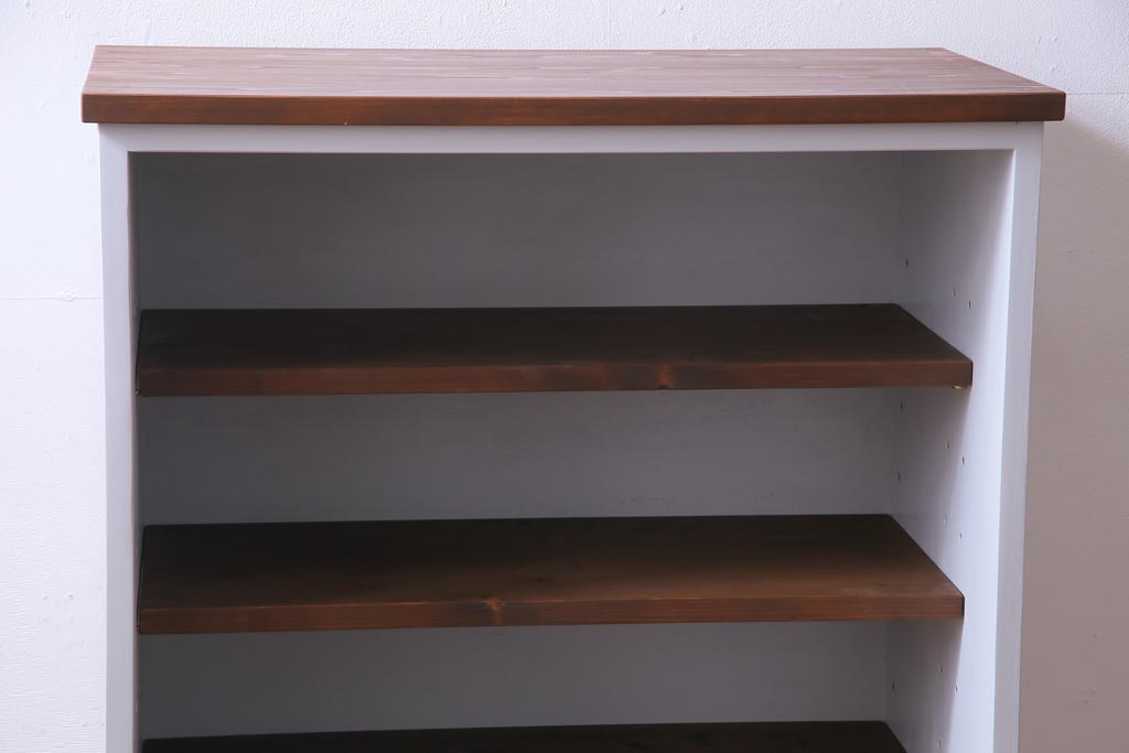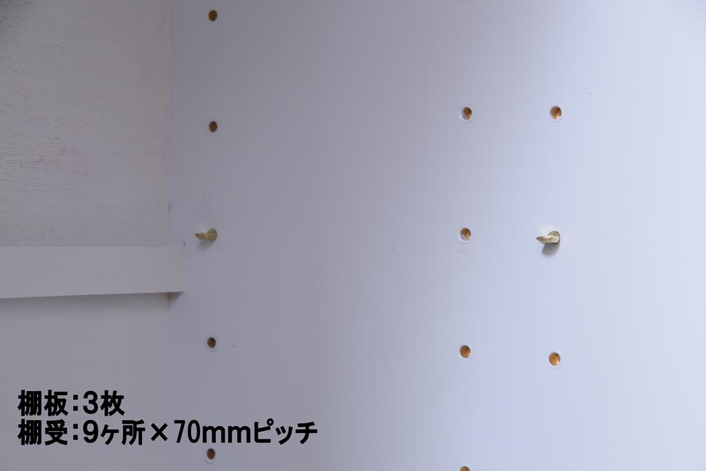 棚板は取り外しできます。棚板は3枚あります。棚受けは9ヶ所、70mmピッチで調整できます。棚幅サイズのものが1枚の作りです。