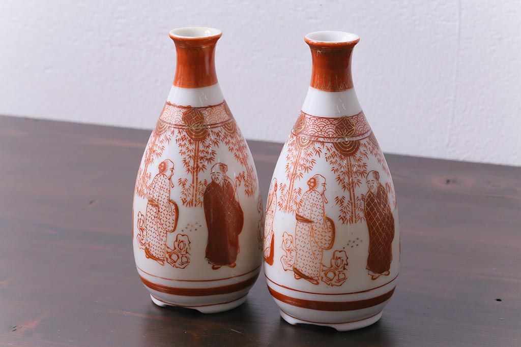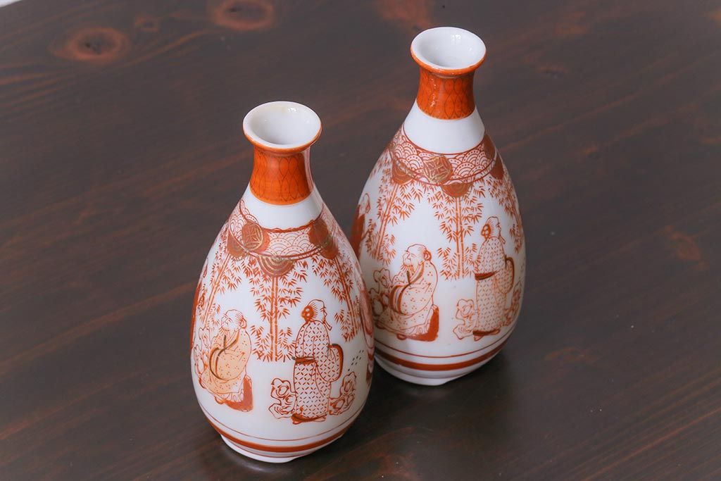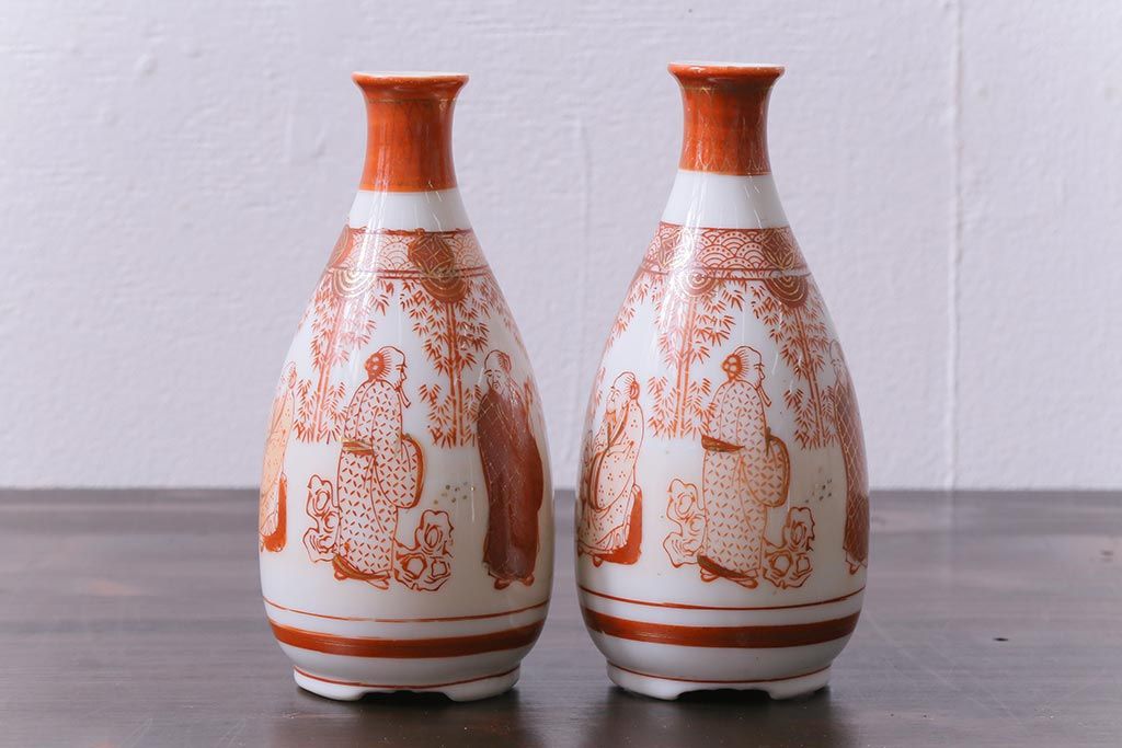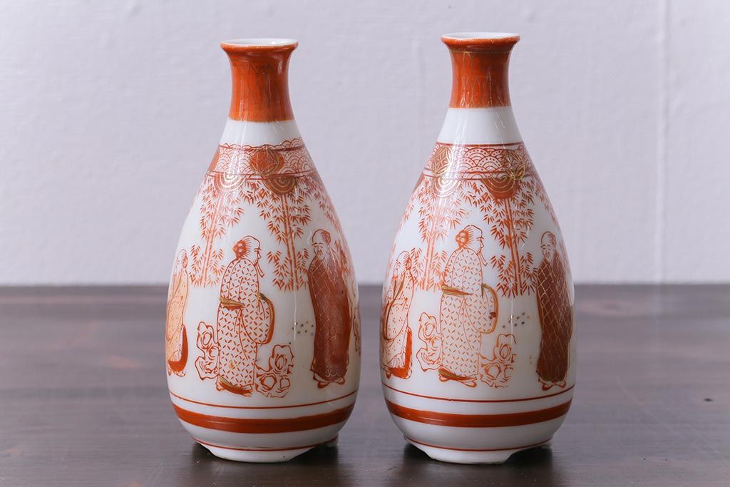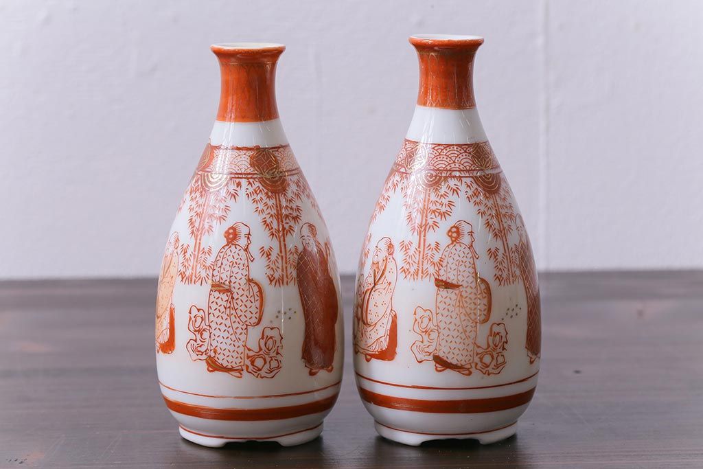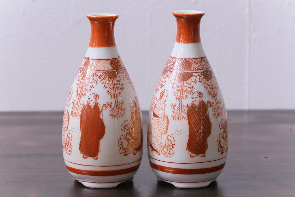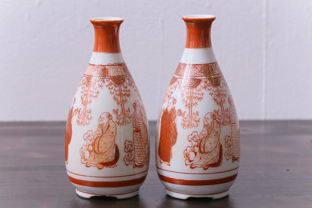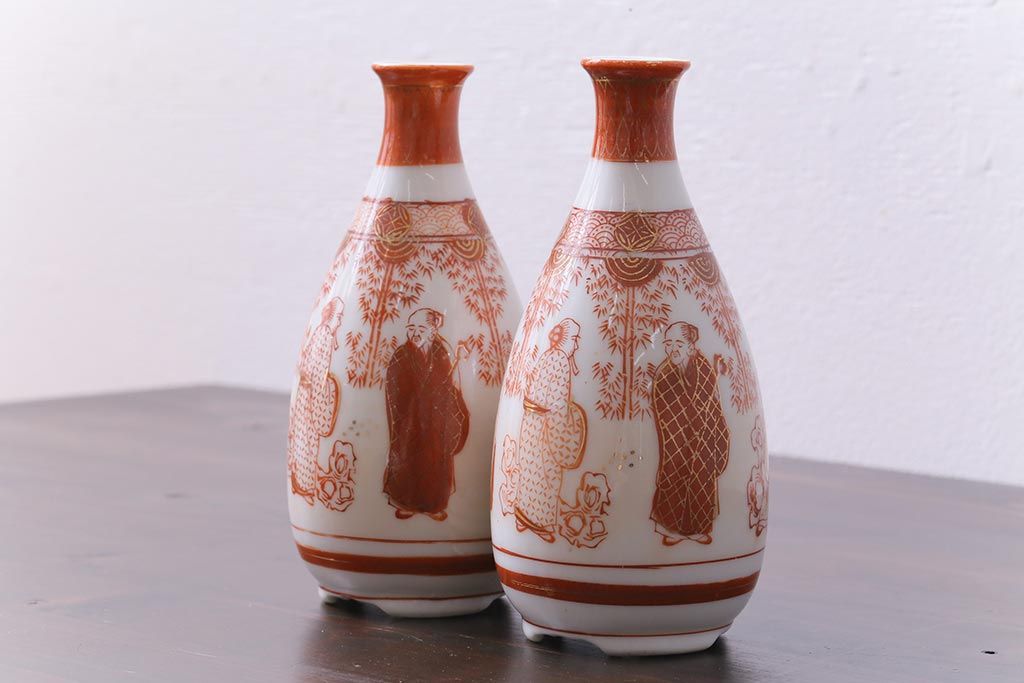 和製アンティーク 九谷焼 赤絵金彩 鮮やかな色と繊細なタッチの徳利(酒入れ、酒器、和食器)2個セット