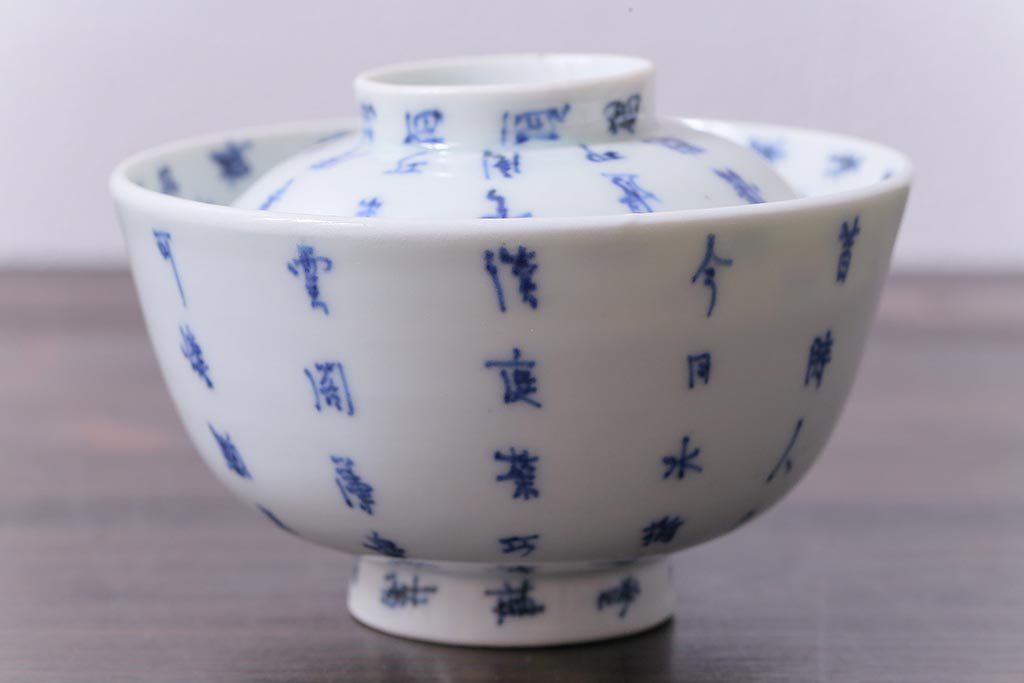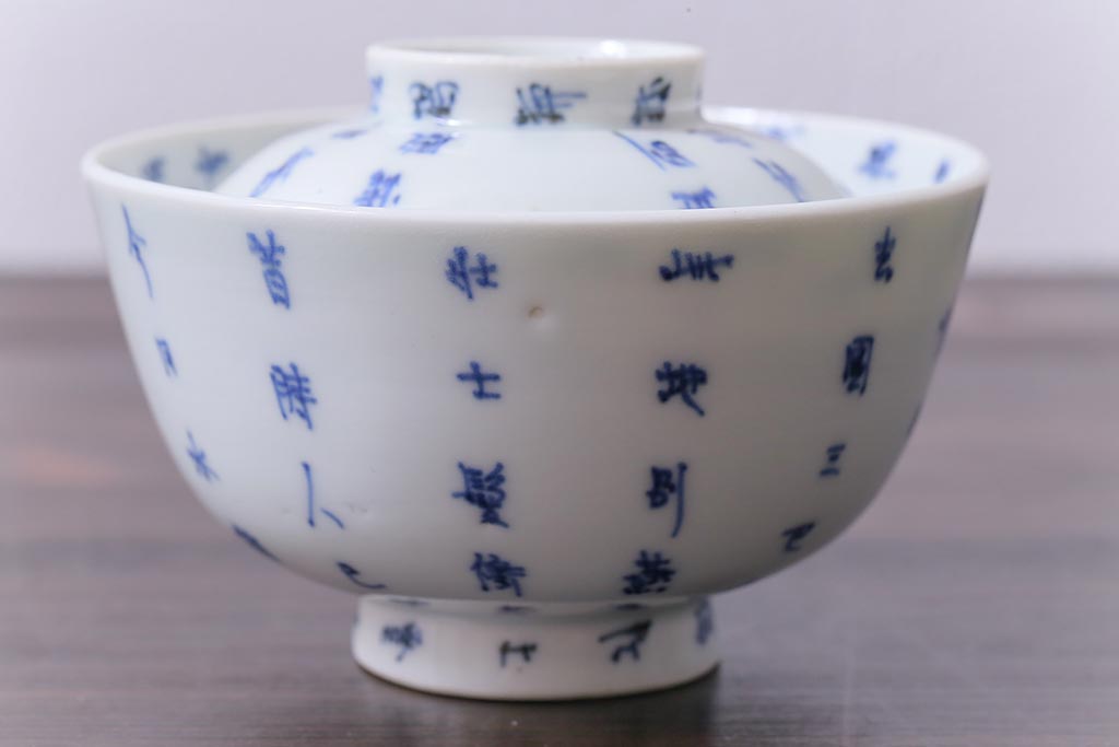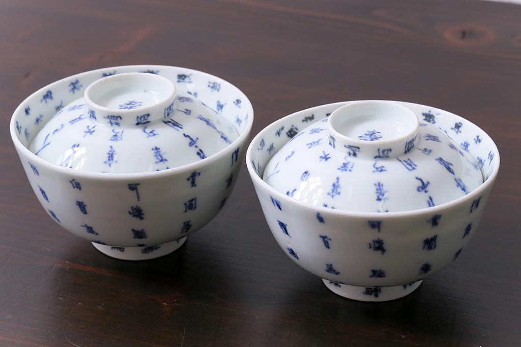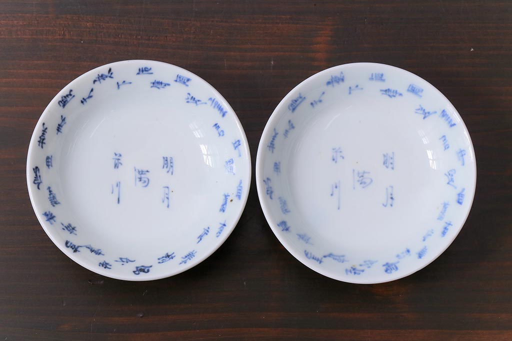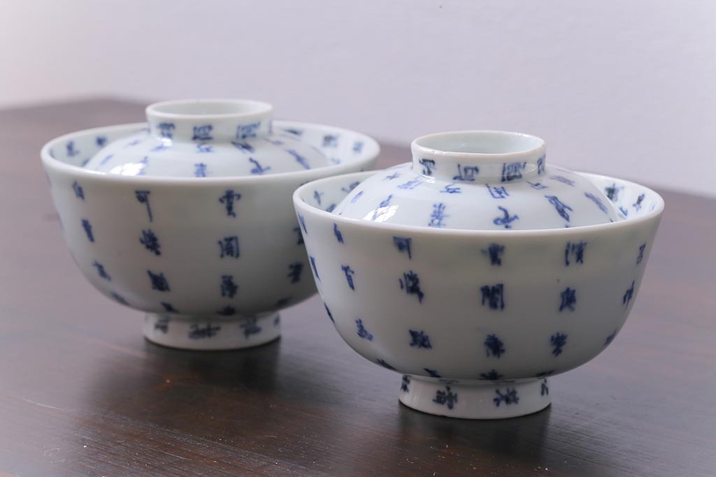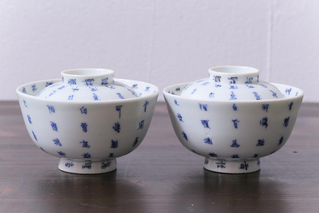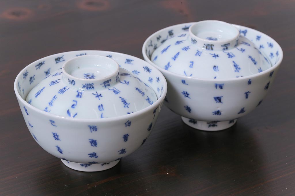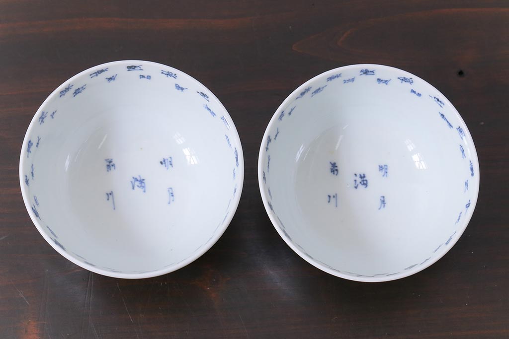 和製アンティーク 江戸期 「明月滿前川」 漢詩文字が書かれた蓋付茶碗(和食器)2客セット