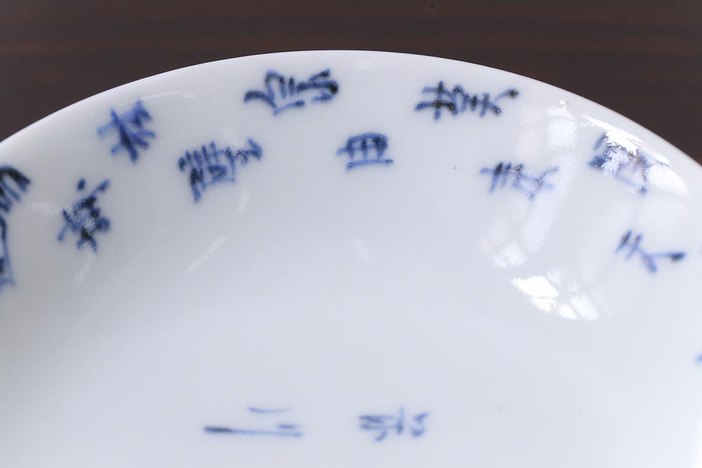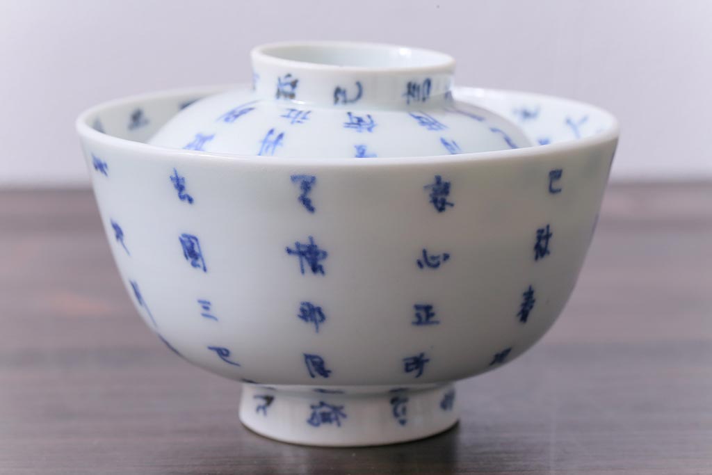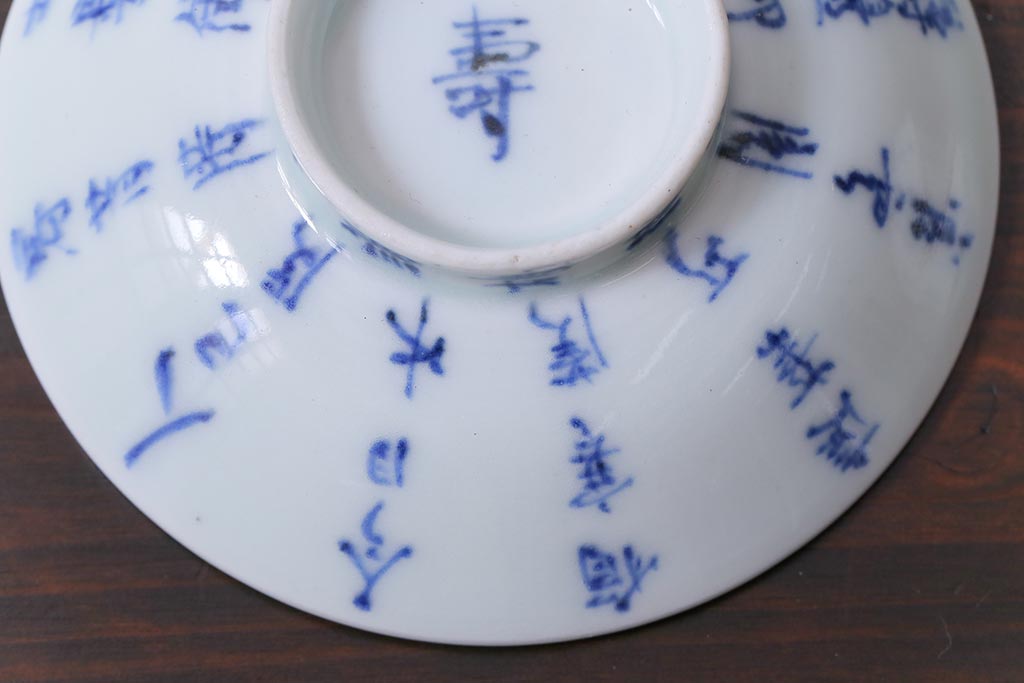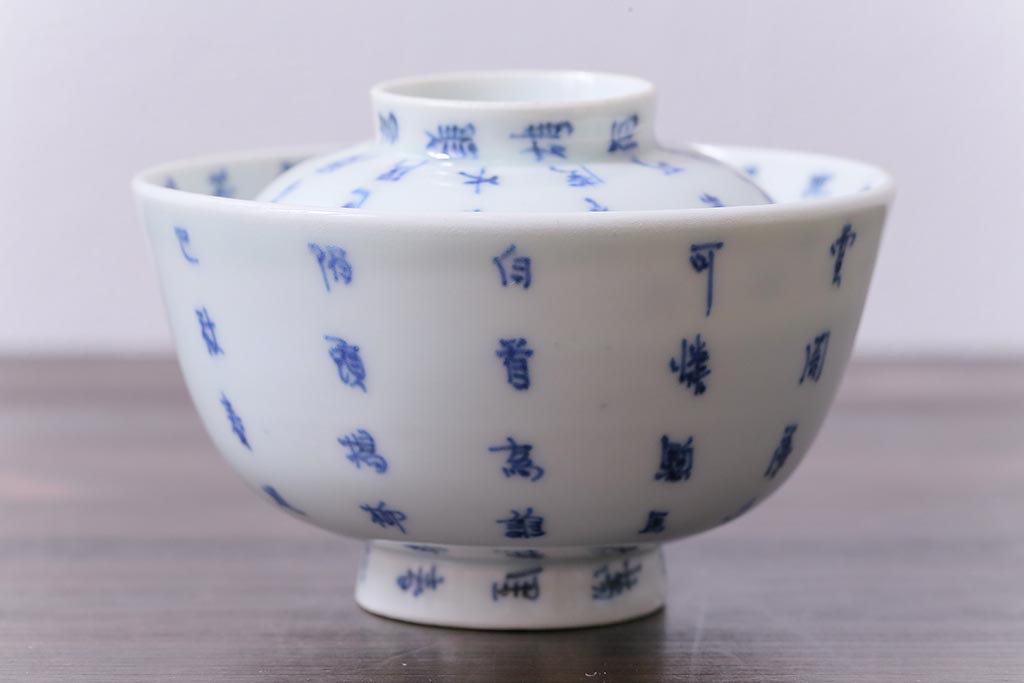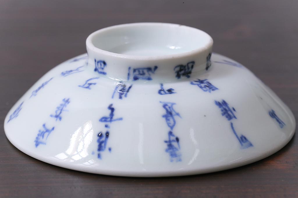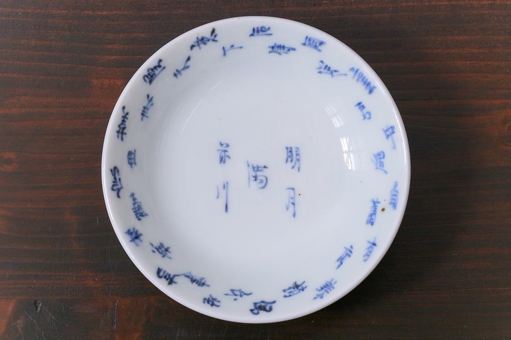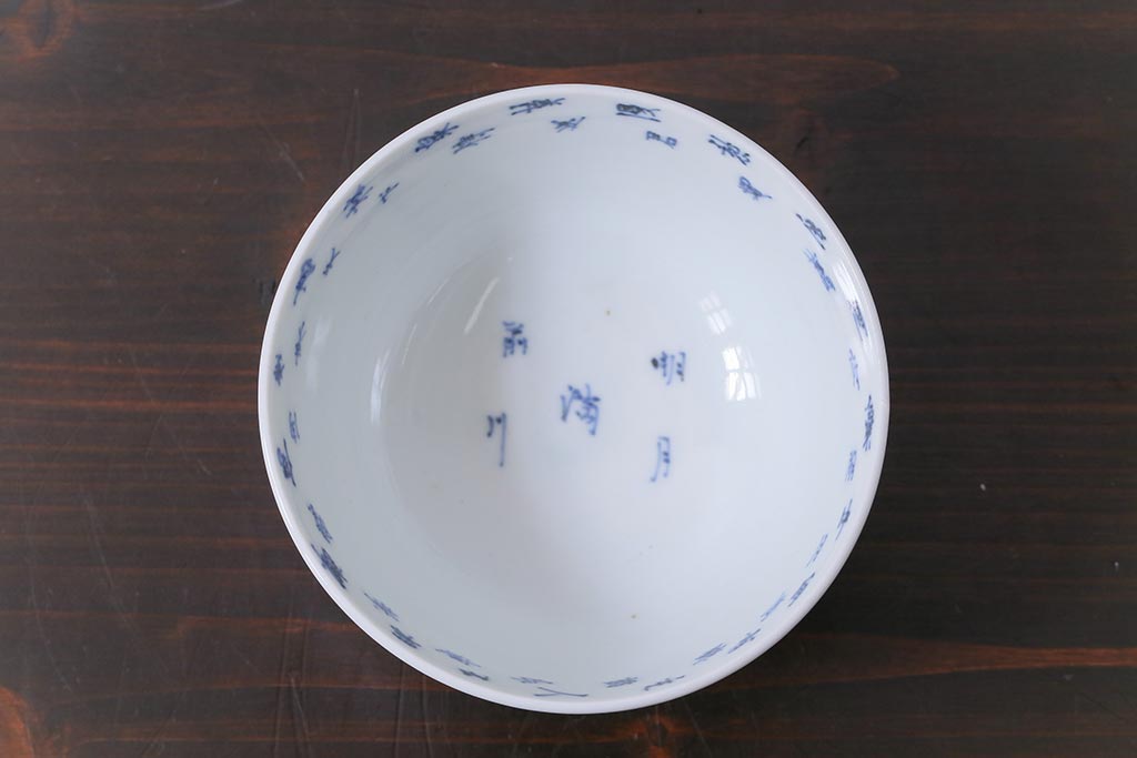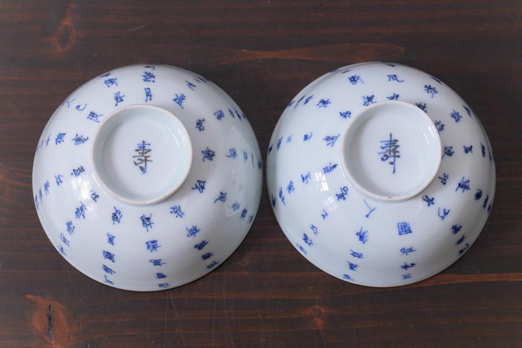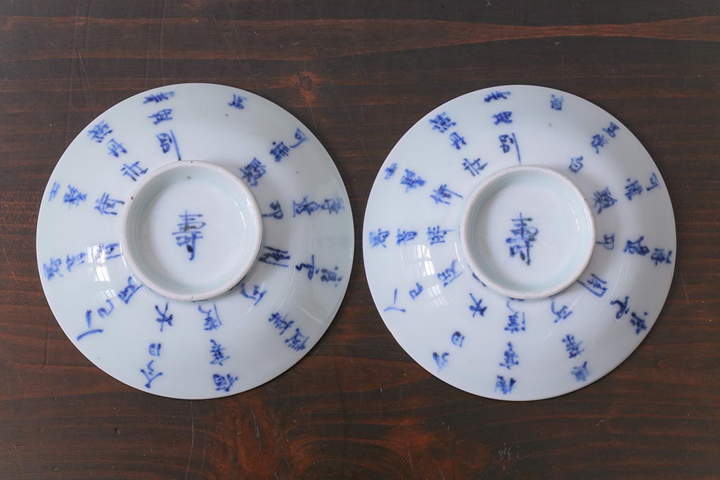 和製アンティーク 江戸期 「明月滿前川」 漢詩文字が書かれた蓋付茶碗(和食器)2客セット
