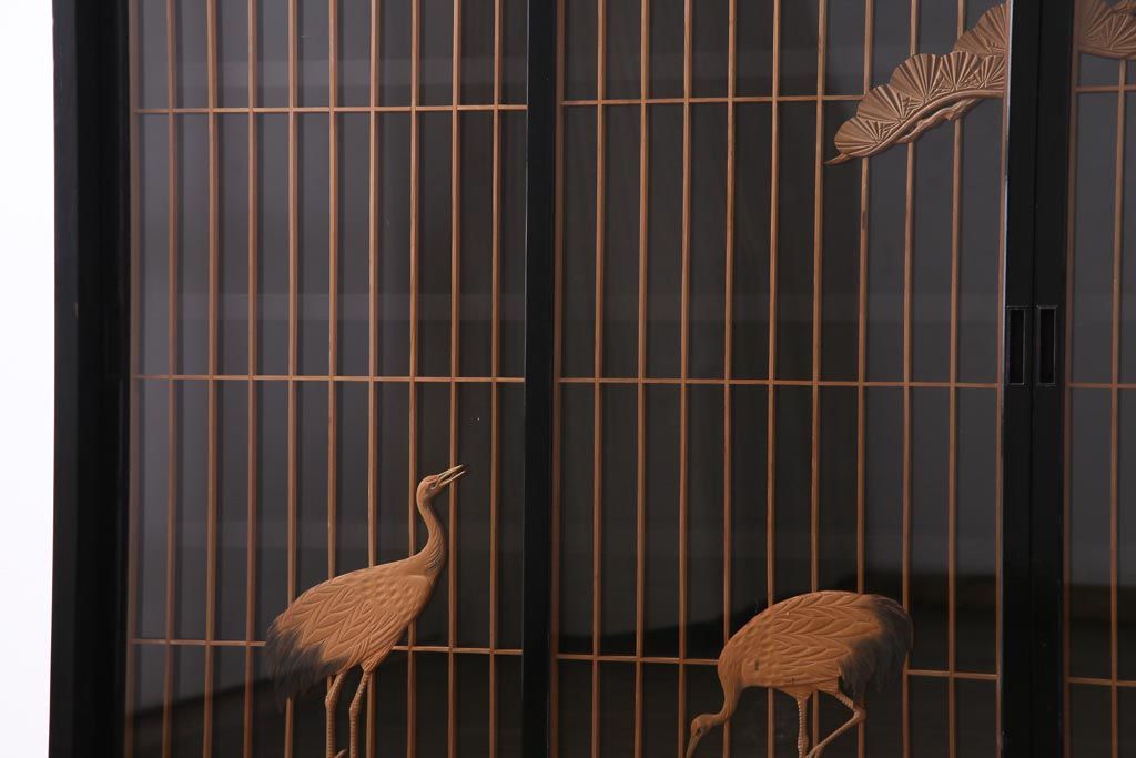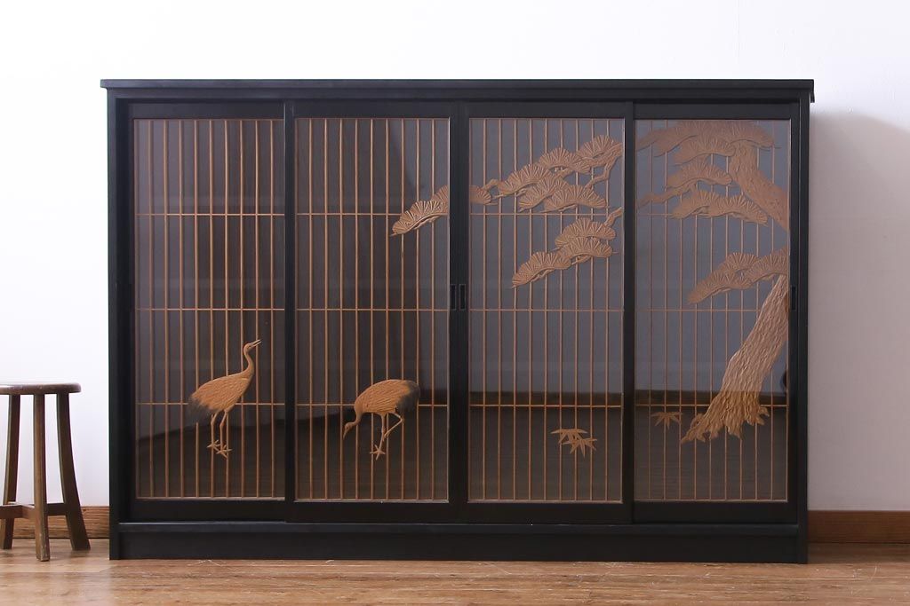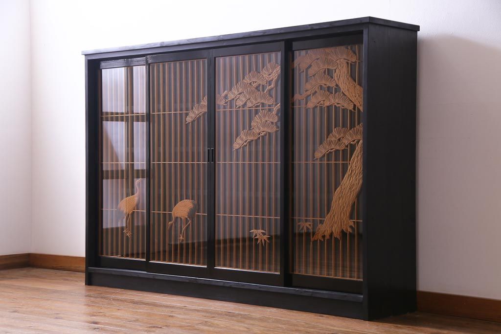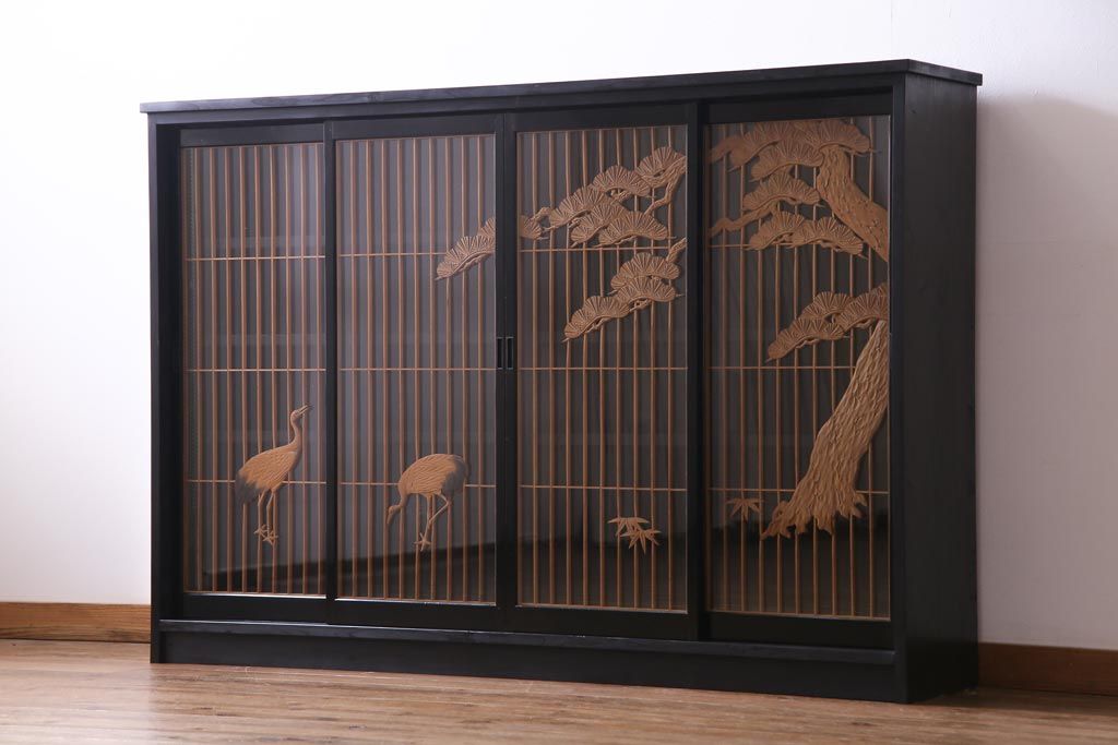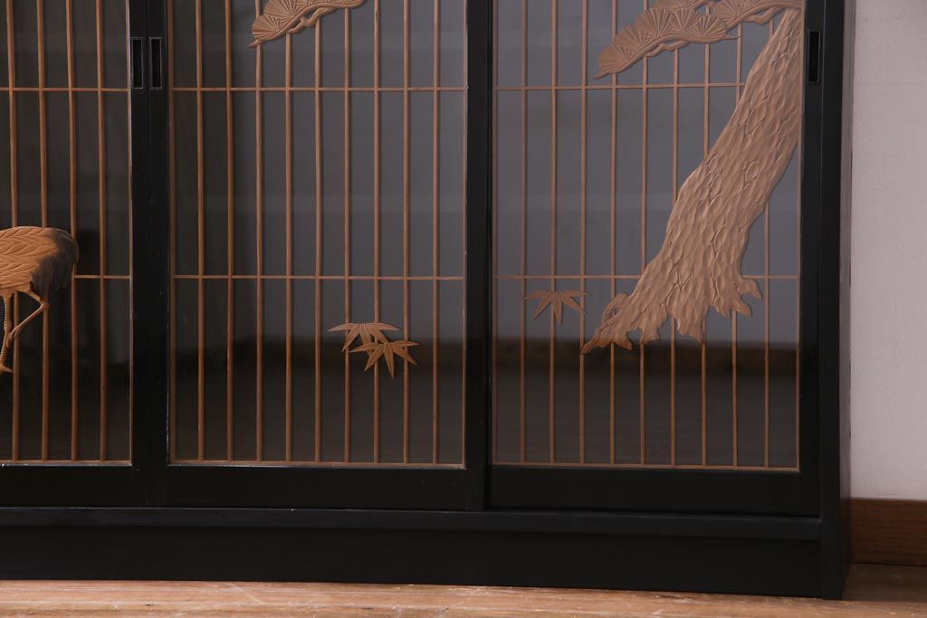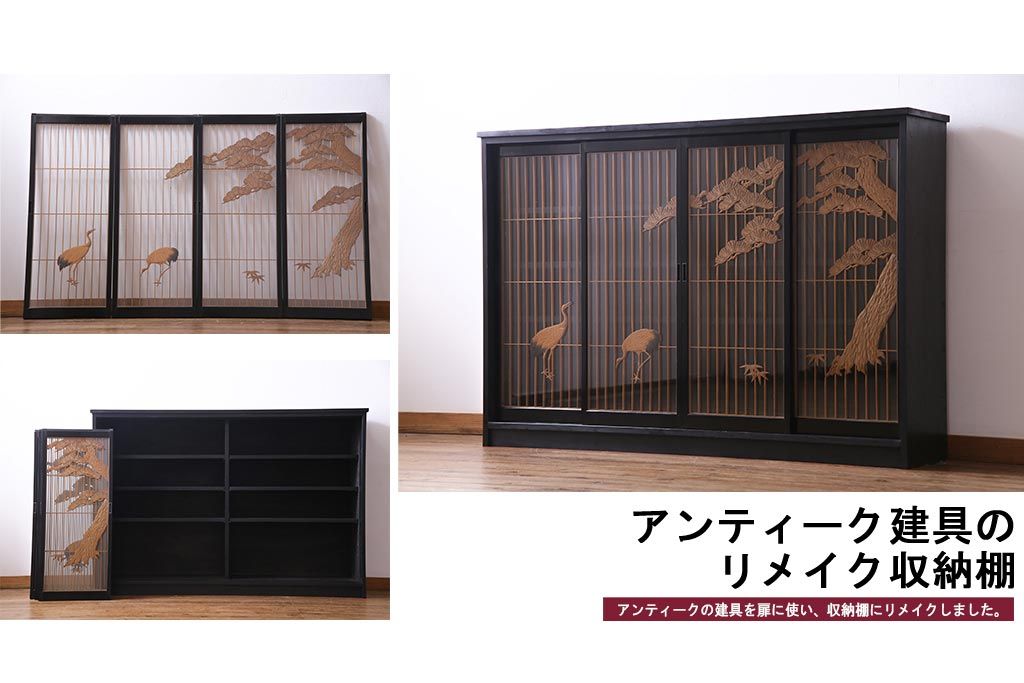ラフジュ工房オリジナル 古建具リメイク 鶴松の組子が縁起の良いガラス戸棚(書院、収納棚、サイドボード)です。