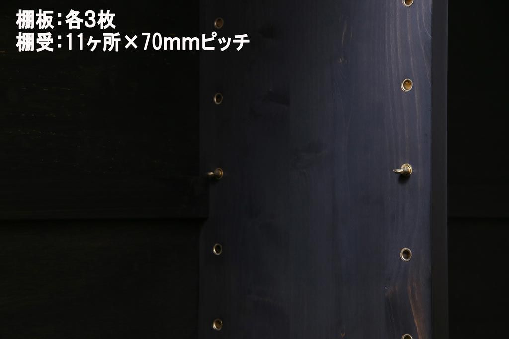 棚板は取り外しできます。棚板は各3枚あります。棚受け穴は11ヶ所、70mmピッチで調整できます。棚幅サイズのものが1枚の作りです。