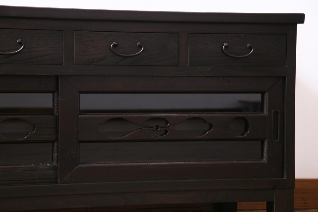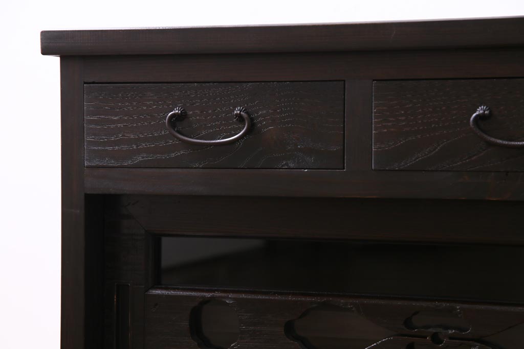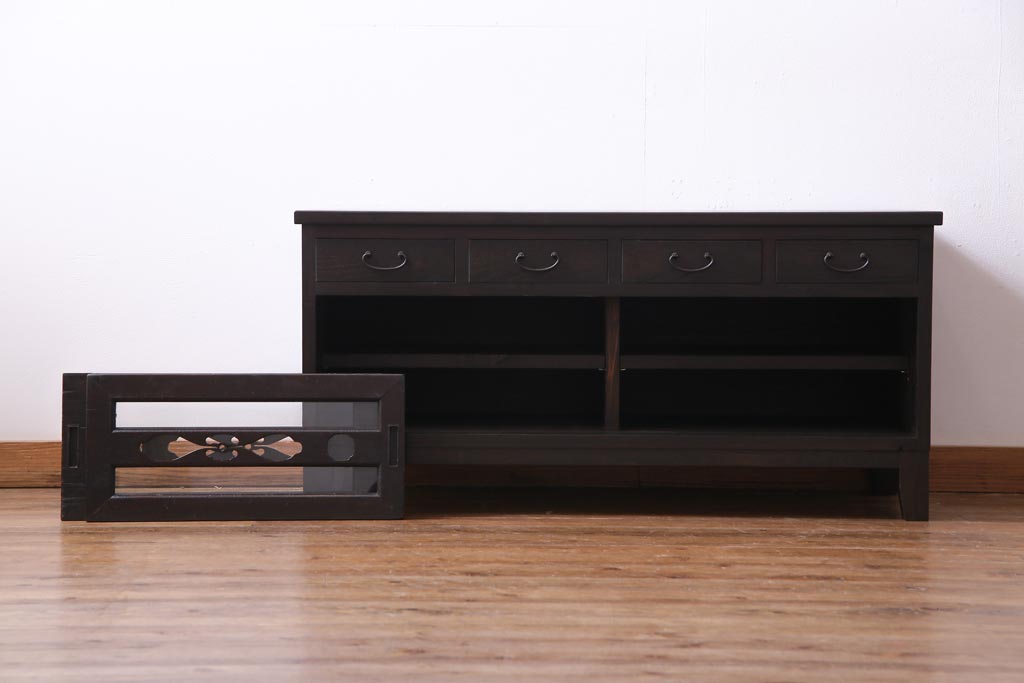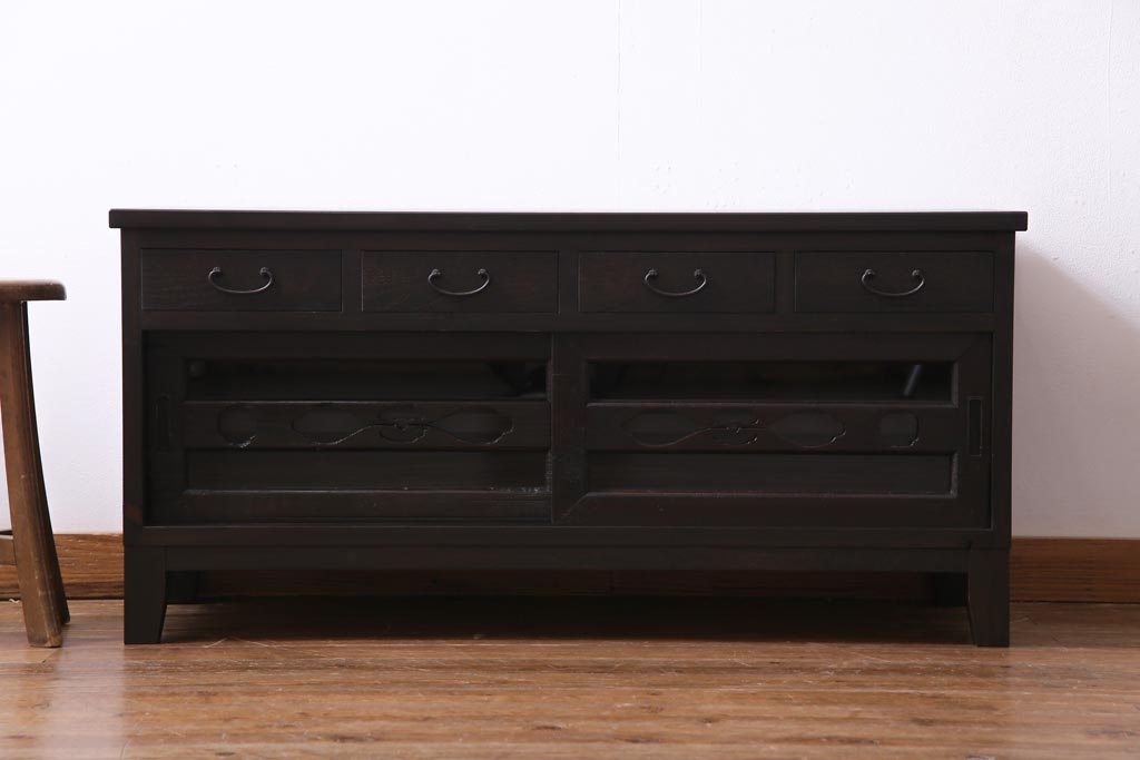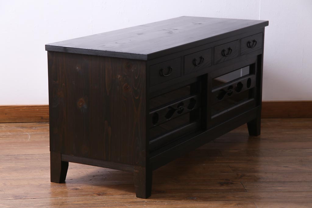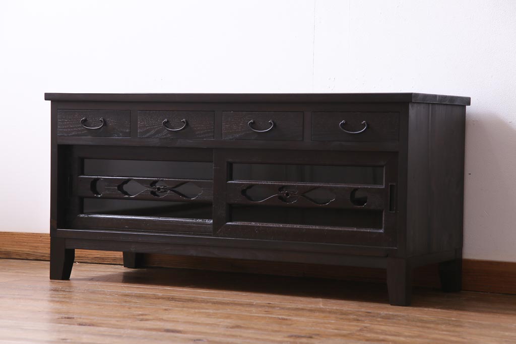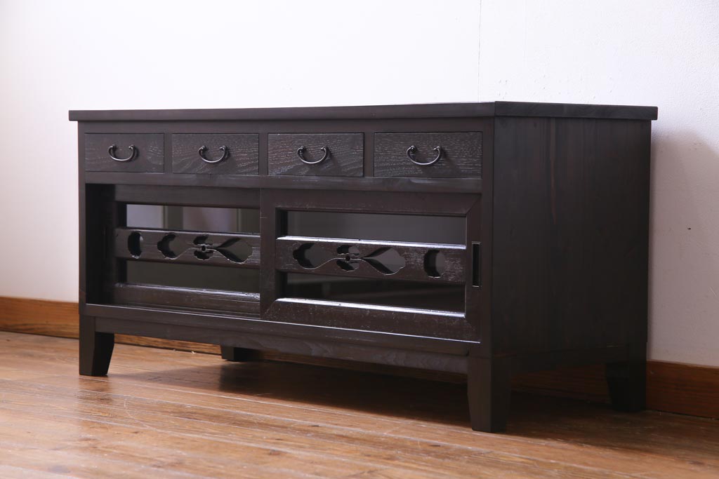 ラフジュ工房オリジナル 古建具リメイク 趣ある透かし彫りが和の風情感じる引き出し付きローボード(戸棚、収納棚、テレビボード)です。