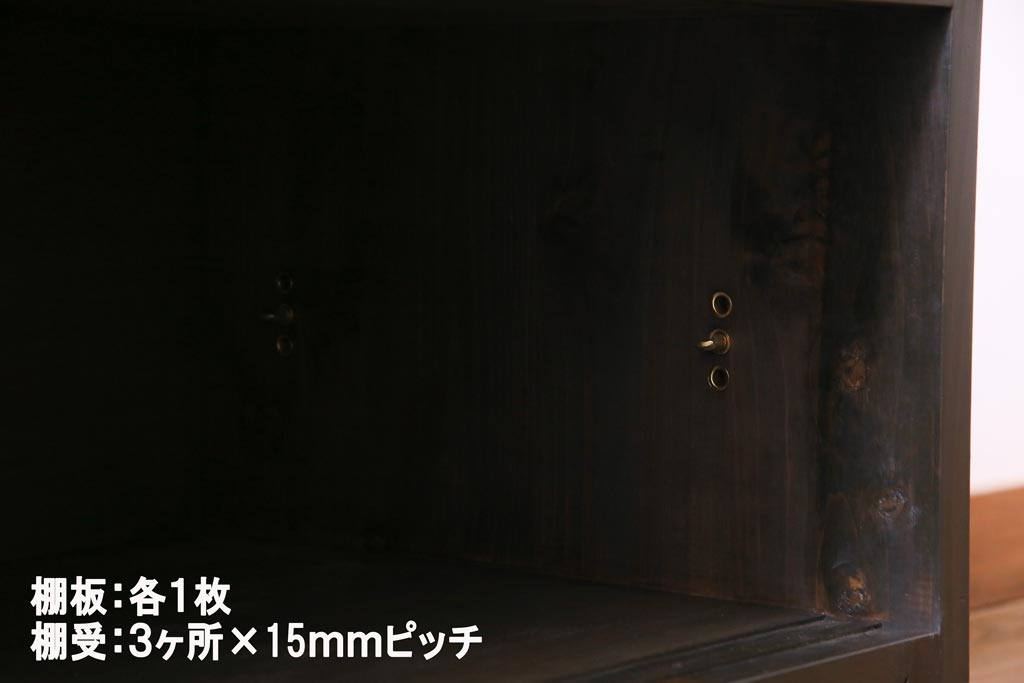 棚板は取り外しできます。棚板は各1枚あります。棚受けは3ヶ所、15mmピッチで調整できます。棚幅サイズのものが1枚の作りです。