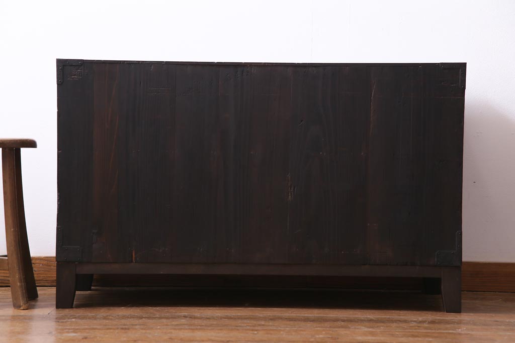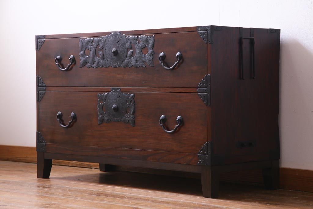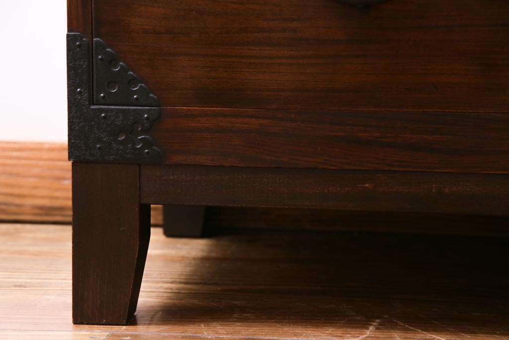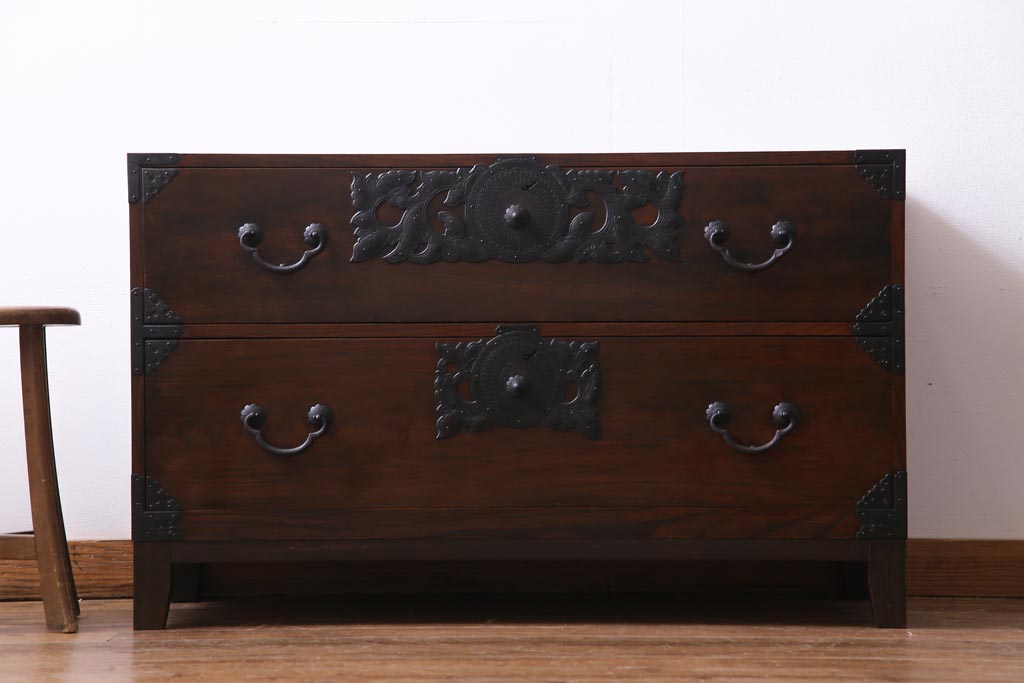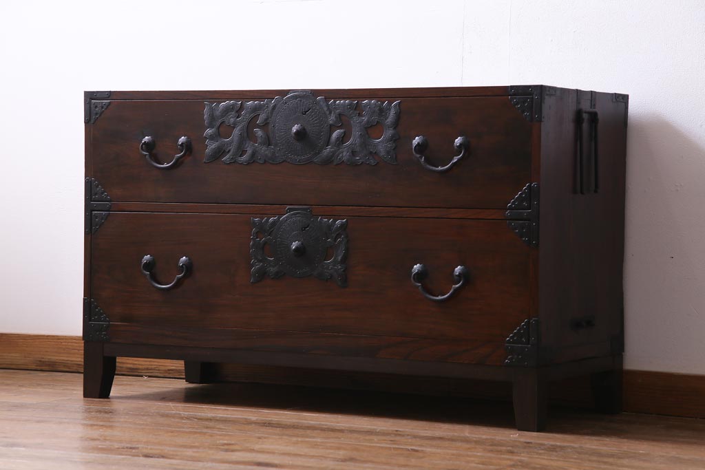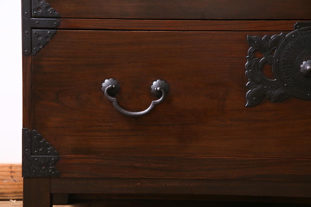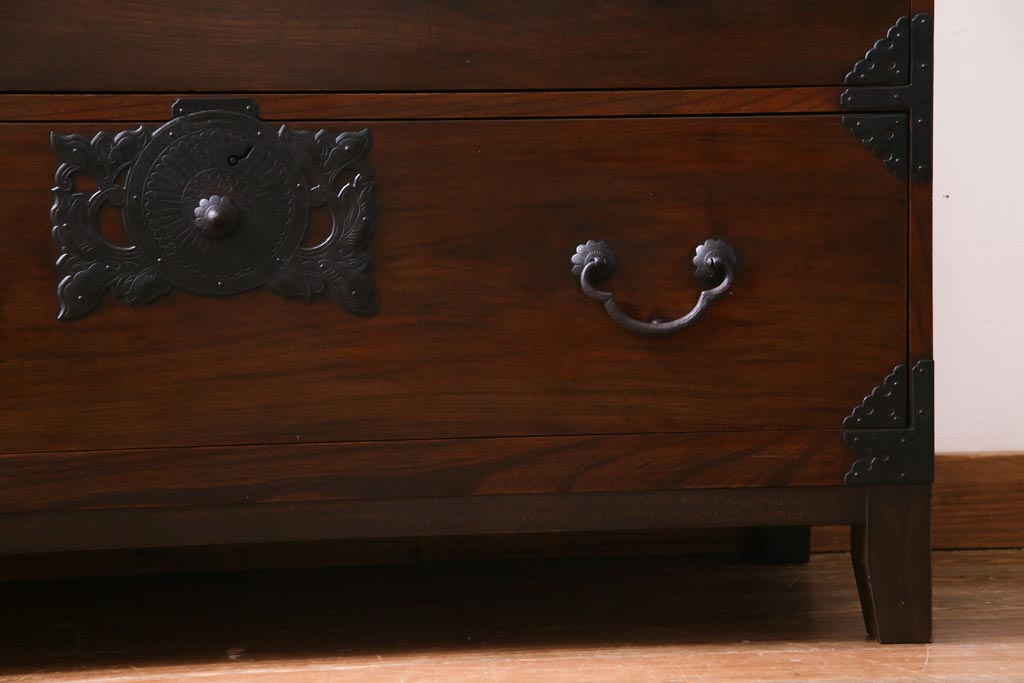 アンティーク家具 和製アンティーク 前面・供縁ケヤキ材 上品な印象あたえる脚付き仙台箪笥ローボード(衣装箪笥、引き出し、チェスト)
