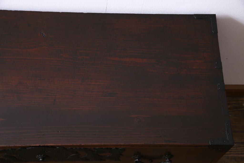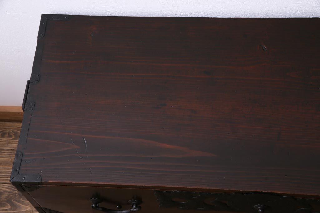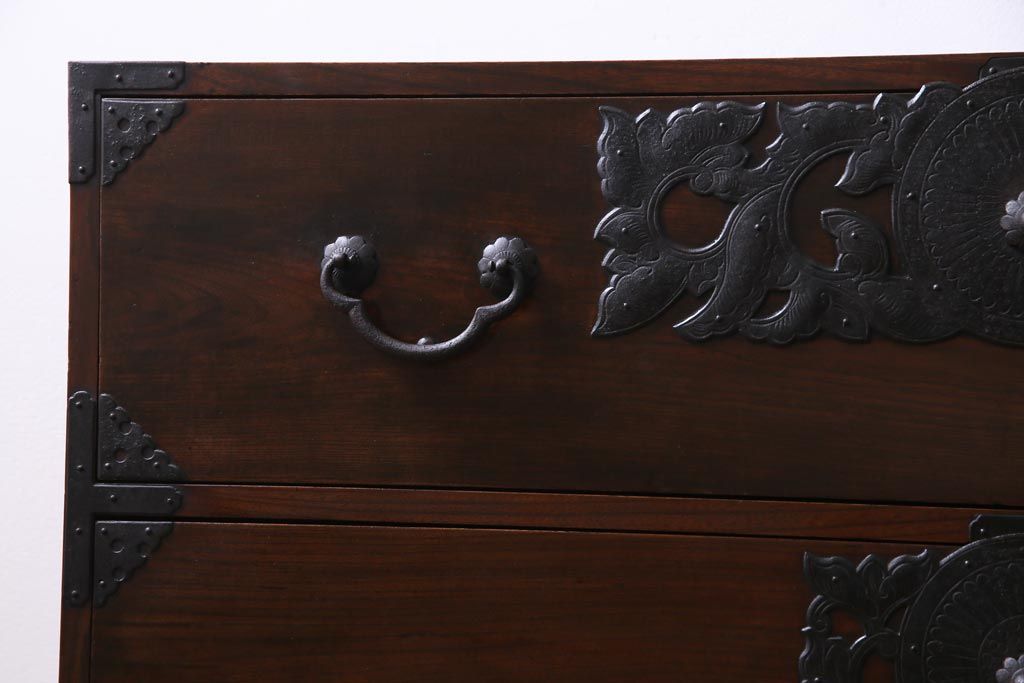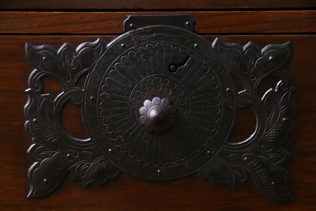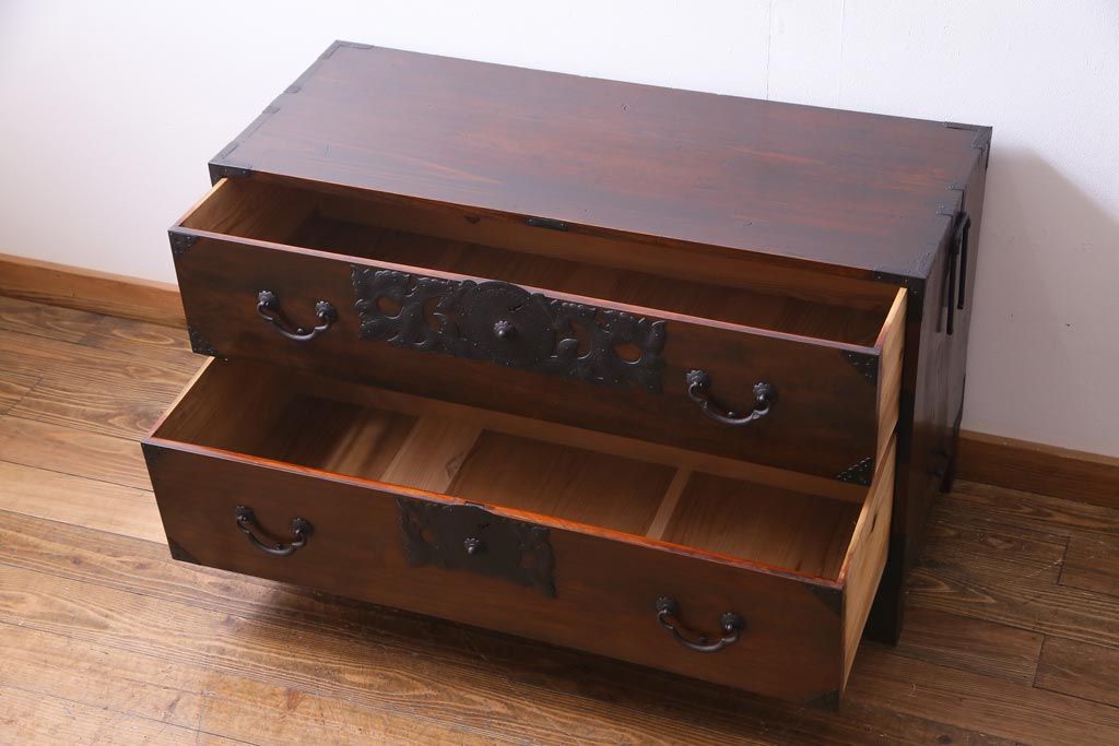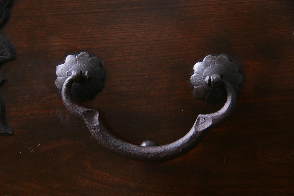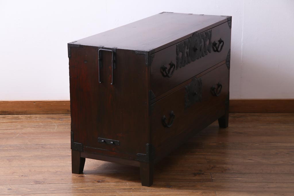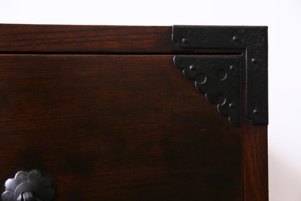 アンティーク家具 和製アンティーク 前面・供縁ケヤキ材 上品な印象あたえる脚付き仙台箪笥ローボード(衣装箪笥、引き出し、チェスト)