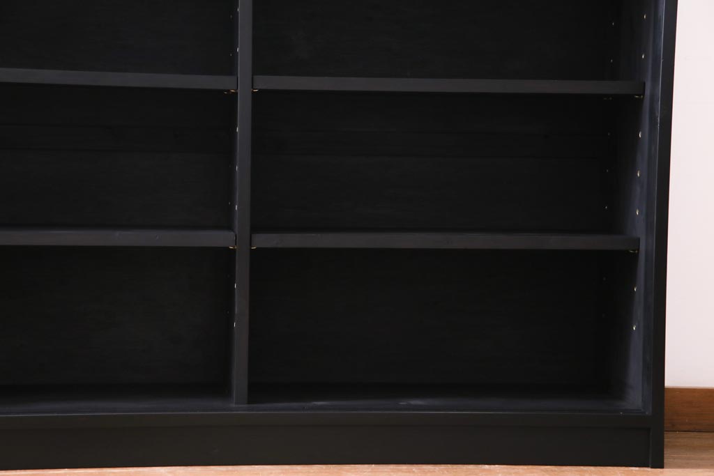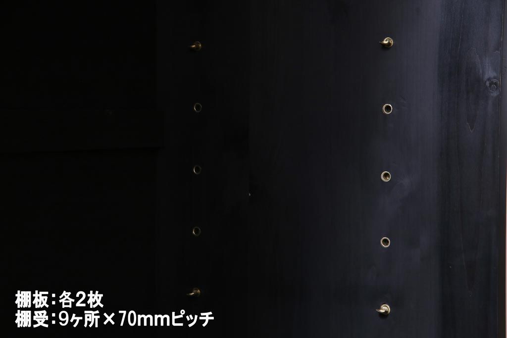 棚板は取り外しできます。棚板は各2枚あります。棚受けは9ヶ所、70mmピッチで調整できます。棚幅サイズのものが1枚の作りです。