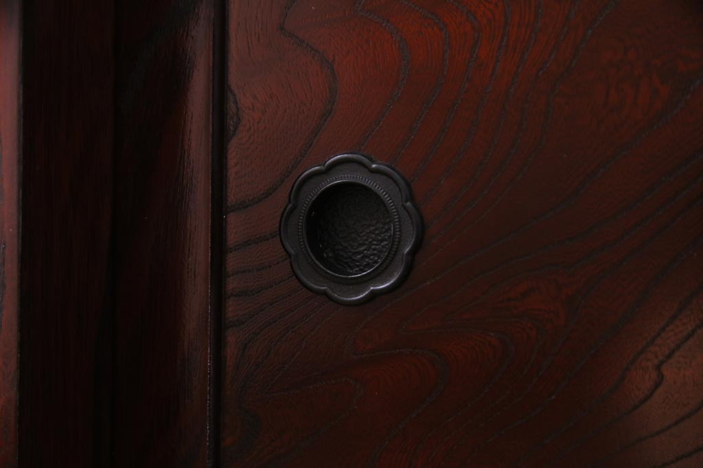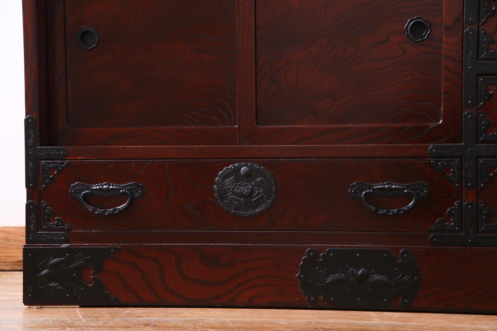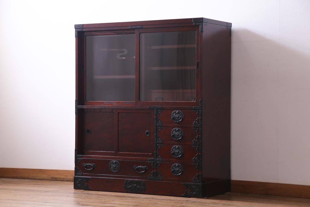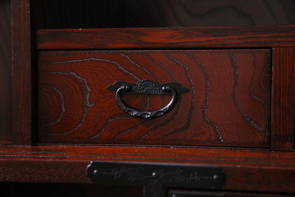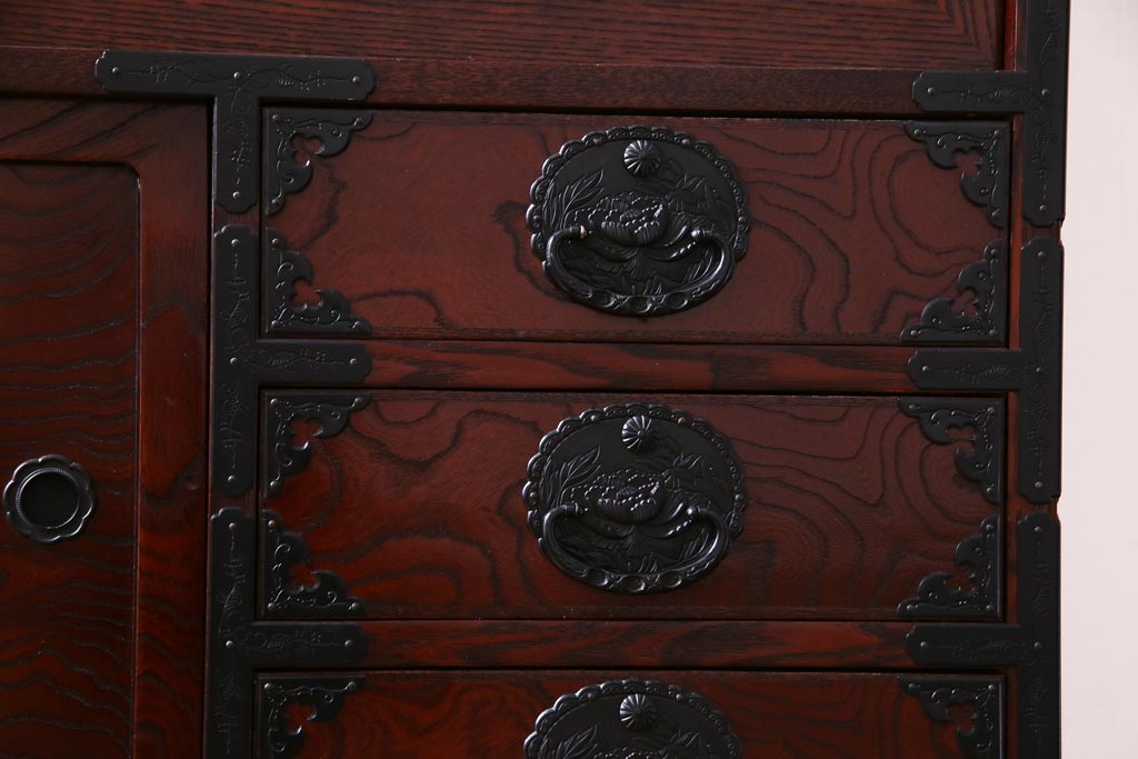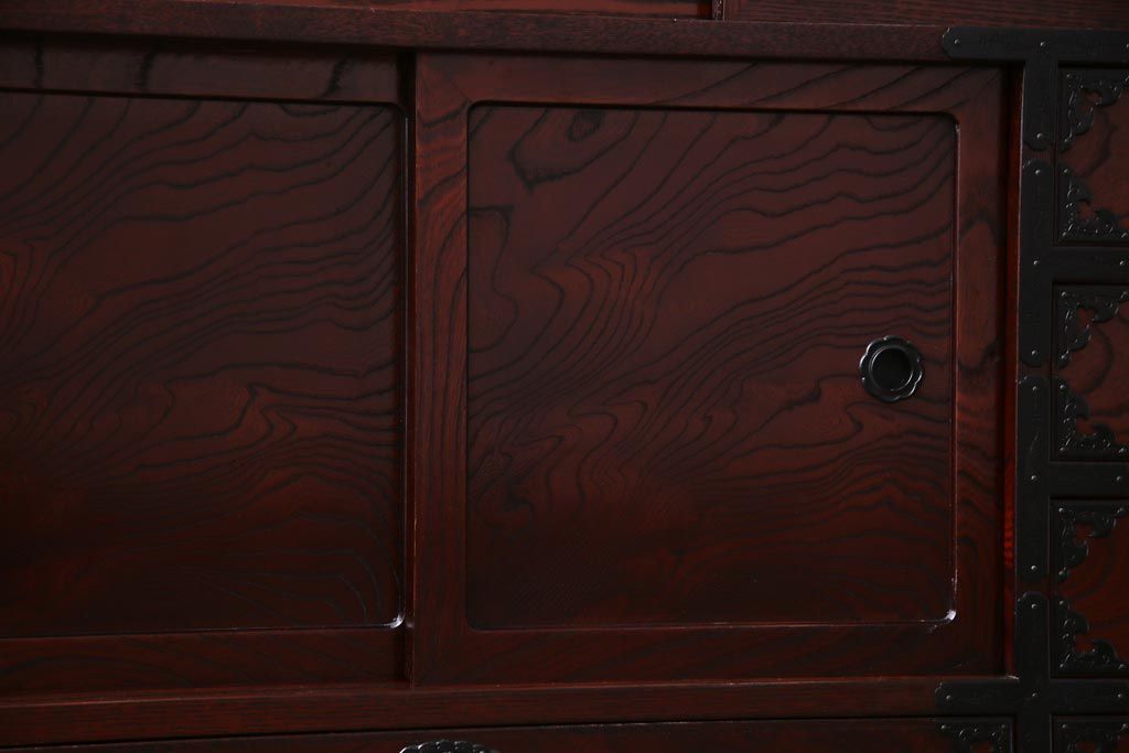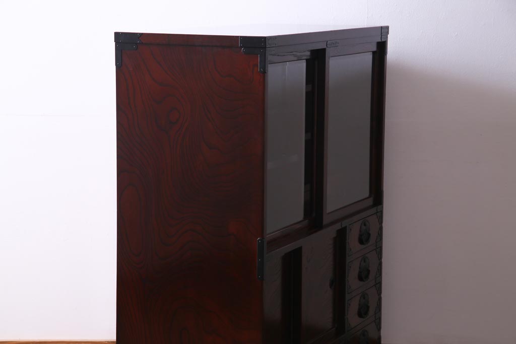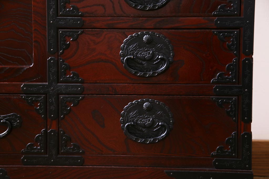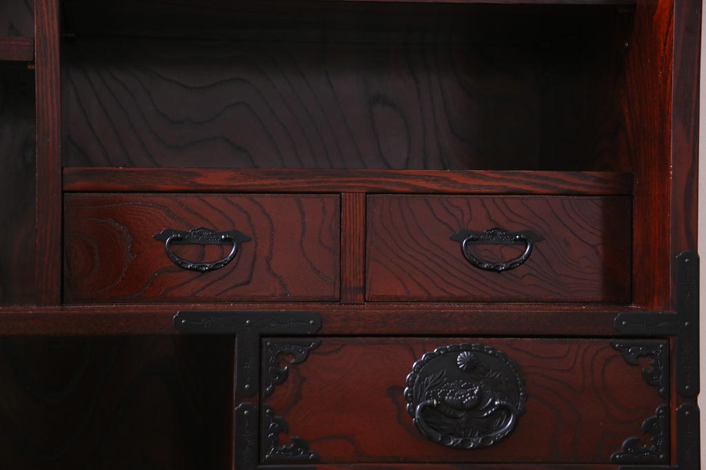ラフジュ工房> 和箪笥 > 中古 仙台民芸箪笥(仙台箪笥) 欅産業 拭き漆塗り 華やかな金具の茶箪笥(茶棚、飾り棚)